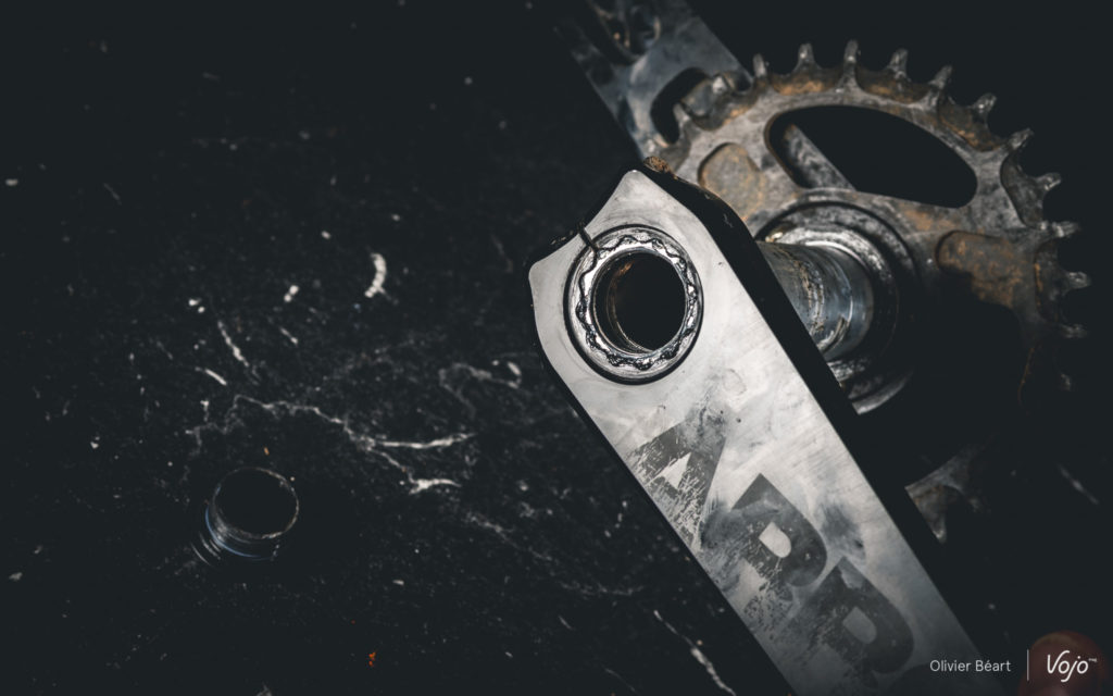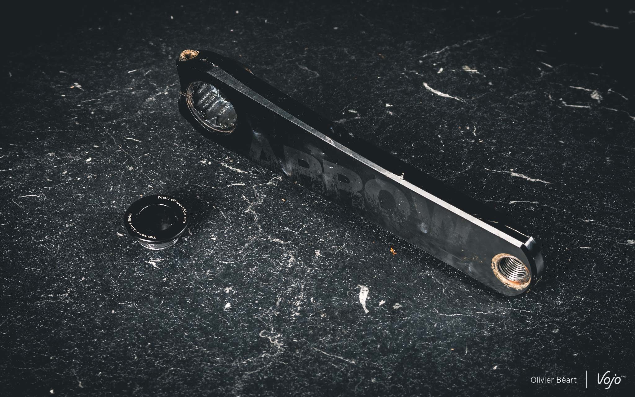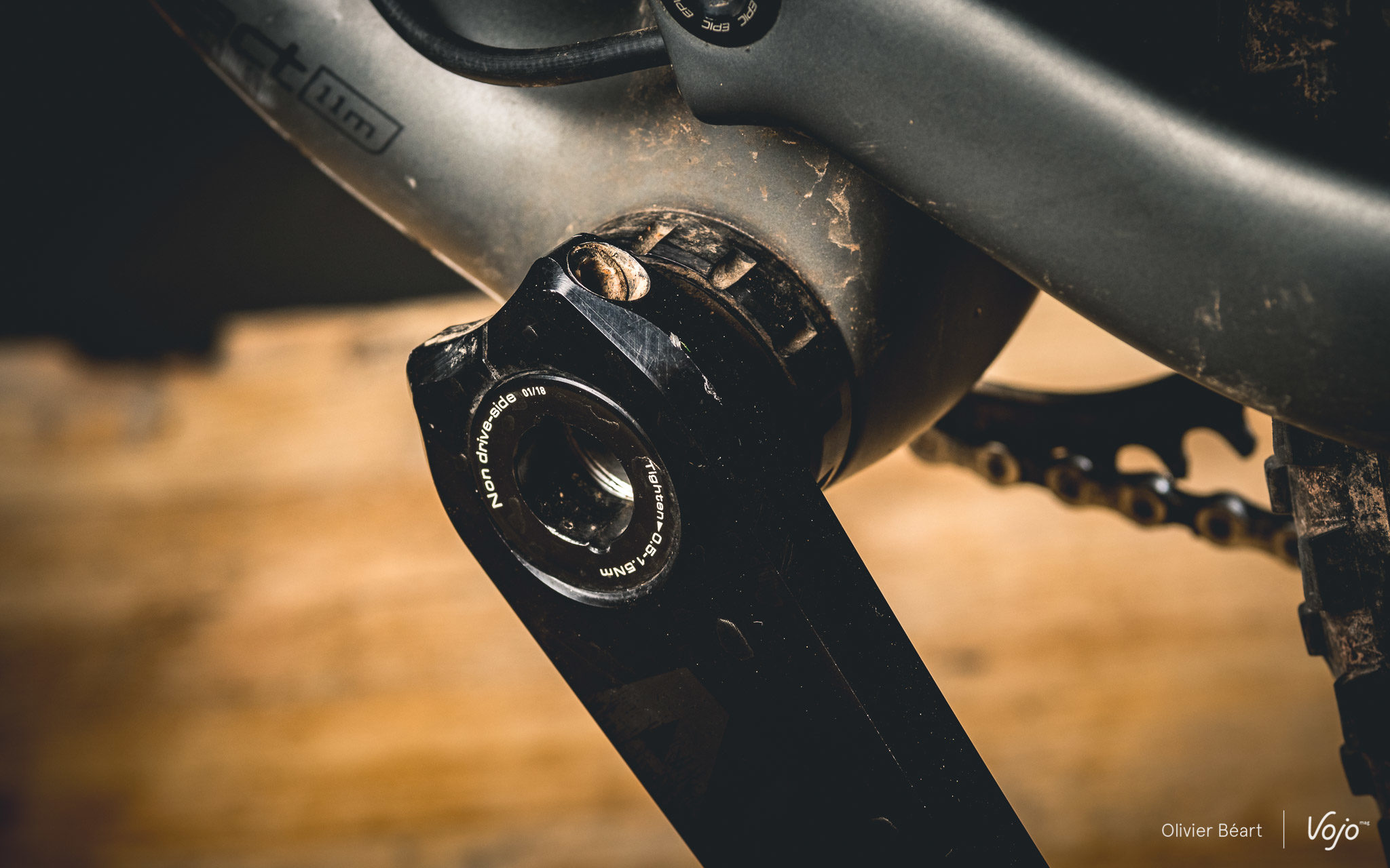 L’axe est solidaire de la manivelle droite (il existe en plusieurs longueurs pour s’adapter à la morphologie du cycliste (Q-Factor) et il est en réalité démontable en cas de besoin, mais plutôt en usine), et il est en diamètre 30mm. La connexion avec la manivelle gauche se fait via une interface cannelée, avec un écrou de mise en compression et un second qui assure le serrage, un peu à la manière de ce qu’on rencontre chez Shimano.