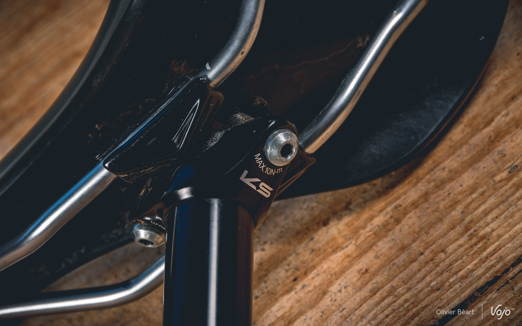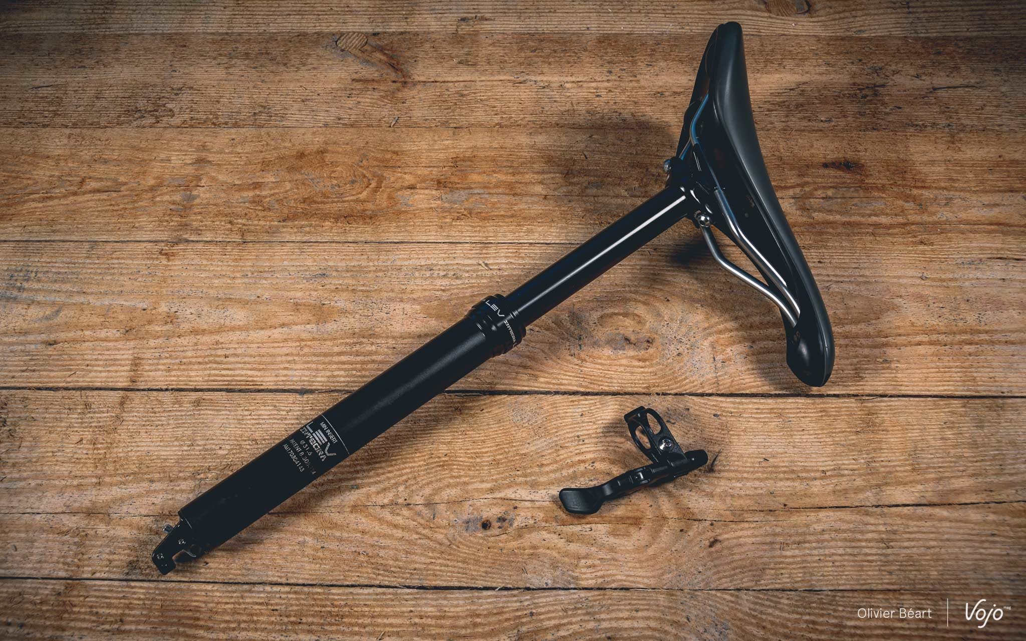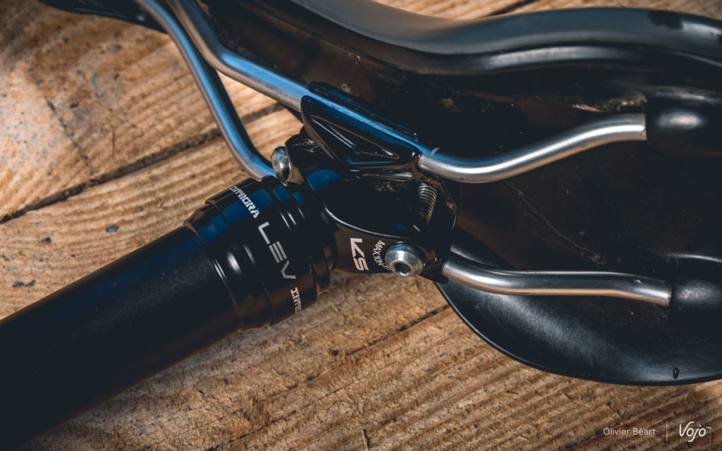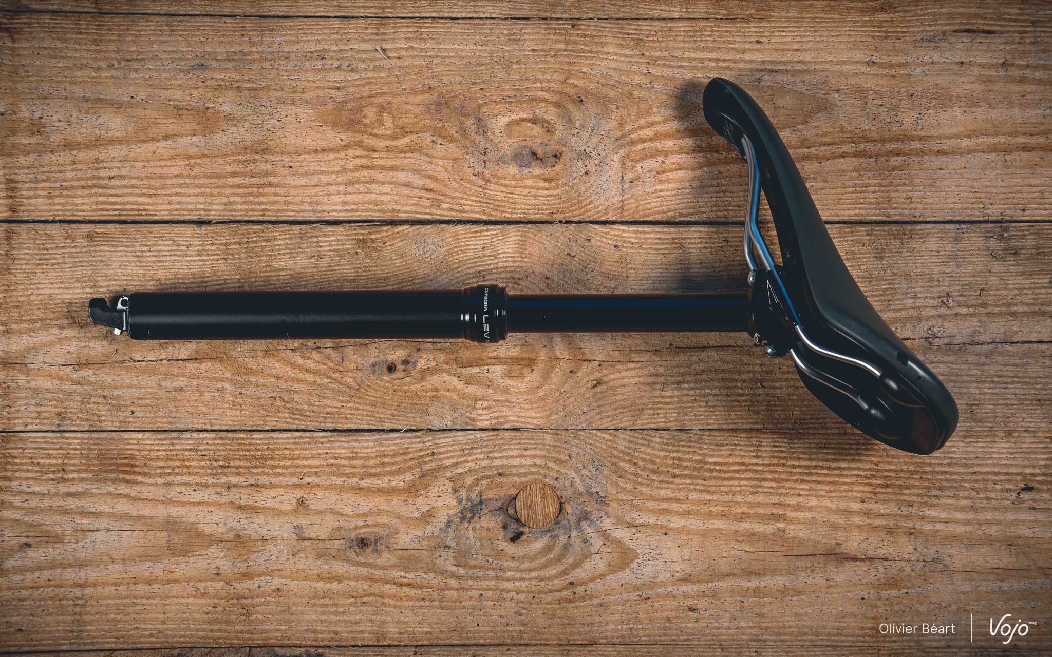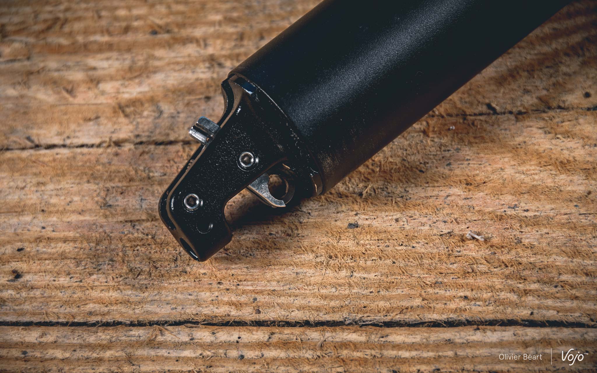 Le montage est facile, tant pour la selle que la commande, avec un système d’accroche du câble très simple sous la tige. Le mécanisme comporte un petit crochet dans lequel vient se glisser un petit cylindre qui se fixe sur l’extrémité du câble. Cela ressemble comme deux gouttes d’eau à la Fox Transfer, avec un petit avantage puisqu’on dispose ici d’un cache plastique qui permet d’éviter l’oxydation ou la présence de saletés.