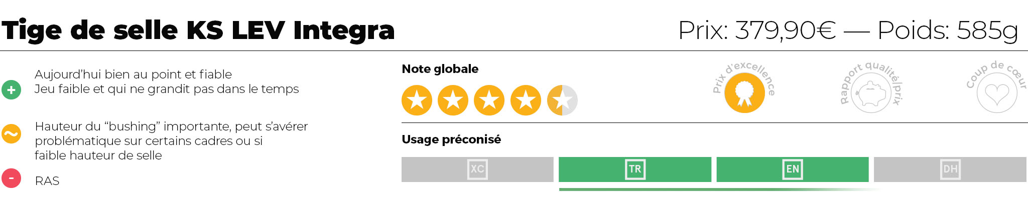 Avec ce test, c’est ce que nous avons voulu confirmer… ou infirmer. Nous avons donc roulé avec un exemplaire de test en 125mm livré par la marque et qui a été utilisé pendant un an sur deux vélos différents, ainsi que sur plusieurs modèles qui équipaient des vélos de test qui sont passés entre nos mains au fil de la saison. C’est l’occasion de rappeler aussi que KS dispose d’une foule de références qui lui permettent d’être compatible avec quasiment tous les cadres du marché (diamètres 27,2 à 34,9mm, débattement de 80 à 175mm, etc). Les prix vont de 379 à 409€, soit dans la moyenne des tiges de selle haut de gamme du marché. Niveau poids, avec 585g sur notre balance, elle est aussi dans la moyenne. Une version carbone existe et permet de gagner entre 50 et 100g selon les versions.