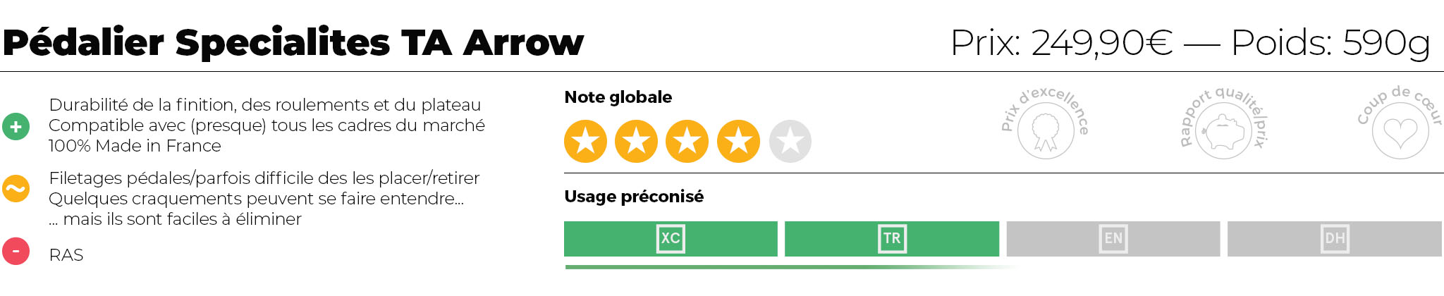 Specialites TA n’a pas manqué sont retour dans l’univers des pédaliers. L’Arrow est un produit bien pensé, fonctionnel et proposé à un tarif juste quand on garde à l’esprit qu’on a entre les mains du 100% made in France. Il se démarque aussi par sa durabilité, tant pour l’aspect résistance à l’usure que pour le fait que sa compatibilité avec presque tous les cadres du marché augmente fortement la probabilité de pouvoir le conserver même en cas de changement de monture.