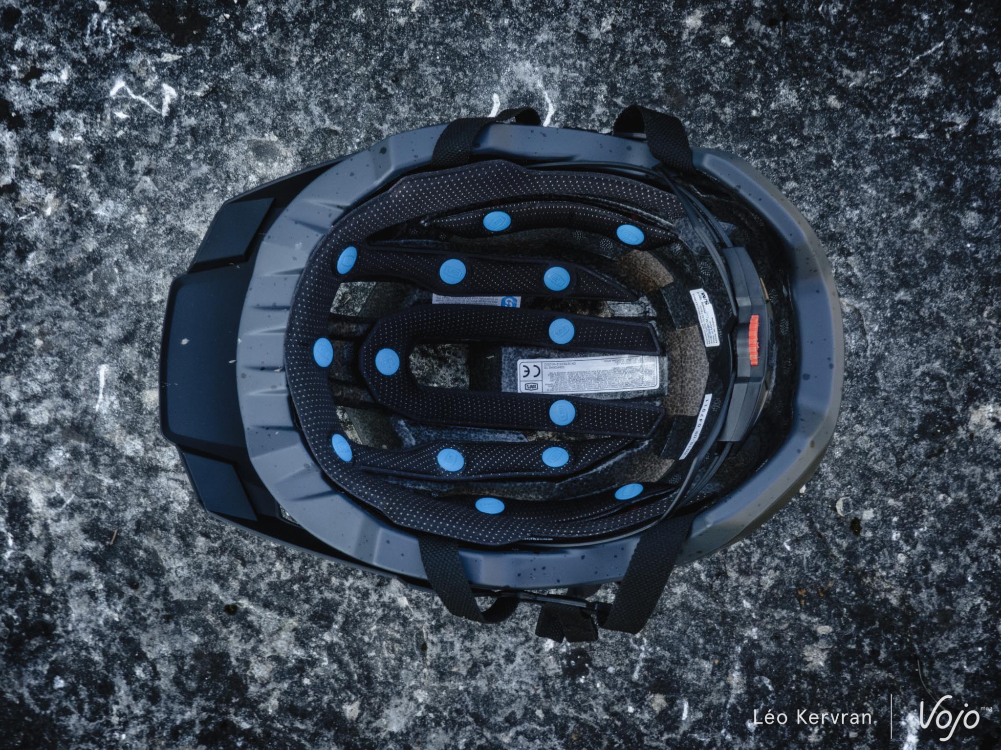 L’un des points-clés de ce 100 % Altec, c’est son système d’absorption des accélérations en rotation Smartshock. Le principe est similaire au célèbre MIPS ou aux pads Spin de Poc (voir notre article sur les nouvelles technologies des casques, c’est-à-dire permettre à une partie du casque de bouger légèrement autour de la tête sans transmettre son mouvement à cette dernière, mais la technique utilisée est différente. Ici, le liner (les mousses) est fixé sur 14 petits « doubles sabliers » en élastomère qui peuvent s’écraser et se déformer dans toutes les directions. Ces sabliers sont collés sur la coque EPS et l’un d’eux s’est très vite décollé sur notre casque, au bout de quelques sorties seulement. Ça se recolle facilement mais c’est un peu dommage et on aimerait que 100 % réfléchisse à un système de fixation un peu plus fiable.