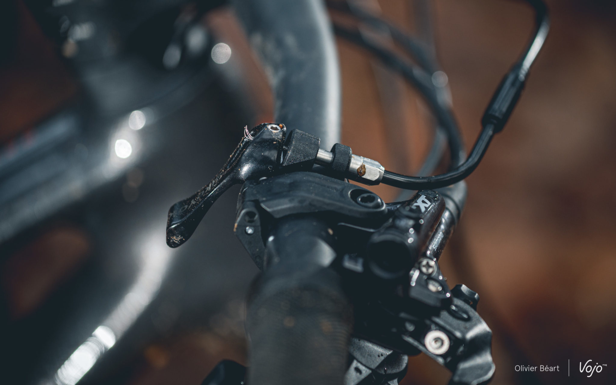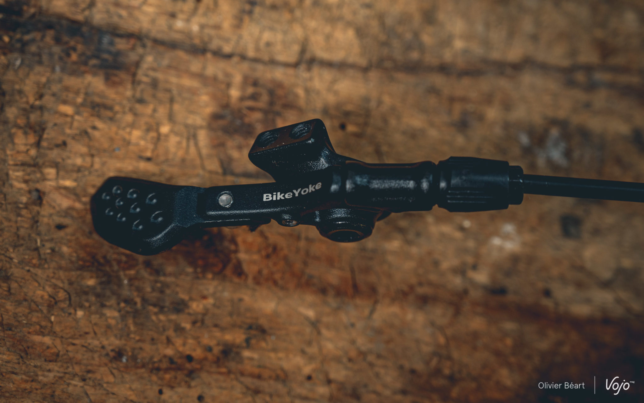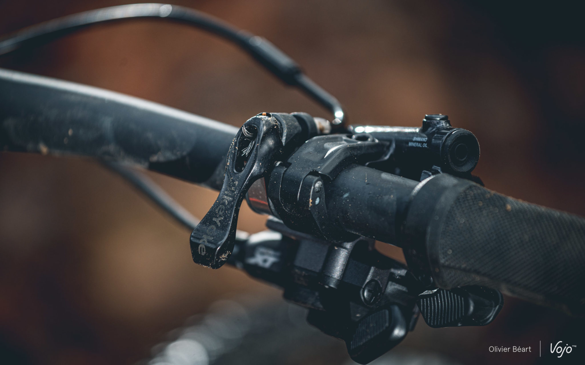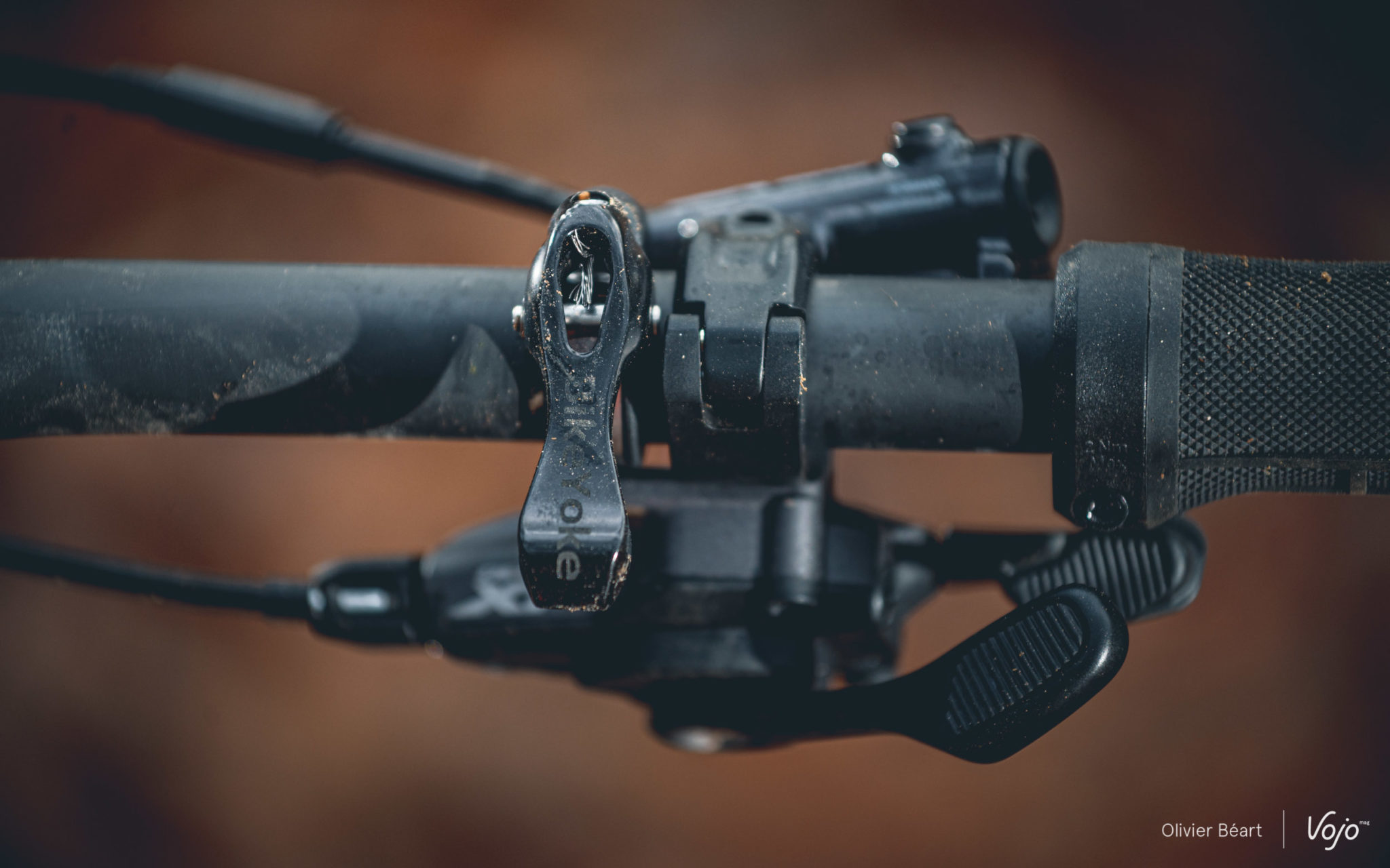 Cette deuxième commande nous a par contre moins convaincus. Son ergonomie est correcte, mais ne se différencie pas vraiment de la concurrence contrairement au modèle sous le cintre proposé par BikeYoke, et si son système de serrage qui sert aussi de passage de câble est astucieux, la sortie de petits filins de métal sur le haut de la commande peut s’avérer gênant, voire blessant. Nous aurions pu mettre une petite ferrure au bout, mais alors cela crée une excroissance pas très agréable.