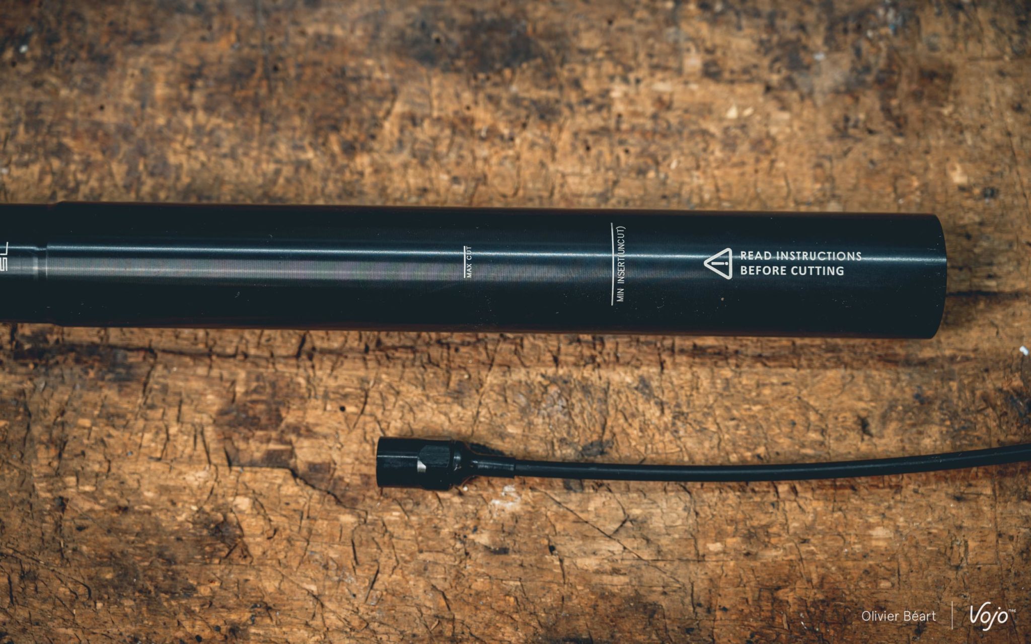 Le câble de la commande au guidon doit donc être inséré profondément dans la tige, mais grâce à un mécanisme bien pensé et à un petit outil/tube en plastique fourni avec la tige de selle, il est vraiment très facile de connecter/déconnecter les deux parties. A noter aussi qu’il faut installer une partie du mécanisme et un pas de vis sur le câble et la gaine, mais là aussi c’est très facile.