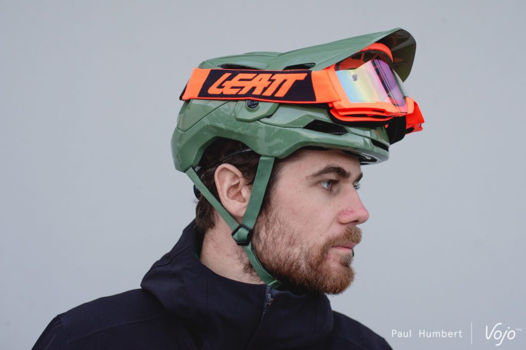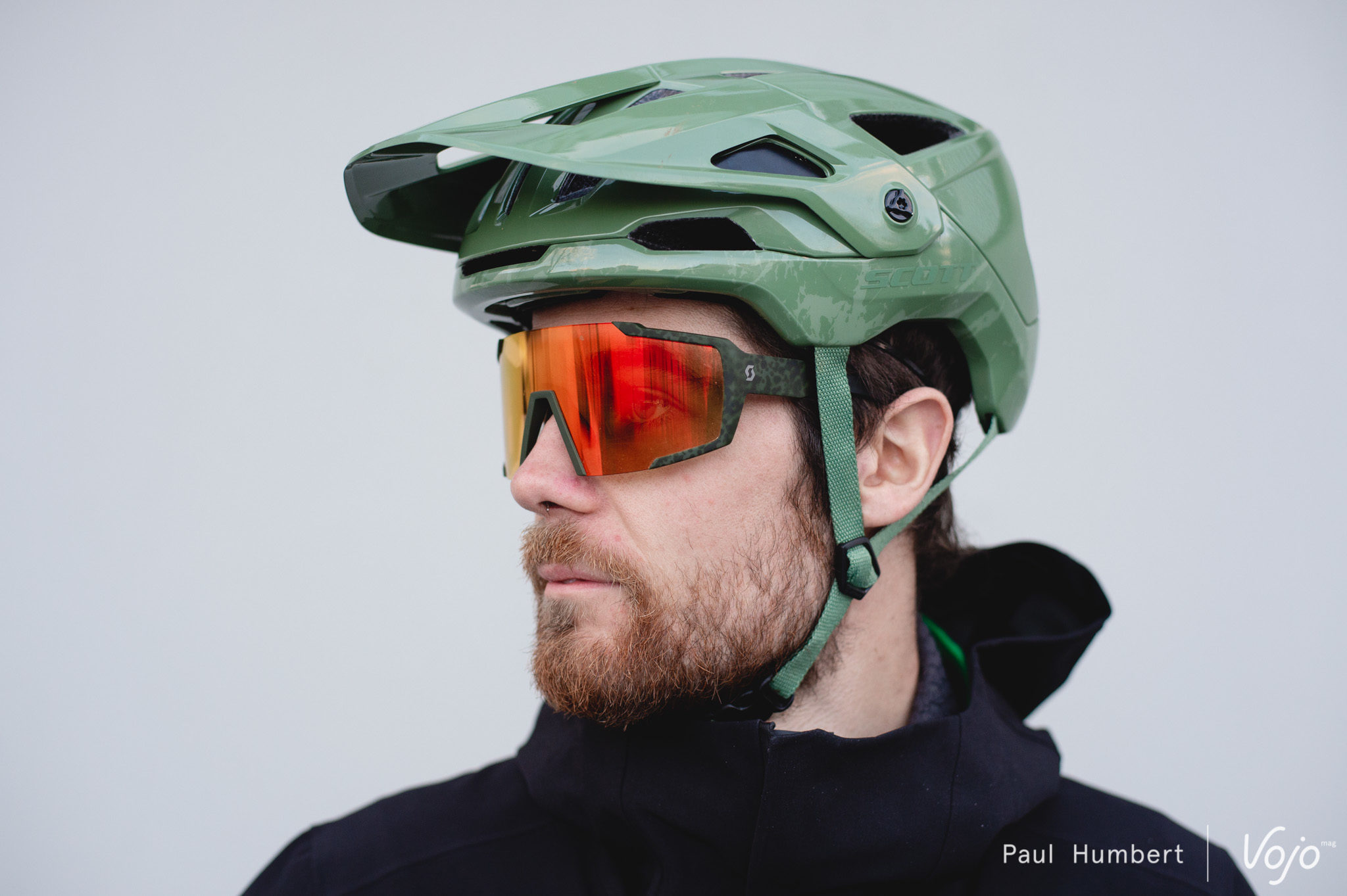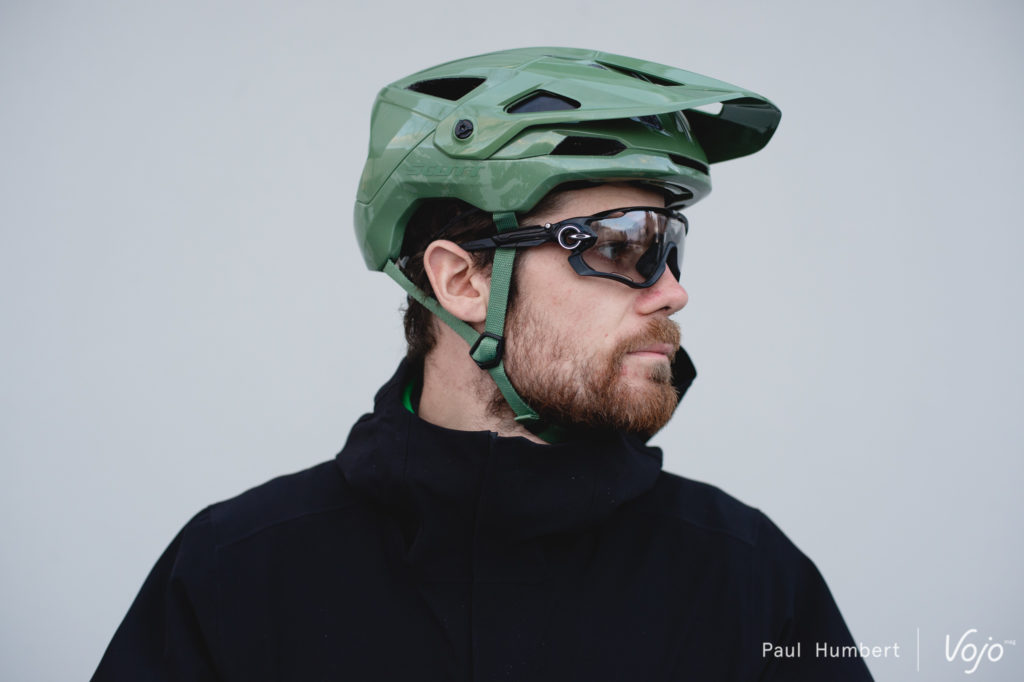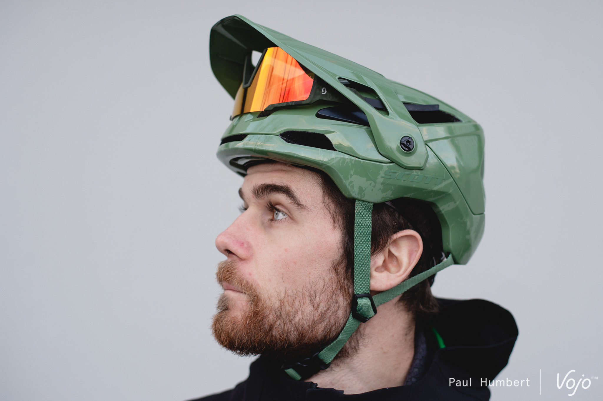 Le maintien d’un masque est excellent et il trouve bien sa place sous la visière en montée, l’espace est suffisant même pour les masques les plus volumineux. En revanche, nous regrettons que Scott n’ait pas pensé un peu plus aux porteurs de lunettes et n’ait pas intégré de rangement pour ces dernières. En pratique, la plupart des paires avec lesquelles nous avons essayé le casque tiennent bien lorsqu’on les coincent sous la visière ou en les glissant à l’arrière du casque, mais c’est tout de même une fausse note. On peut l’accepter sur un casque plus accessible, mais sur ce modèle haut de gamme cela fait tache, surtout par rapport à la concurrence qui propose généralement cette fonctionnalité.