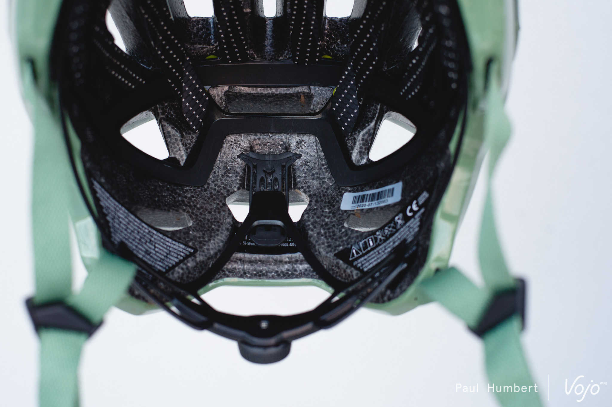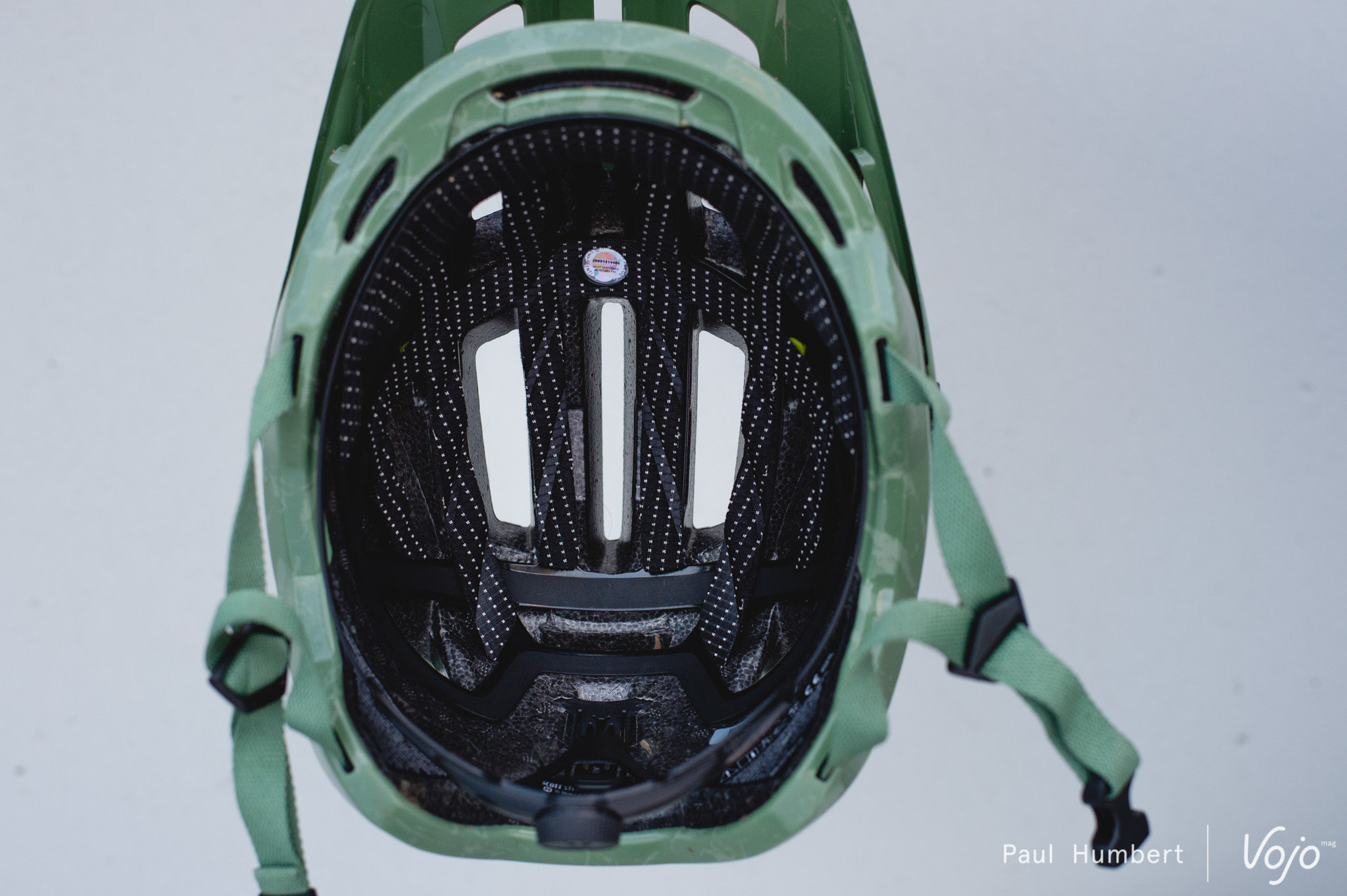 A l’intérieur, l’habituelle structure en mousse EPS est complétée par deux empiècements en polyuréthane (PU) au-dessus des tempes censés améliorer l’absorption des chocs de faible et moyenne intensité. Dans le même souci d’augmenter le niveau de protection, la forme est plus couvrante sur les côtés et l’arrière de la tête que la plupart des casques de la marque.