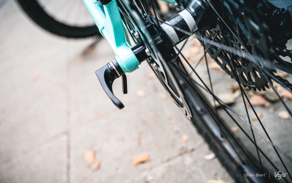 Si on a un cadre compatible c’est très sympa et on apprécie bien d’avoir ce petit accessoire avec soi. L’adaptateur, très discret, reste sur le vélo en permanence et nous avons pour notre part emporté la plupart du temps le pied dans notre poche. Une fois mis en place pour poser le vélo à l’arrêt, il assure une excellente stabilité à la machine et il faut déjà énormément de vent ou un choc assez fort pour le faire tomber. Quant au petit bout en caoutchouc, il assure un très bon grip sur une grande variété de revêtements. Nous avons aussi beaucoup utilisé ce système pour faire tenir des vélos lors de séances photos, où il nous a été d’une aide précieuse. Y compris pour faire tenir des VTT électriques ! La marque annonce qu’il supporte jusqu’à 25kg, et c’est tout à fait exact.