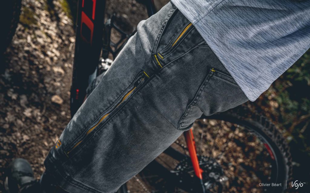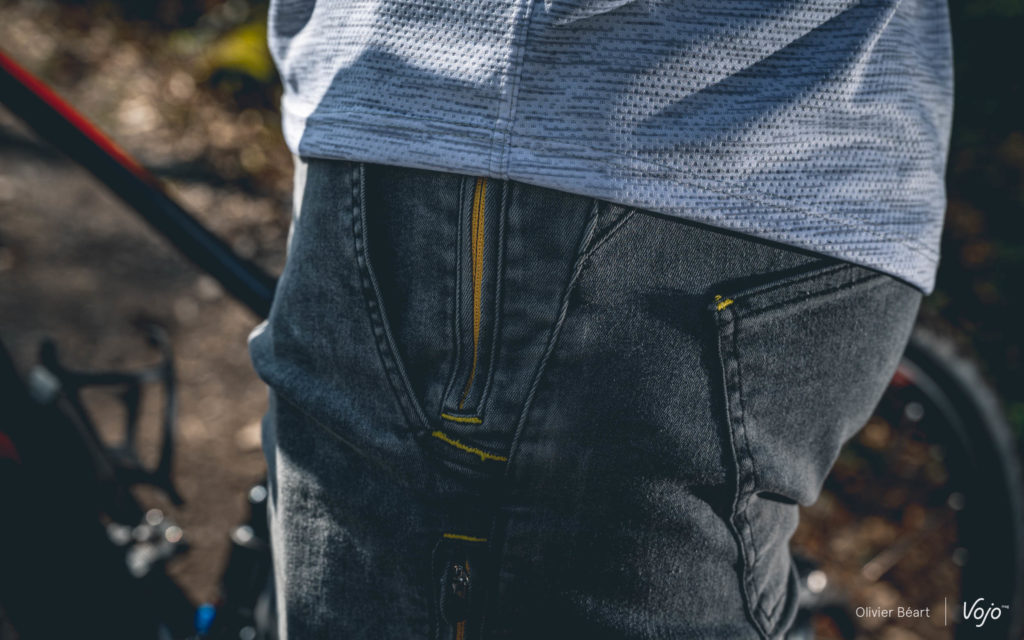 On dispose de deux poches classiques de chaque côté, comme sur n’importe quel jeans, et elles sont à la fois assez profondes et bien taillées pour qu’on puisse y glisser l’un ou l’autre objet sans craindre de le perdre au pédalage. Le côté « près du corps » du short permet aussi de bien maintenir les choses en place dans les poches. Mais pour plus de sécurité et de tranquillité d’esprit, on retrouve aussi deux poches avec fermeture éclair. On dispose également de deux poches à l’arrière, mais elles sont plus décoratives qu’autre chose (sauf pour y glisser un objet plat et souple). Enfin, sur les jambes, deux autres fermetures éclair permettent d’ouvrir des aérations par forte chaleur.