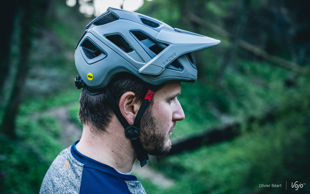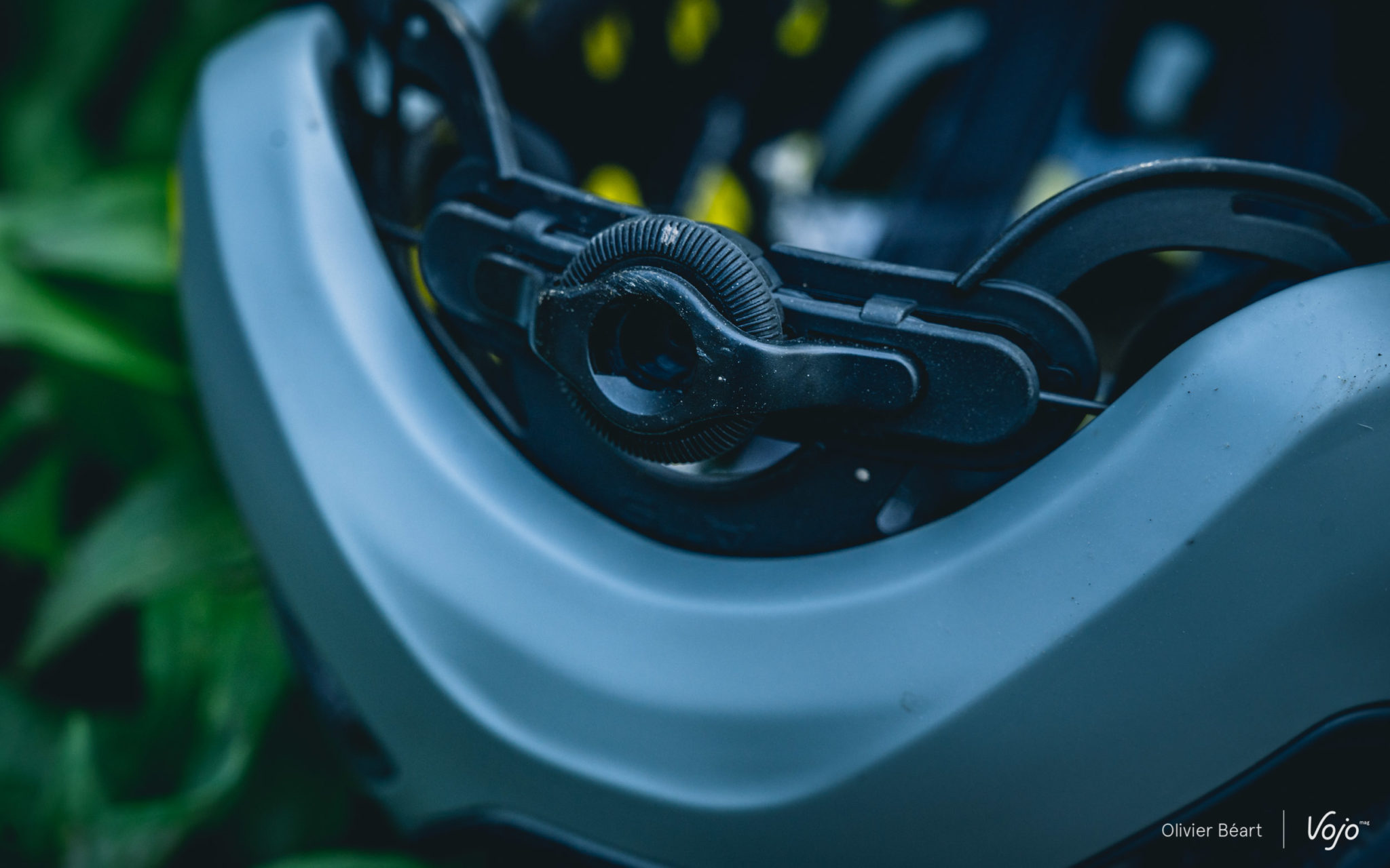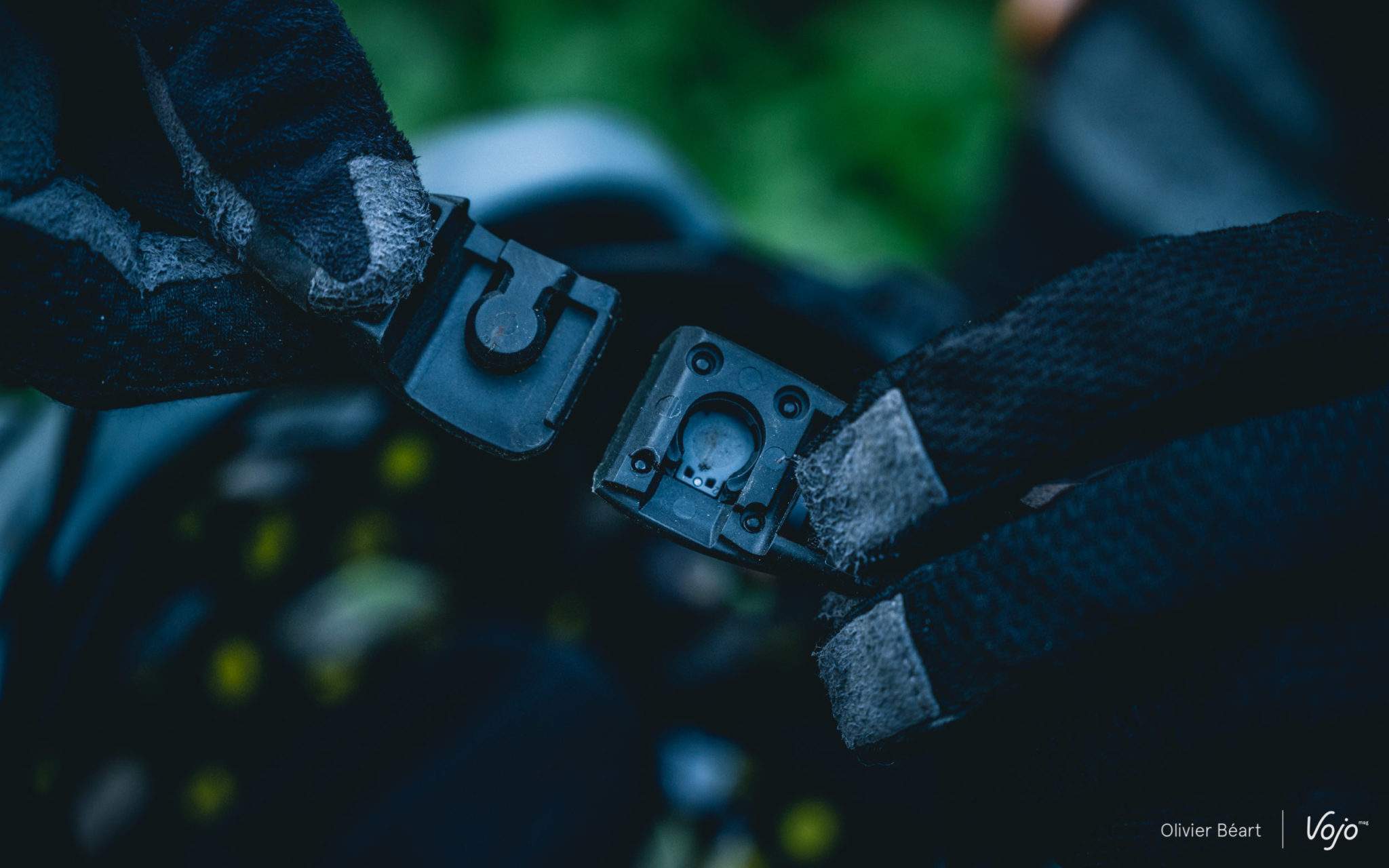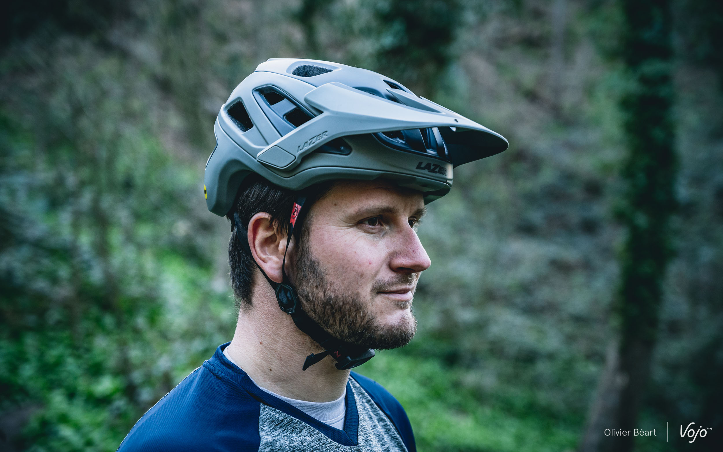 Enfin, on termine le tour du propriétaire par la jugulaire, qui se ferme par une boucle magnétique, un choix de plus en plus courant sur les casques de VTT. Le modèle choisi par Lazer est aussi facile à ouvrir qu’à fermer et même s’il est un poil plus volumineux qu’un « clip » classique, il n’est jamais gênant. Il y a aussi moins de risque de se pincer un petit morceau de peau en le manipulant. Quant au réglage des sangles au niveau des oreilles, il est aussi très pratique et on peut positionner la boucle très près de ses lobes sans ressentir de sensation désagréable.