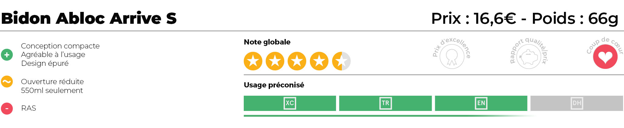 Le Abloc Arrive S est donc une bonne solution pour ceux qui doivent composer avec un cadre étriqué, ou tout simplement pour le pilote qui recherche un bidon au design sobre et épuré qui ne dénaturera pas l’esthétique de son vélo. Cerise sur le gâteau, il s’agit d’un bidon très agréable à l’usage, à défaut d’être généreux en terme de volume embarqué.