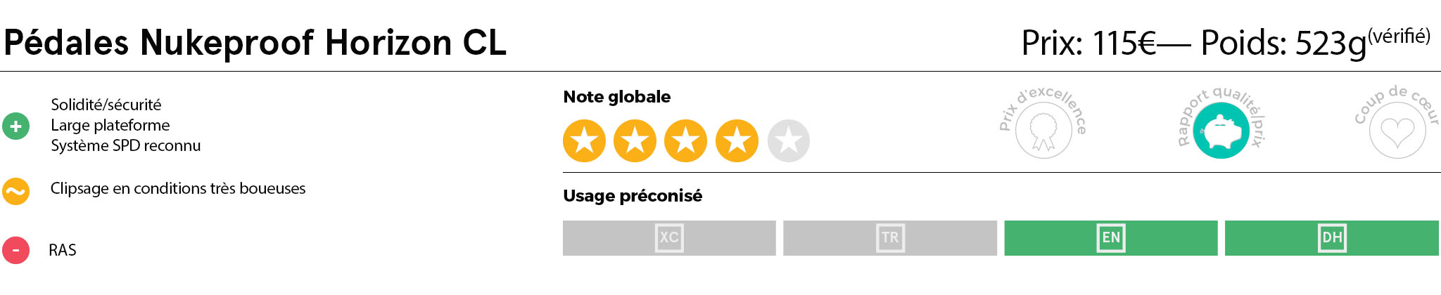 Si Nukeproof produit depuis de nombreuses années des cadres et des vélos complets, la marque a toujours été très forte pour de proposer des accessoires et particulièrement des pédales. Plates dans un premier temps puis « automatiques » depuis début 2017. Nukeproof dévoile ses Horizon CL, compatibles SPD et déclinées avec deux plateformes de tailles différentes : petite (enduro) ou grande (DH). Nous avons roulé pendant des mois avec le modèle le plus grand :