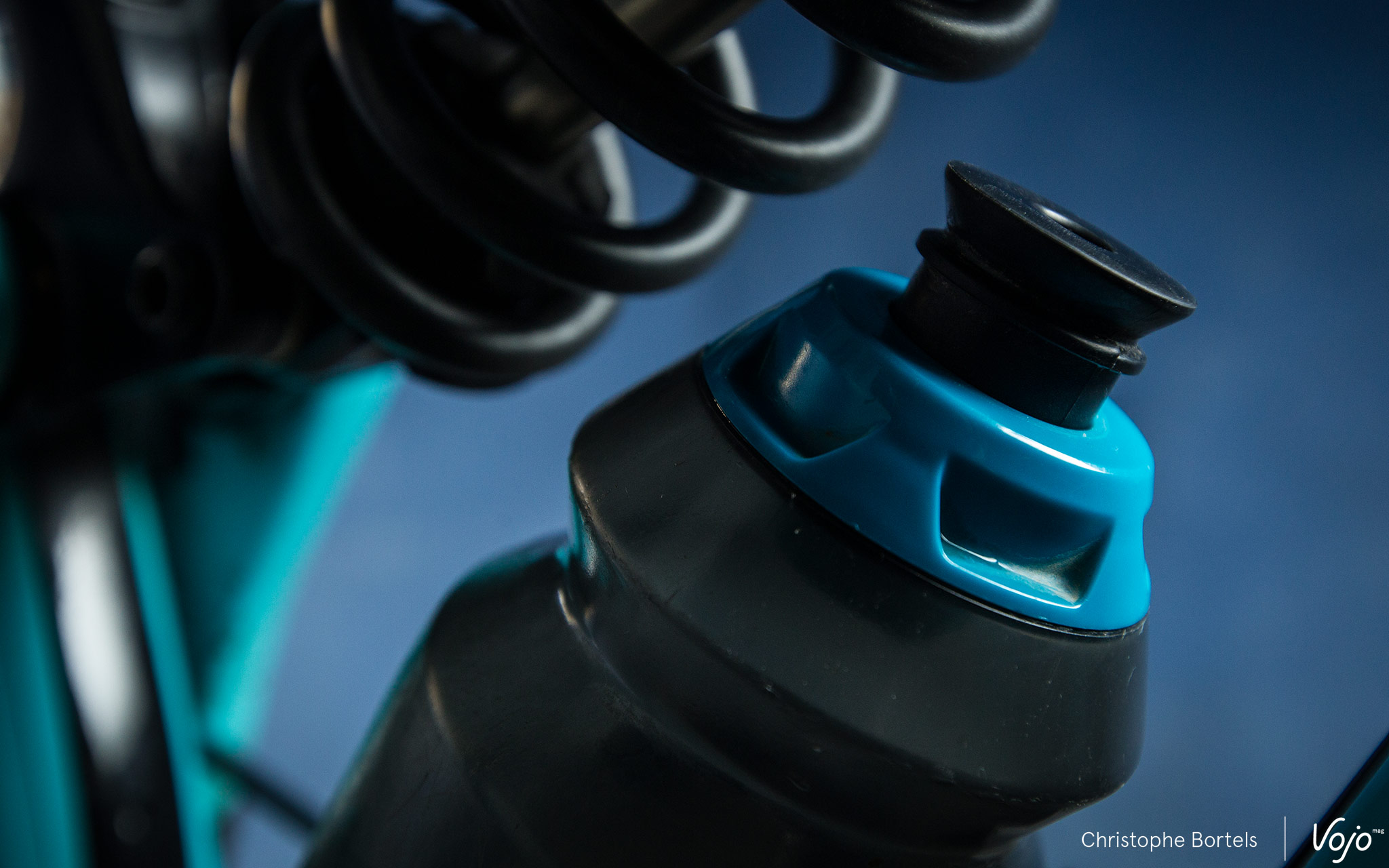 Ces dernières années, les innovations dans le monde du bidon se sont surtout faites au niveau de la fixation, comme chez Fabric et ses « plots » minimalistes, ou encore Fidlock avec son bidon magnétique. Chez Abloc, petite entreprise basée à San Francisco, on a surtout réfléchi à la forme, pour proposer un bidon esthétiquement réussi d’une part, mais aussi pour le faire passer dans des cadres de petite taille et/ou dont la conception laisse peu de place à un bidon. Et ça tombe bien puisque c’est exactement le problème que nous rencontrions avec notre Santa Cruz Nomad 3 en taille M ! Utiliser un porte-bidon et un bidon classique se révèle en effet quasi impossible, la position de l’amortisseur ne laissant que très peu de marge de manoeuvre.