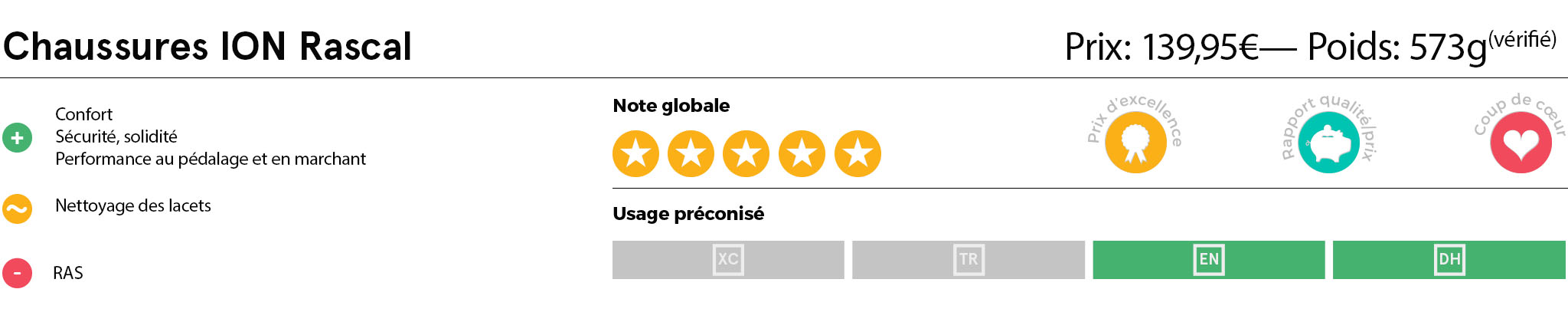 Les ION Rascal se sont révélées comme d’excellentes chaussures pour une pratique proche de l’enduro. Pas des plus légères, elles rebuteront peut-être les compétiteurs les plus exigeants mais elles conviendront parfaitement à la majorité des pratiquants à la recherche d’une paire de chaussure aussi confortable sur le vélo qu’à côté. Sans les ménager, elles ont su résister, et résistent toujours, à une utilisation intensive. Relativement respirantes, elles conviendront à une utilisation toute l’année (sauf conditions extrêmes). Une construction solide et bien pensée, mêlant performance, protection et confort a permis à ION de proposer avec la Rascal une excellente chaussure.