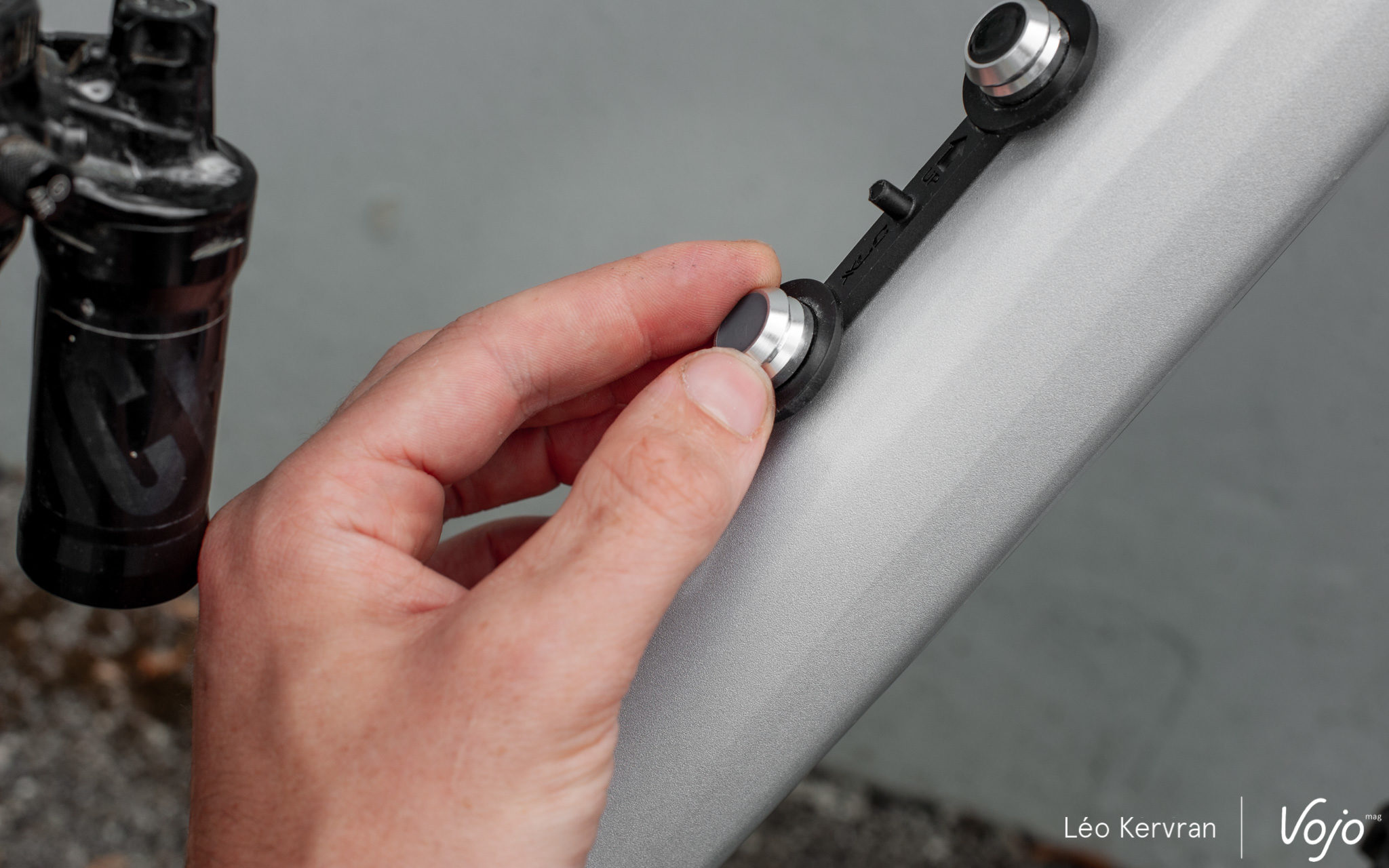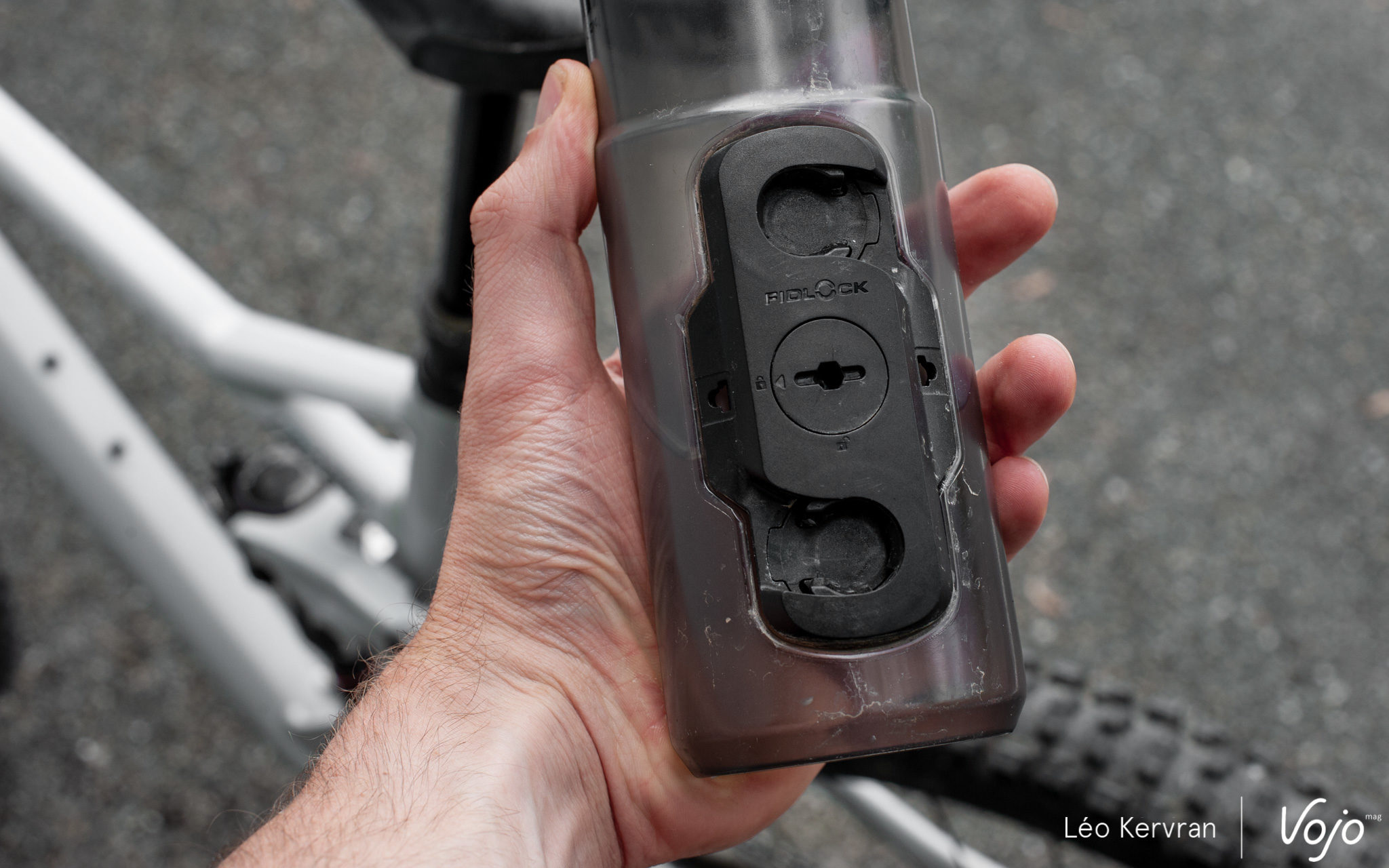 Différente… et pas vraiment meilleure. Avec la version Fidlock, on visse la base sur le cadre comme n’importe quel porte-bidon mais ici, ce sont les aimants eux-même qui font office de vis. Impossible donc d’utiliser une clé hexagonale de 3 ou 4 mm comme d’habitude, on ne peut que serrer à la main et éventuellement s’aider d’un petit renfoncement pour aller un peu plus loin. La base en-elle même, avec le petit « doigt » en plastique qui guide le bidon et fait office de point de pivot, apparaît également moins rigide que l’originale et plus facile à abîmer.