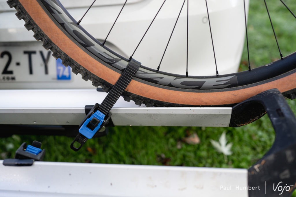 - Des sangles de maintien des roues suffisamment longues pour les gros pneus ou les jantes hautes et qui peuvent être coulissées le long des rails sans outil, juste en les pivotant d’un quart de tour.