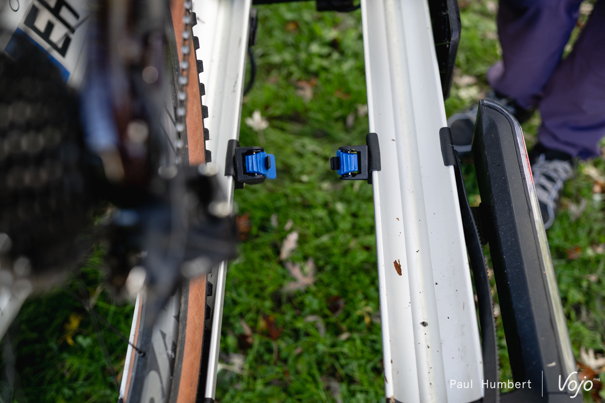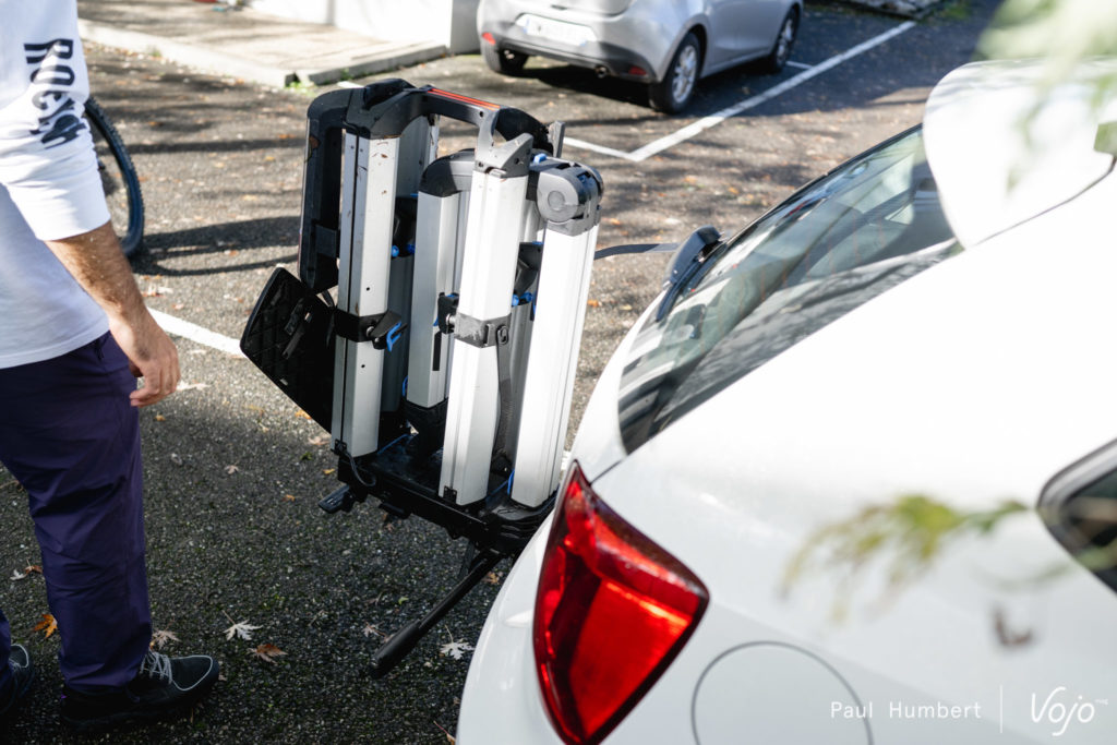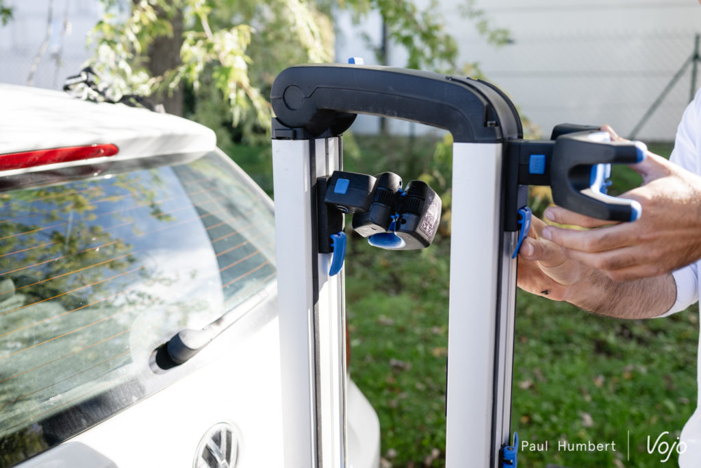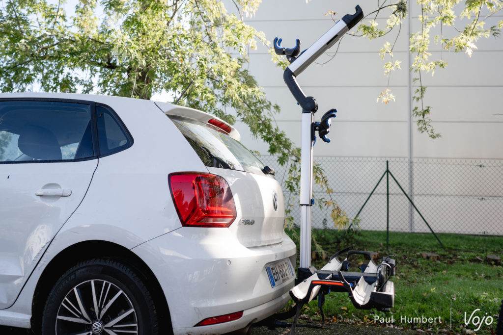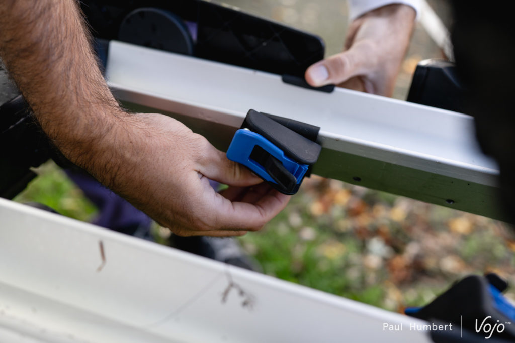 Côté finitions, l’avis est partagé : certains éléments comme la structure en aluminium, les pinces, les rails, sont beaux et paraissent solides tandis que d’autres, comme les innombrables pièces de liaison en plastique ou les mécanismes des sangles de roues, font « bas de gamme » et soulèvent quelques question quant à la durée de vie de l’ensemble. Même chose sur la route, l’articulation entre la structure porte-vélo et l’attache sur la boule semble un peu lâche et à haute vitesse, l’ensemble bouge un peu trop à notre goût. Pour l’instant ça a tenu mais sur autoroute par exemple, ça n’inspire pas vraiment confiance.