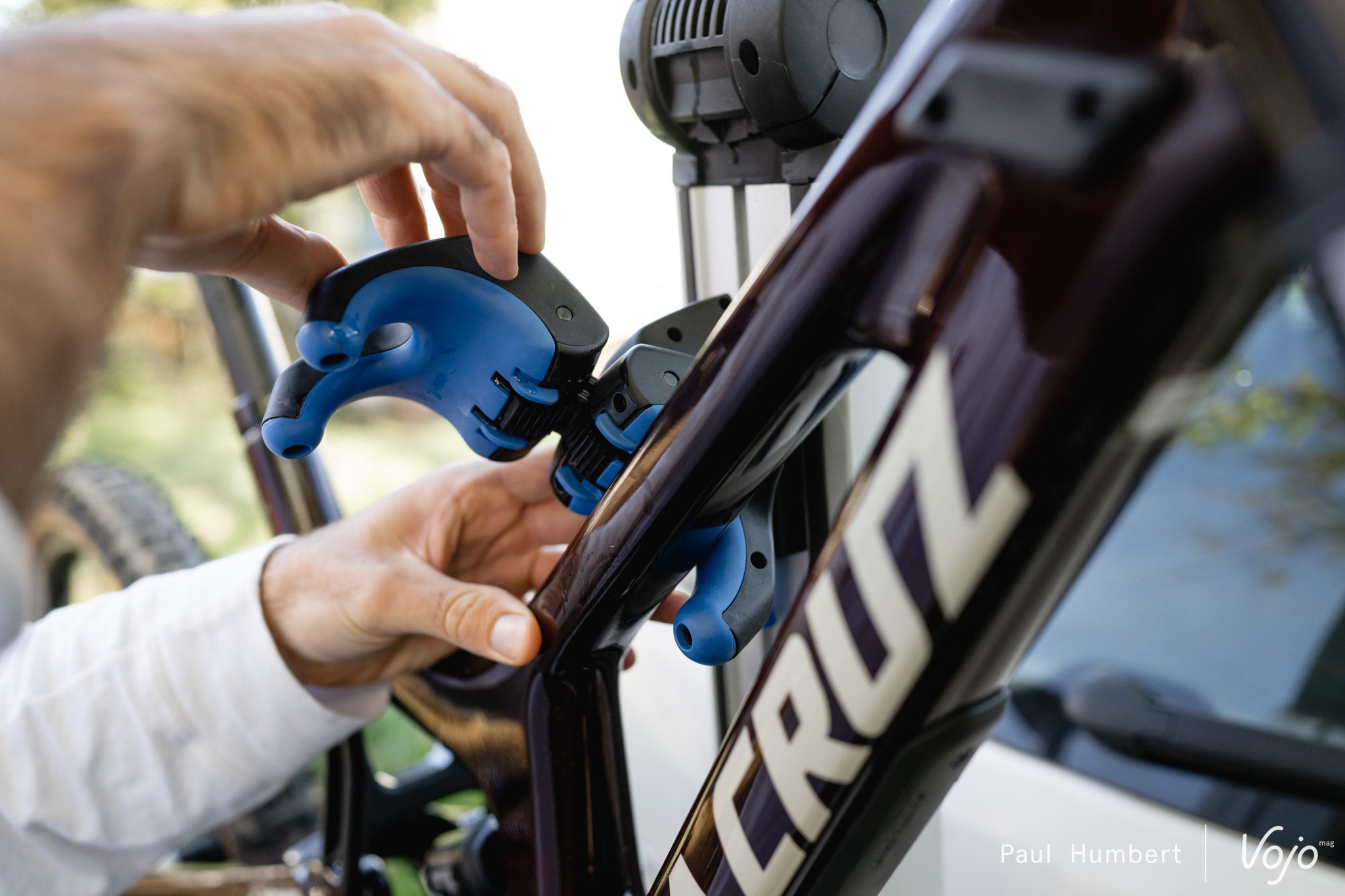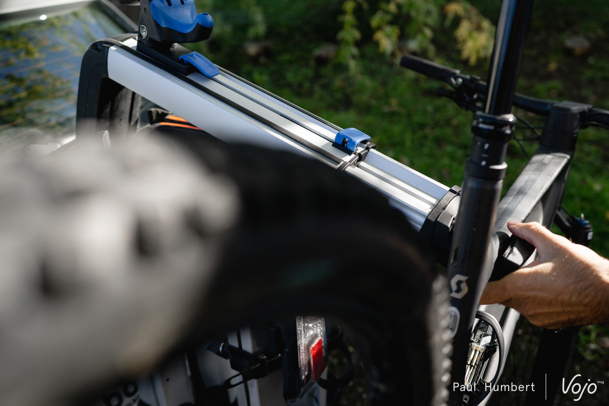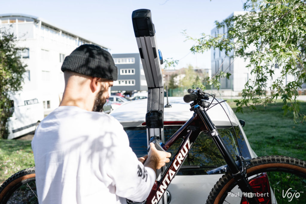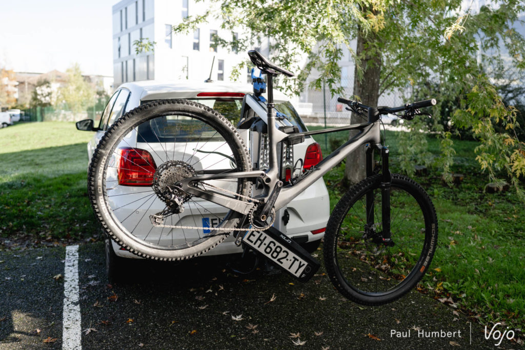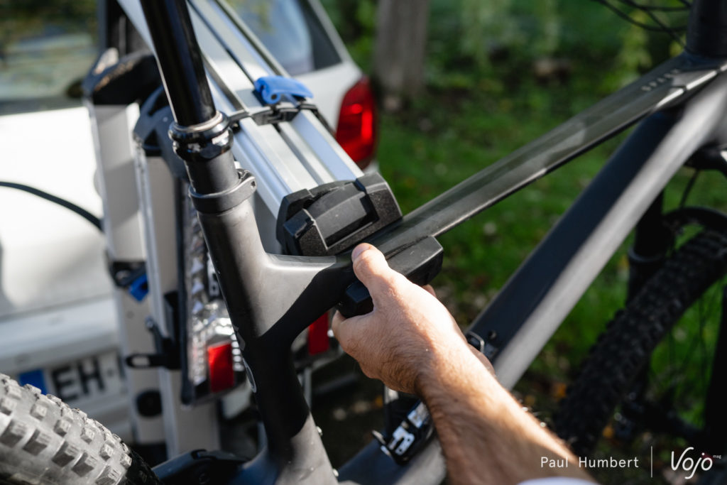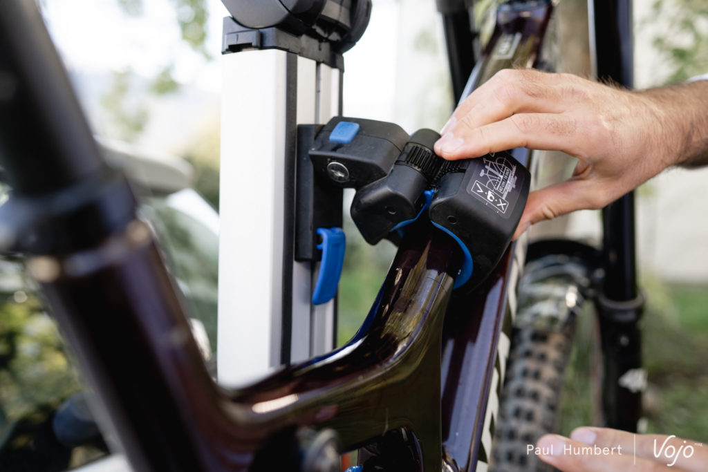 Ce qui peut coincer, c’est justement ce grand bras en aluminium. Du fait de cette conception, la pince qui maintient chaque vélo ne peut que coulisser verticalement, elle ne peut pas se déplacer horizontalement. Or, sur certains e-bikes notamment, on ne peut pas serrer au niveau du tube supérieur à cause de l’ancrage d’amortisseur et on ne peut pas non plus prendre le tube diagonal à cause de la batterie, le diamètre est trop important pour la taille de la pince. Même problème pour les vélos de ville sans tube supérieur. Décaler la pince de quelques centimètres suffirait à régler le problème mais ce n’est pas possible. Ainsi, nous n’avons pas pu installer le dernier Focus Jam² SL (lire Test nouveauté | Focus Jam² SL : le trait d’union) sur ce porte-vélo.
