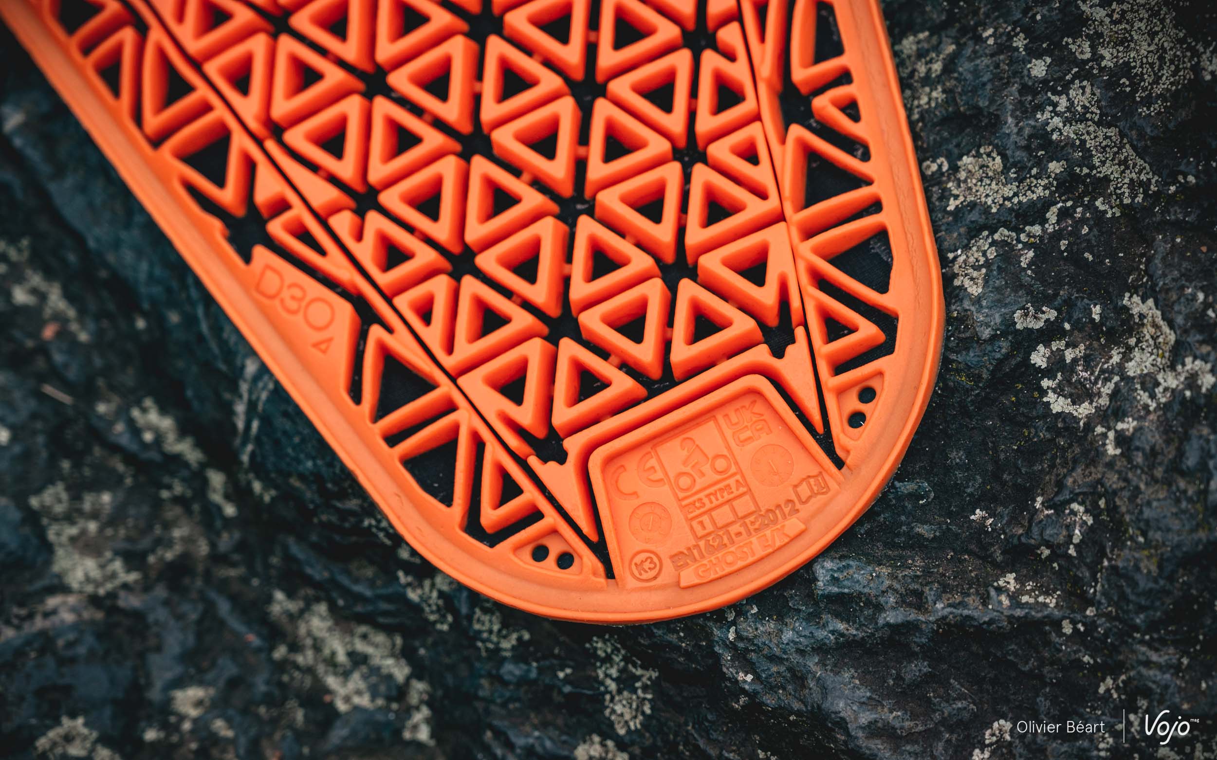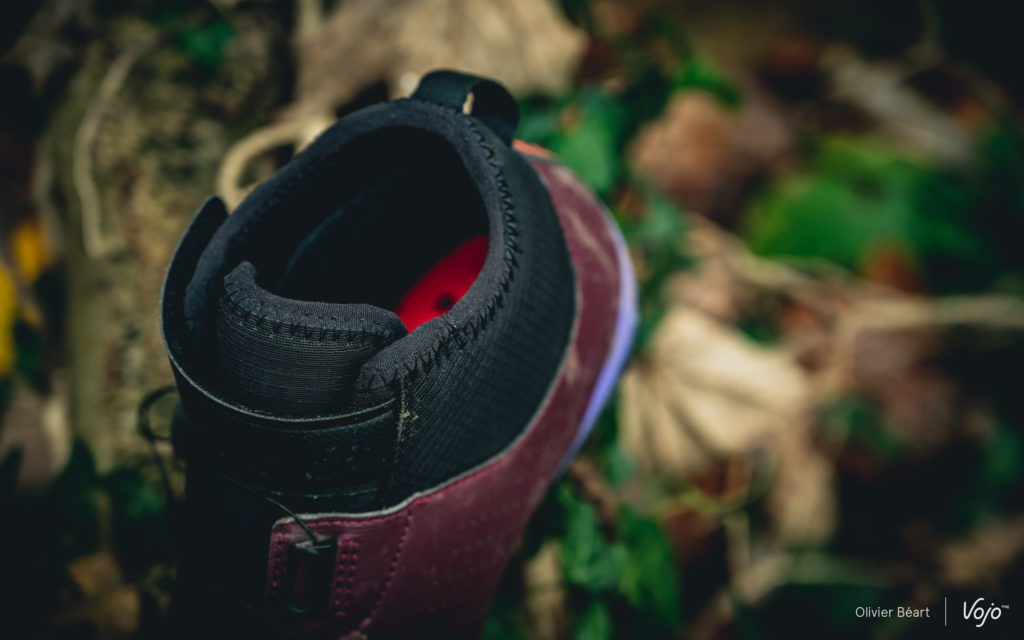 Au cours du test, nous avons relevé deux points négatifs. Tout d’abord, le chausson qui remonte sur la cheville peut se faire sentir à l’arrière car une couture exerce une petite pression sur le tendon d’Achille. Cette partie de la tige est selon nous trop rigide. C’est léger et on ne le sent pas tout le temps, mais c’est un point que nous ne pouvions passer sous silence. Enfin, nous avons regretté que la semelle manque de grip quand on marche. Pour la boue, on peut mettre deux crampons à l’avant, mais quand le sol est dur et glissant, la semelle en elle-même manque d’accroche car ses gros crampons carrés se déforment peu et le caoutchouc utilisé est plutôt ferme.
