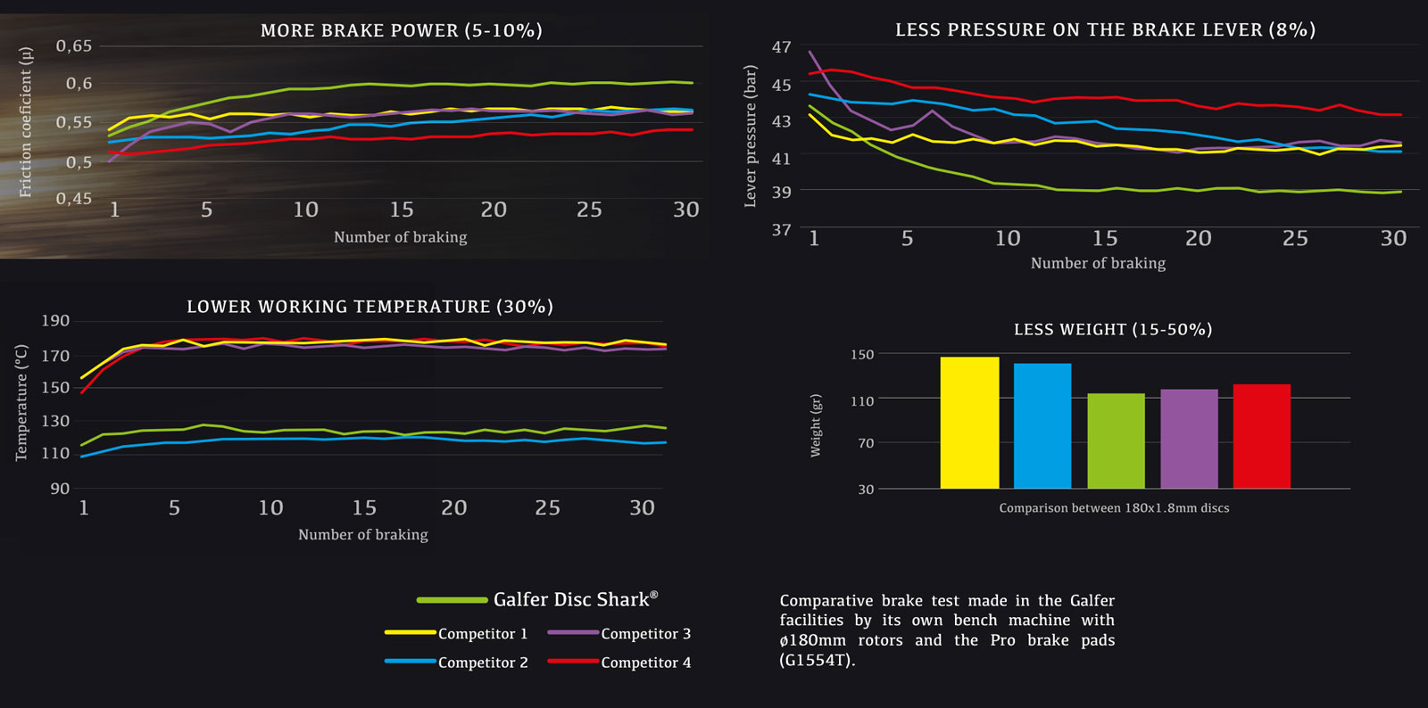 Dans sa communication, Galfer fait de belles promesses, chiffres d’essai sur banc de mesure à l’appui. La marque parle de 5 à 10% de puissance en plus par rapport à d’autres disques de référence également testés, d’une température de fonctionnement en moyenne 30% plus basse et de moins de force nécessaire au niveau du levier de frein. Voilà des affirmations que nous avons souhaité vérifier sur le terrain, non pas avec des chiffres, mais en essayant simplement de voir si ces affirmations chiffrées sont perceptibles au niveau des sensations.