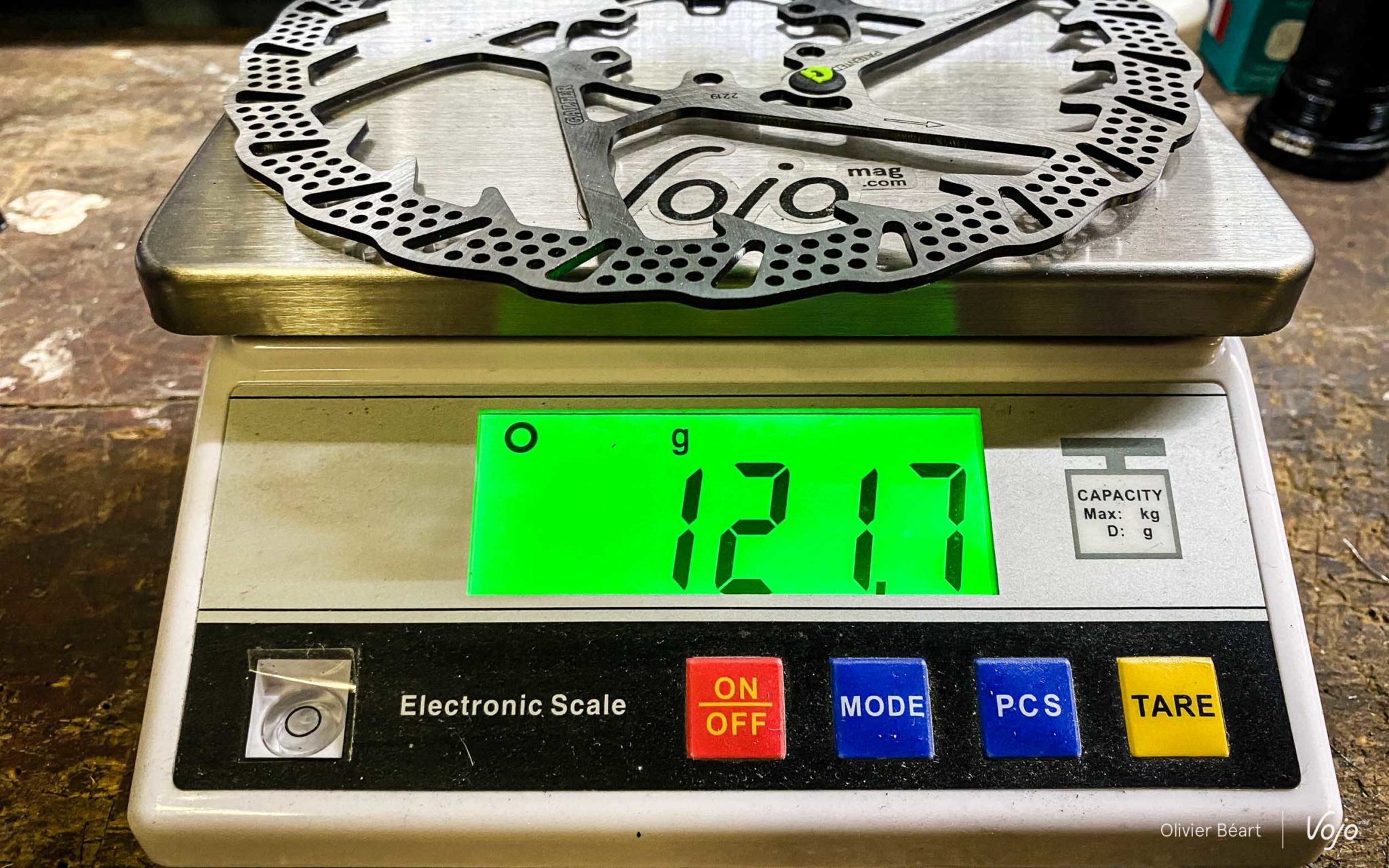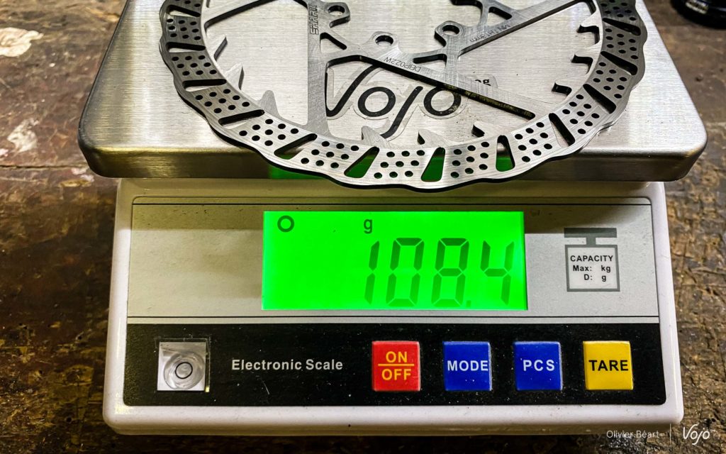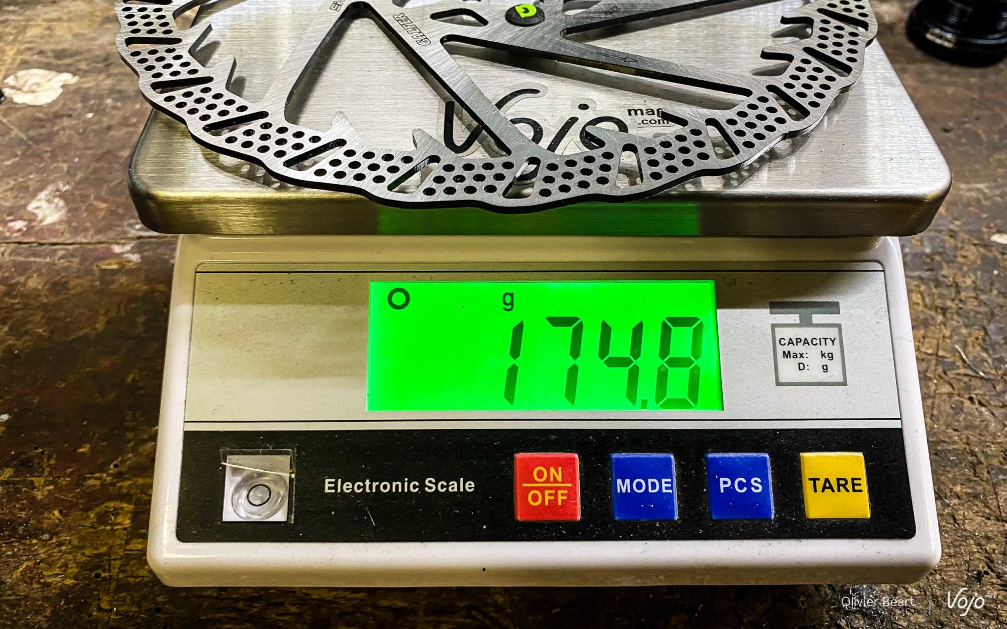 Au niveau du poids, les Galfer Shark sont plutôt légers avec 108g pour le 160mm, soit 10g de plus qu’un disque flottant Sram ou que le modèle light de chez Galfer, alors que les 180 et 203mm font quasi jeu égal avec les mêmes références. Ils sont globalement un peu plus légers que les autres disques en 2mm d’épaisseur du marché.