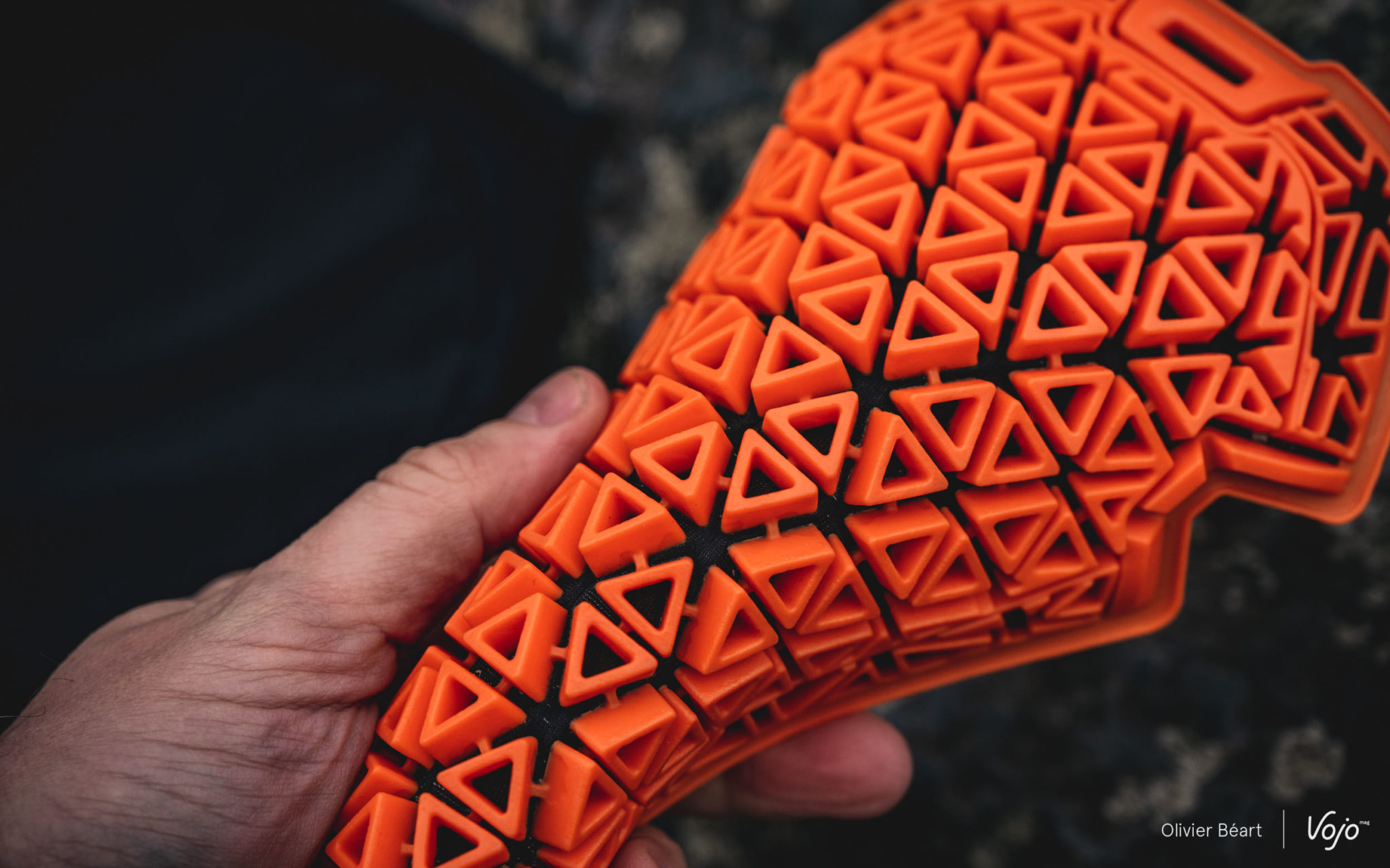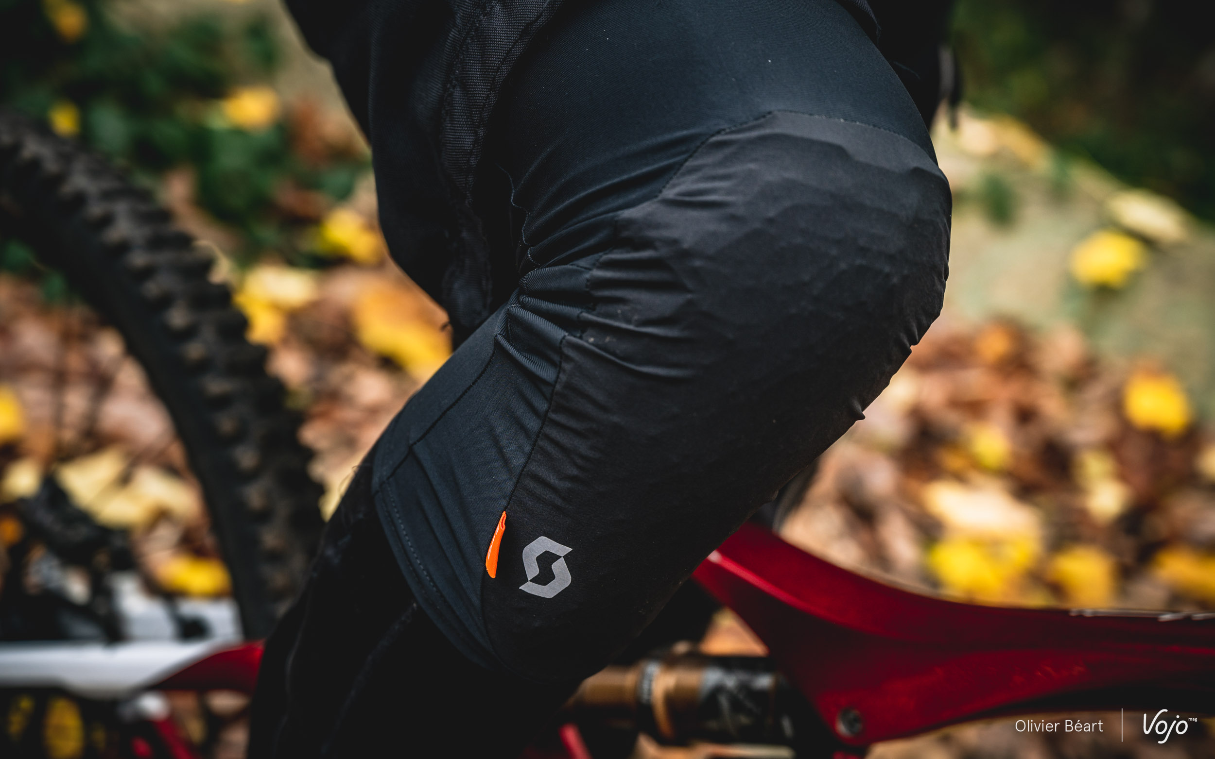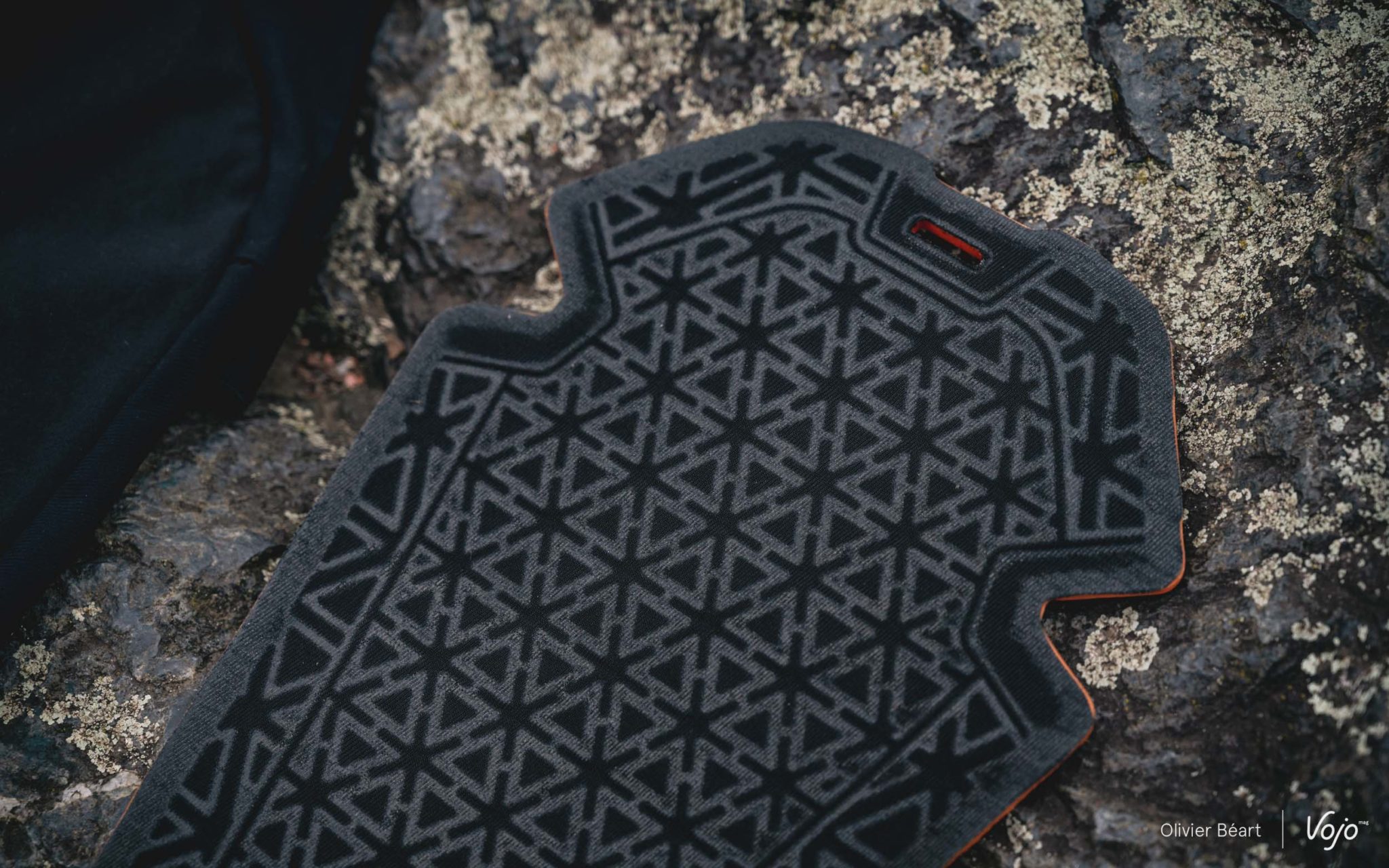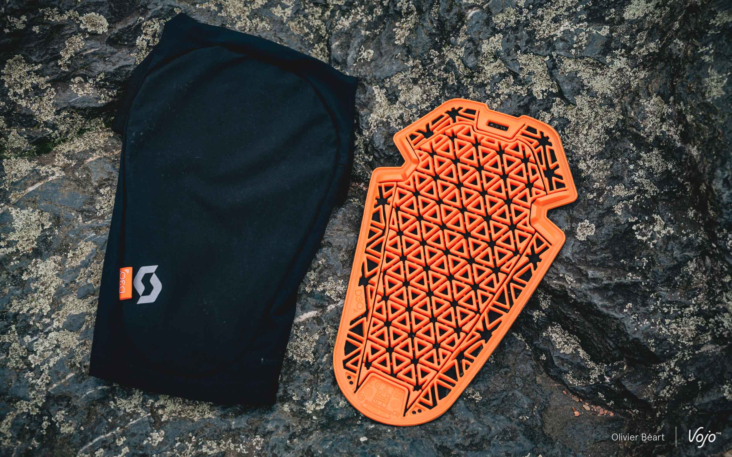 Celle-ci est facilement amovible de la genouillère Scott (pour le lavage par exemple), ce qui nous a permis de l’examiner plus en détails et de voir que sa très grande flexibilité est due à sa conception faite de petits triangles oranges D3O (cette matière souple, qui se durcit en cas d’impact) collés sur une base textile.