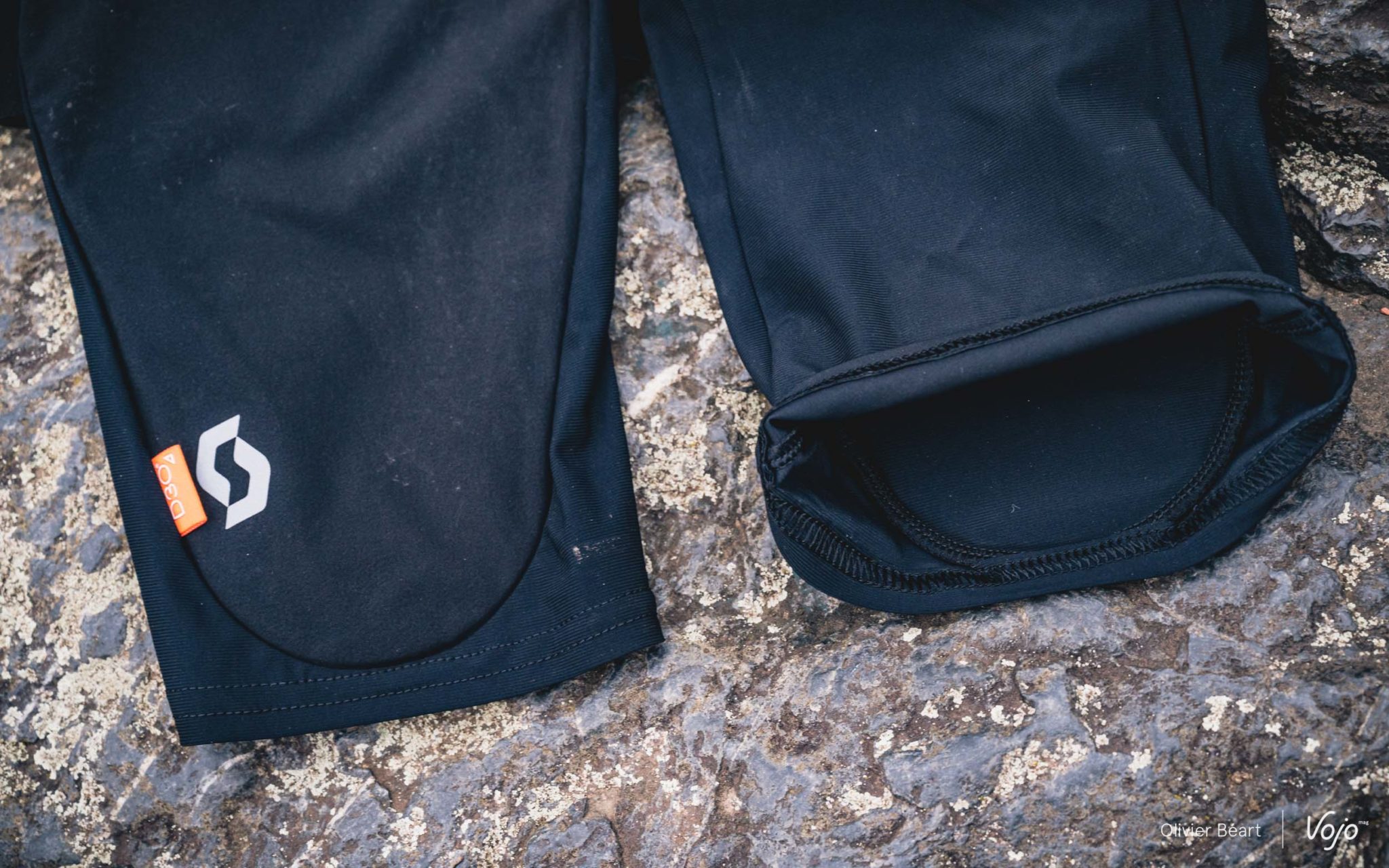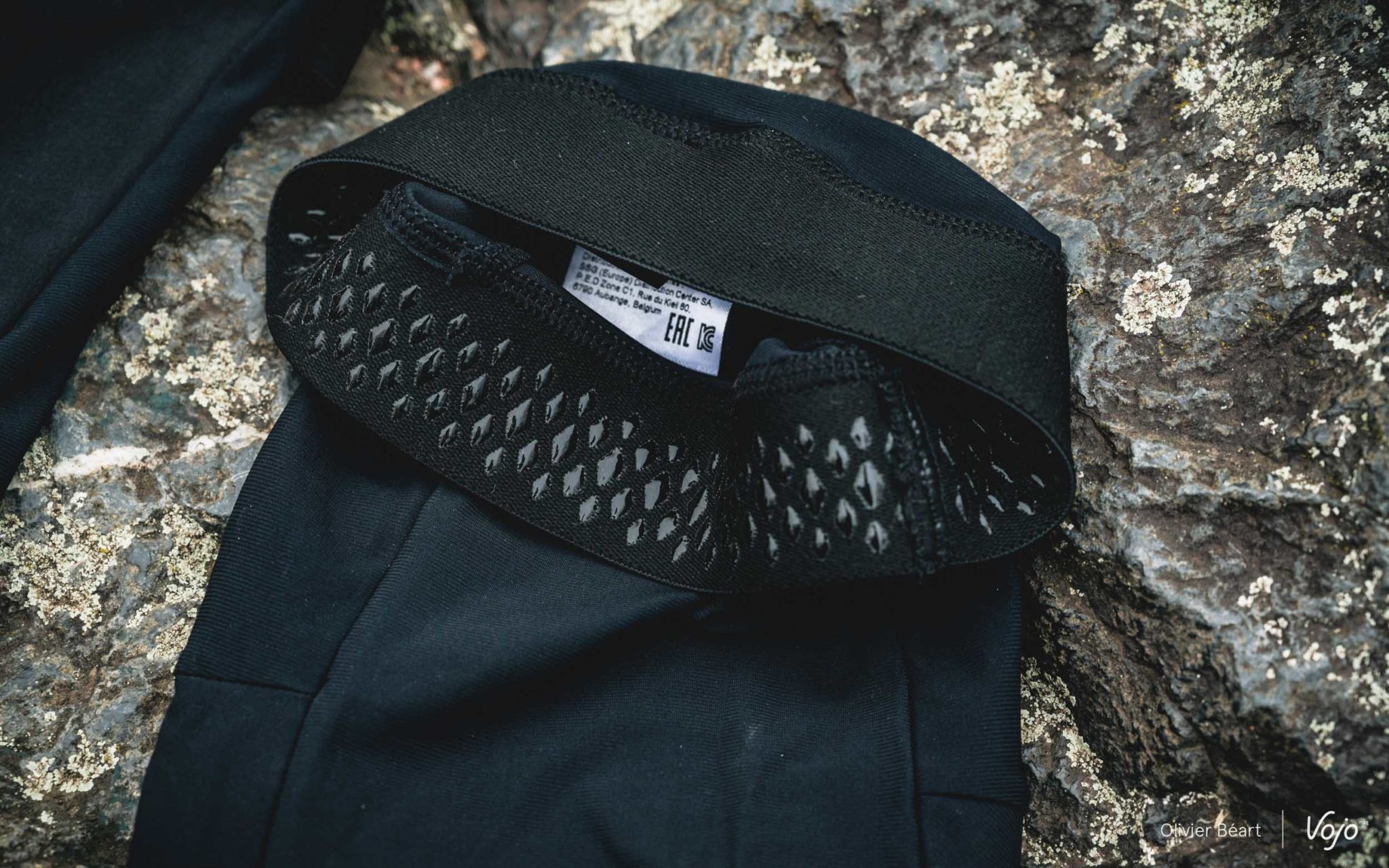 Côté maintien, c’est du tout bon, à condition d’être attentif au choix de la taille. Elles sont plutôt « fit » et l’élastique supérieur assez costaud mais elles peuvent parfois glisser si on est entre deux tailles et si on ne porte pas de cuissard par-dessus. Autre petit reproche, on a noté après de très longs rides (6 à 7 heures sur le vélo) que les petits points en silicone transparents présents pour aider à l’accroche avaient créé de petites zones d’irritation sur les cuisses. Il n’y a pas de solution miracle, mais un bandeau encore plus large et des inserts silicone plus larges permettraient peut-être de mieux gérer ce phénomène. Cela dit, les traces ont disparu au bout de quelques heures et nous n’avons pas eu de démangeaison persistante. On a par contre apprécié qu’il n’y ait pas d’élastique ni d’inserts silicone dans la partie basse, et que le manchon s’arrête juste en bas de l’insert D3O, ce qui permet, au choix, d’éviter les conflits avec les chaussettes hautes ou de laisser un peu de mollet apparent.
