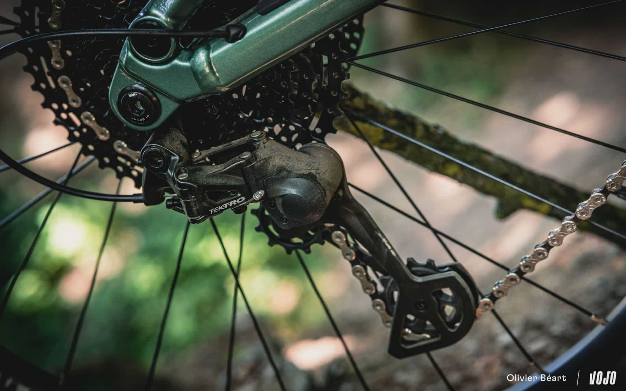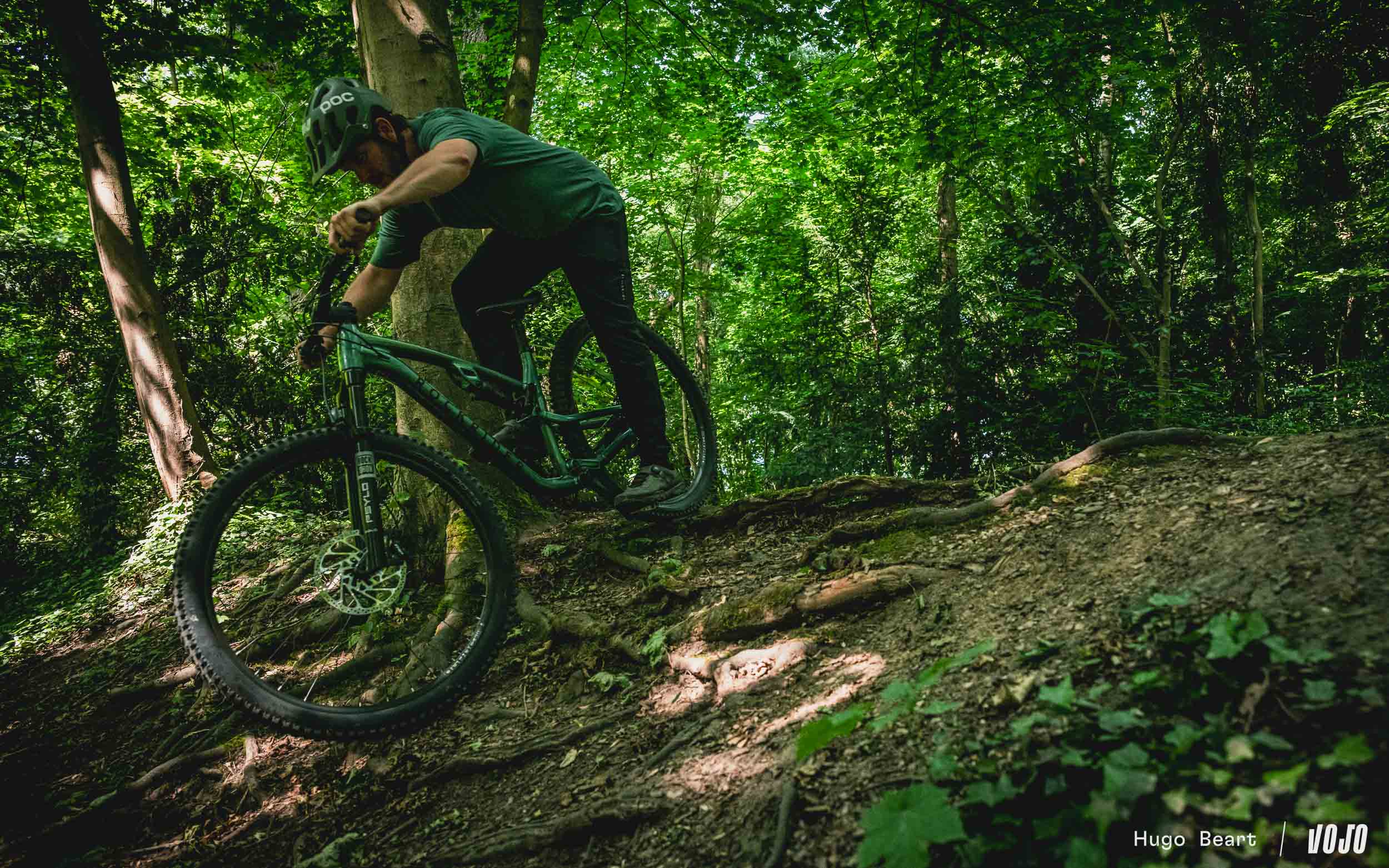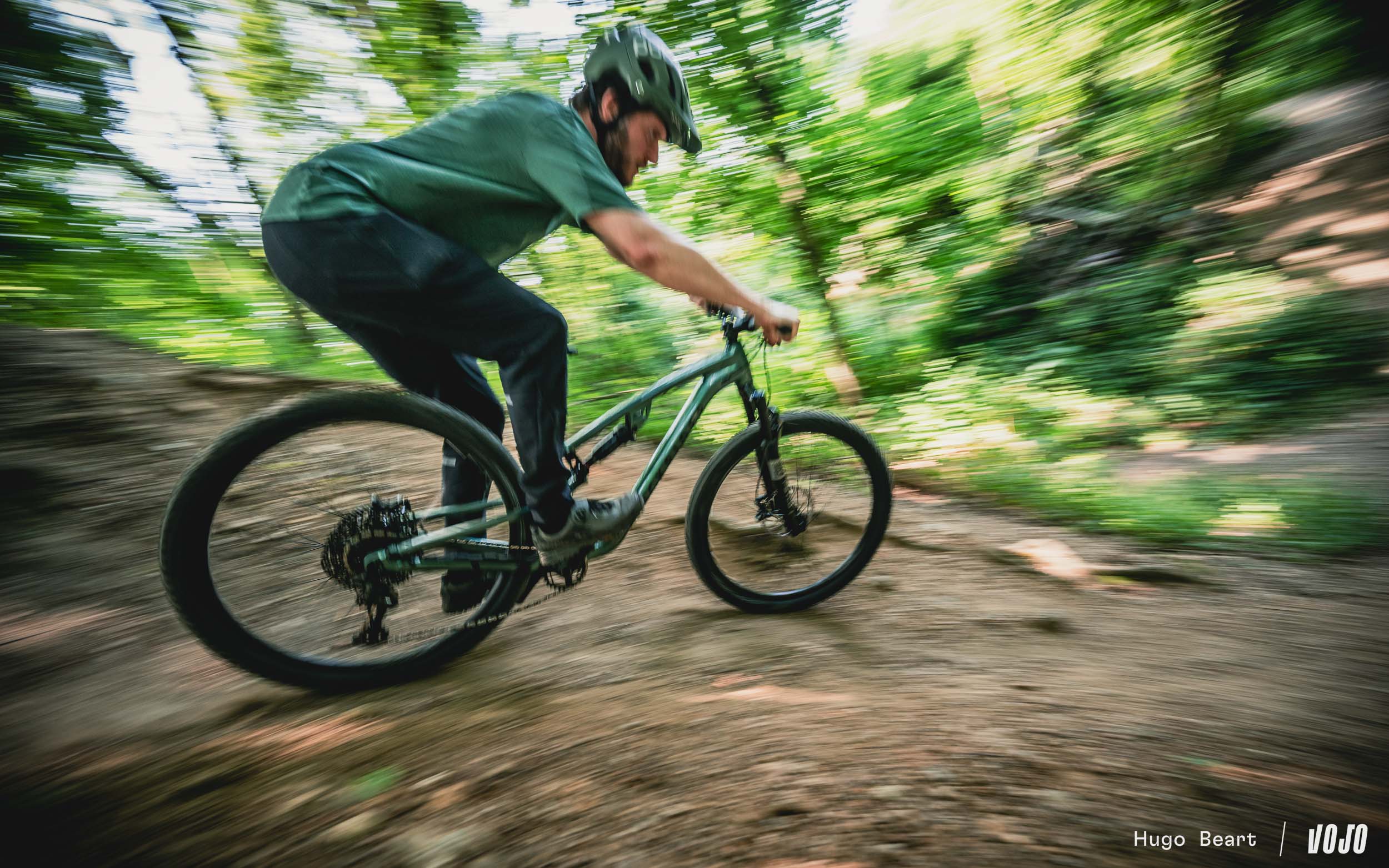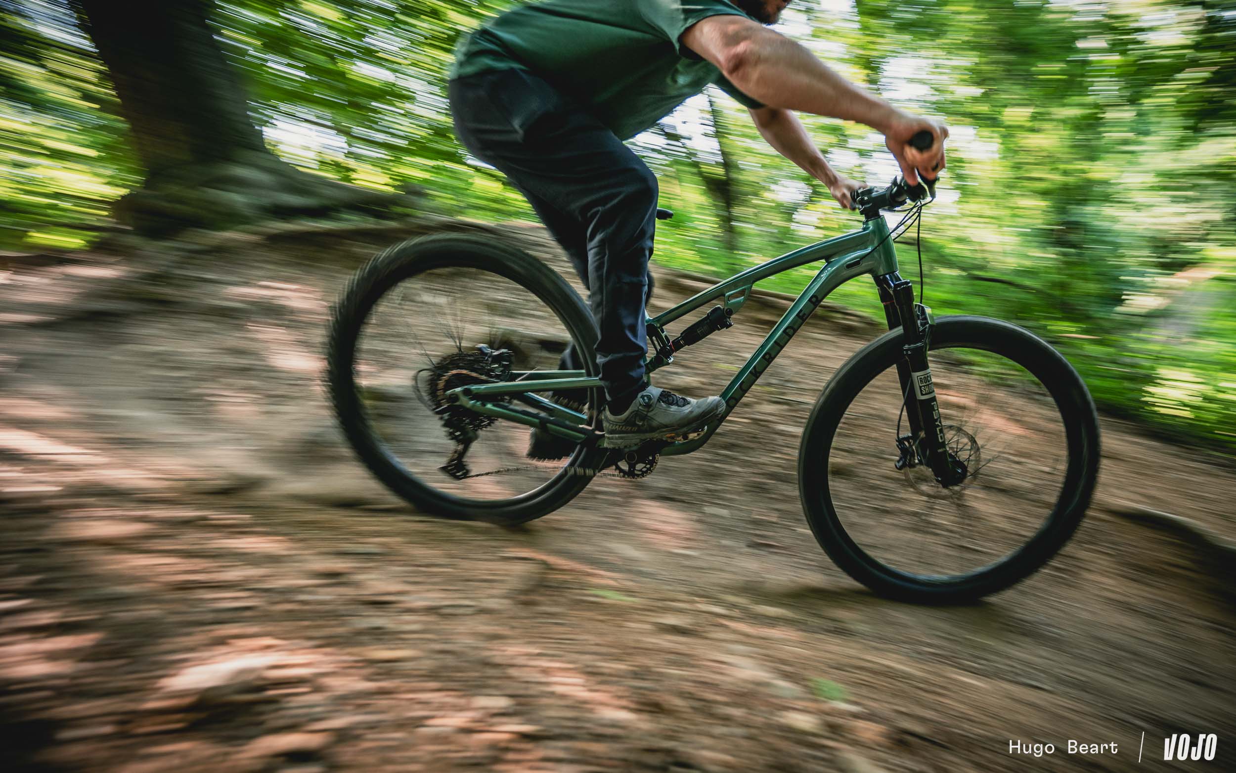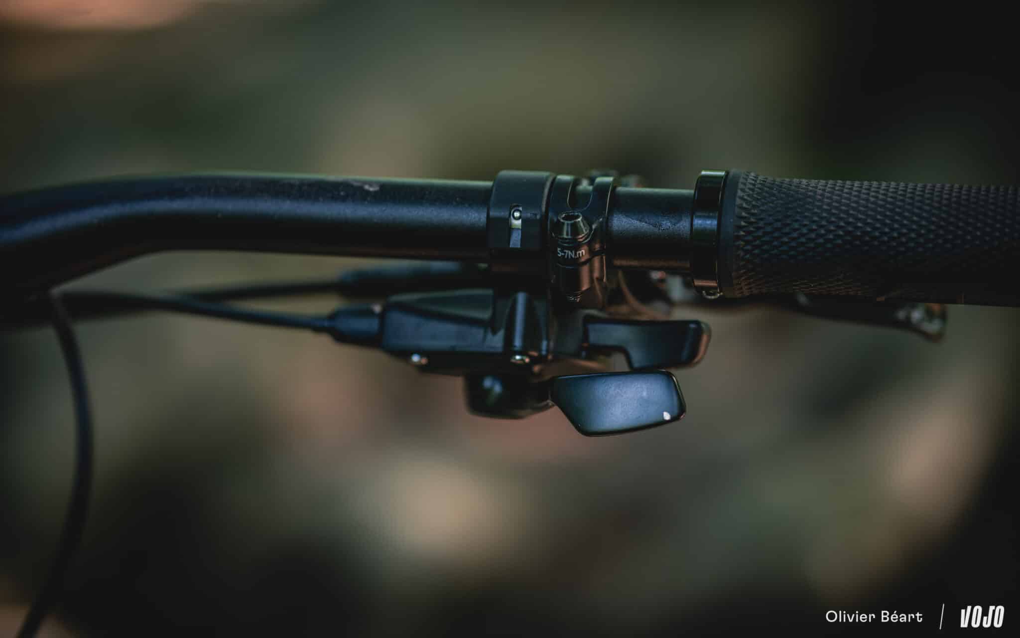 En côte, quand on grimpe au train, on remarque que la suspension ne pompe pas trop, mais on aurait tout de même apprécié avoir un levier permettant de durcir la compression. Pas un blocage complet, mais une position qui évite à l’amortisseur de s’enfoncer trop quand la pente devient forte et qu’il y a des obstacles ou, pire, de petits cuvettes où il a tendance à consommer beaucoup de son débattement. Néanmoins, le grip dans les côtes techniques est bon et on peut se lancer à l’assaut de montées complexes avec de bonnes chances d’arriver en haut.