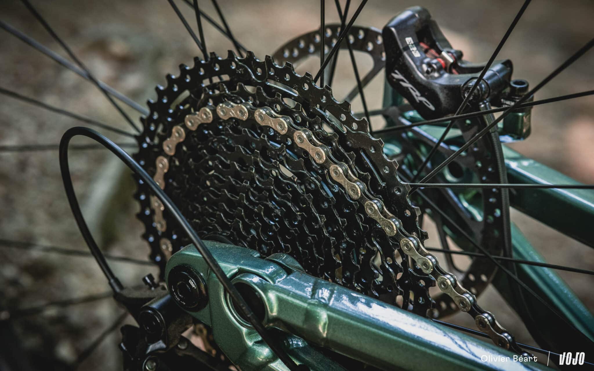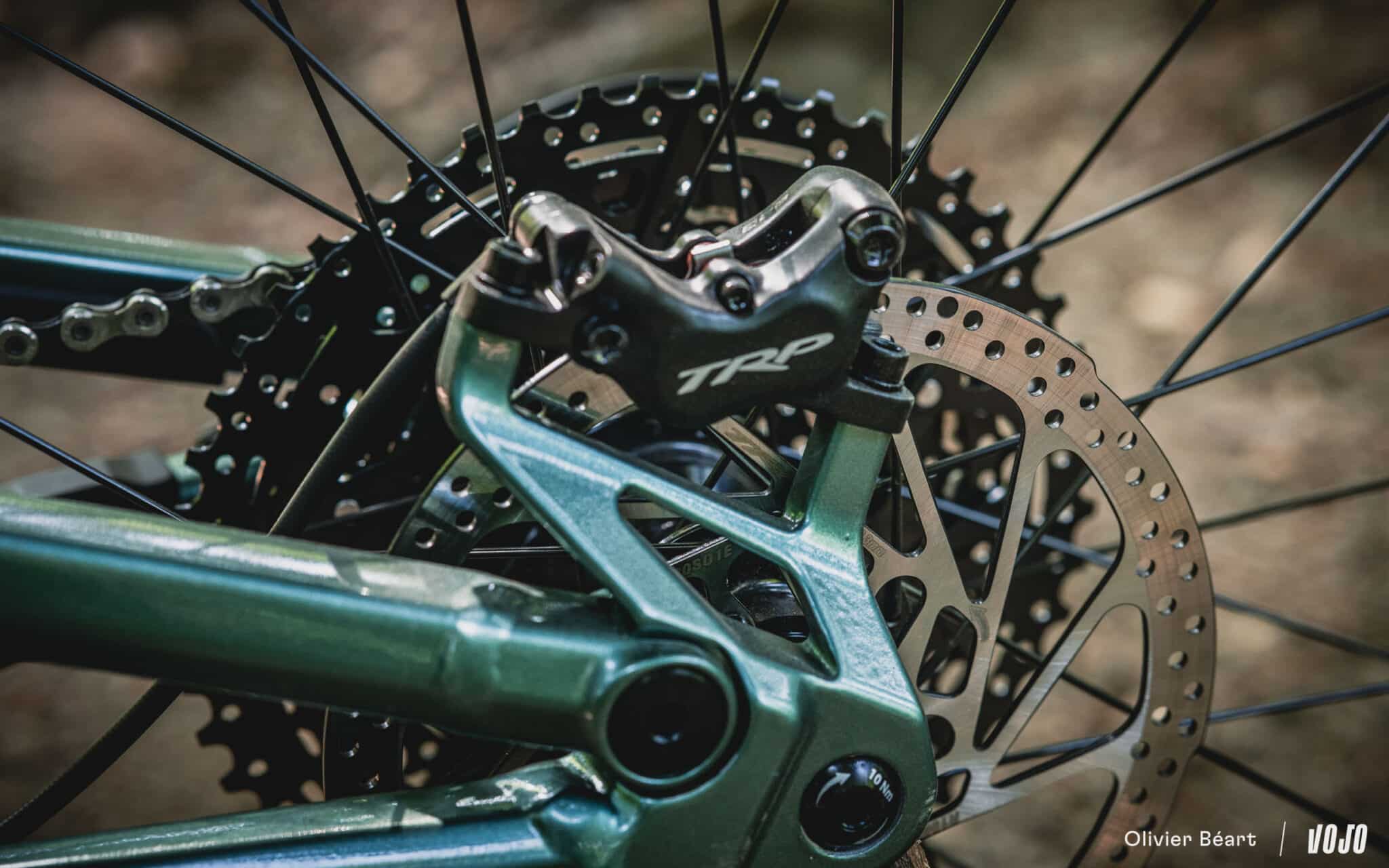La transmission vient de chez TRP, avec une concession qui a été faite sur le nombre de vitesses, puisqu’il n’y en a ici « que » 11. Mais on bénéficie tout de même d’une cassette 11-50 dents et la différence avec le 12 vitesses ne se fait que sur l’étagement un peu moins favorable. Le pédalier provient quant à lui de chez Prowheel avec un plateau de 30 dents. L’ensemble fonctionne de manière tout à fait correcte. Le shifter a un touché un peu plus flou que chez Shimano ou Sram, mais il reste agréable à utiliser et les vitesses changent franchement bien, même en charge. La finition du pédalier est belle et elle semble durable. Bref, ce n’est pas luxueux, mais c’est pas mal du tout !