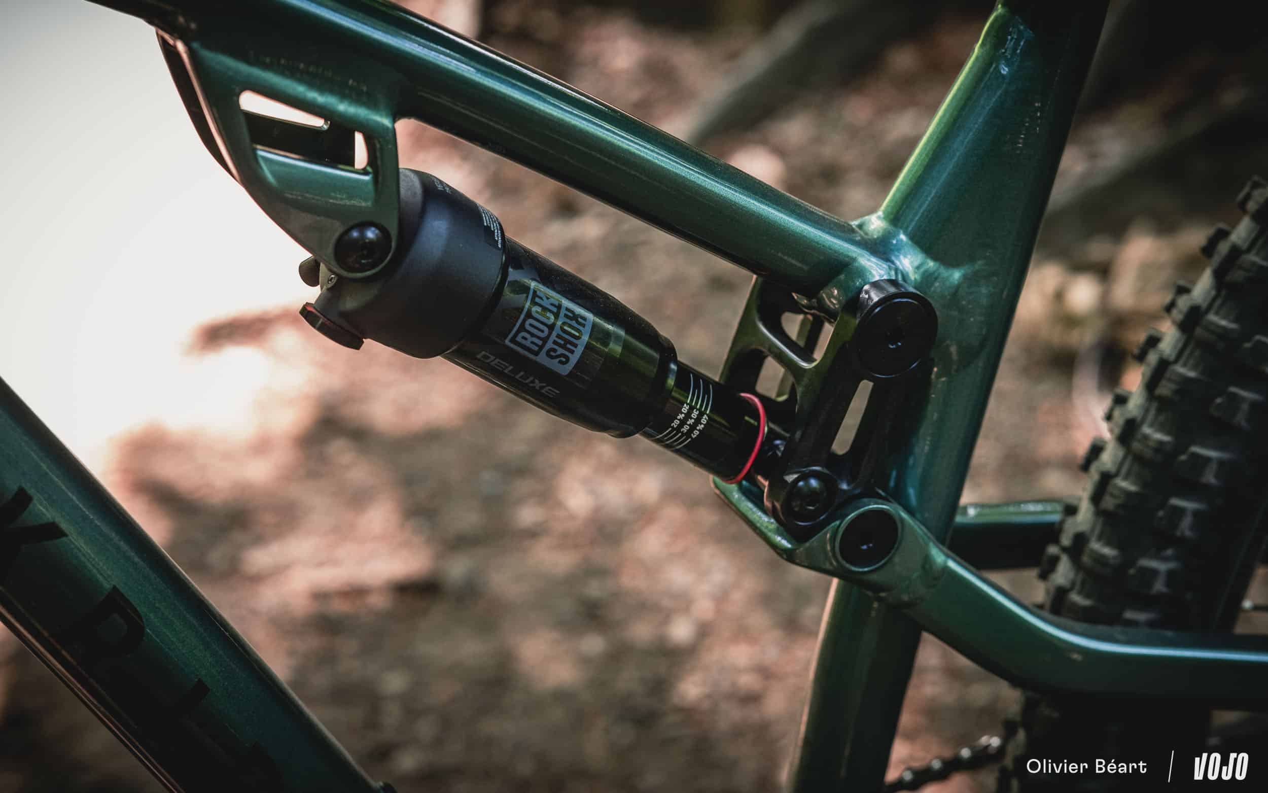 Petite originalité, la biellette est assez compacte et les haubans sont courbés pour remonter vers elle et l’amortisseur. Ce dernier est un RockShox Deluxe Select en course de 45 mm, et il offre 130 mm de débattement à la roue arrière. Nous verrons plus loin que ce petit amortisseur a fort à faire sur ce vélo, malgré le débattement réduit.