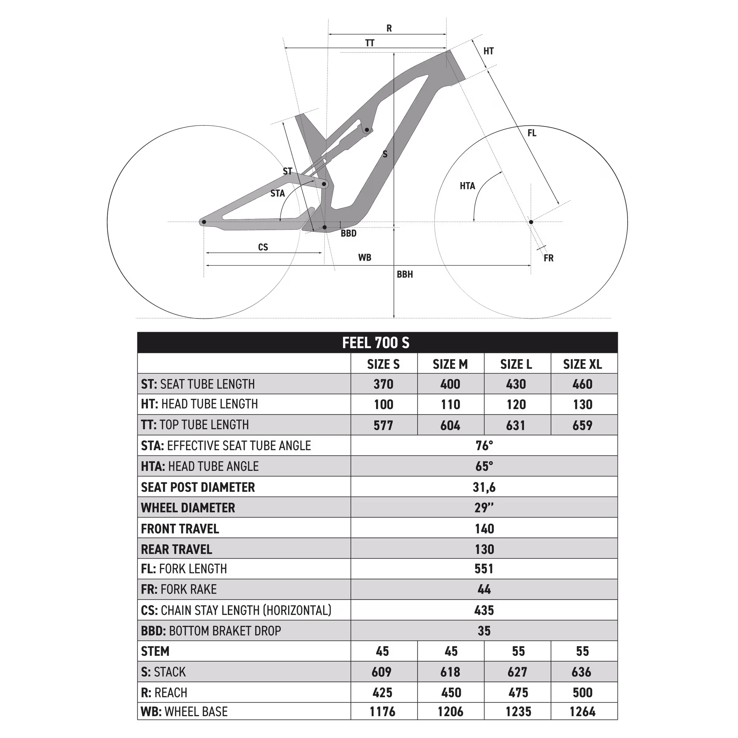 Il a par contre une cinématique de suspension différente de ses grands frères Feel 900S et Feel 900 LT. Ici, pas de 4 Bar Linkage ni de yoke pour faire la liaison entre la partie arrière et l’amortisseur. Le Rockrider Feel 700S adopte une cinématique de type monopivot + link, avec un point de pivot sur les haubans.