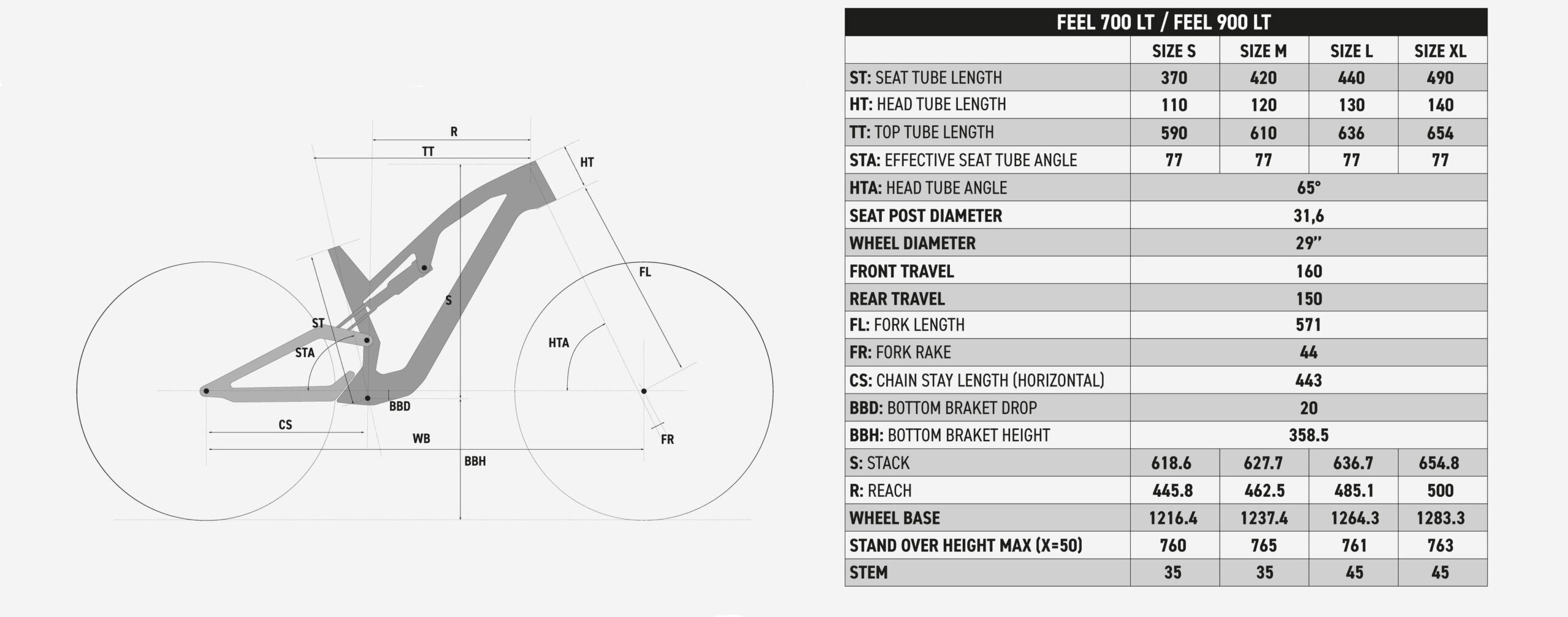 Quatre tailles disponibles comme d’habitude chez Rockrider pour ce Feel LT et une géométrie qui vise le « juste milieu » entre montagnes et collines, peut-être un peu moins tournée vers les gros dénivelés que d’autres modèles de débattement équivalent.