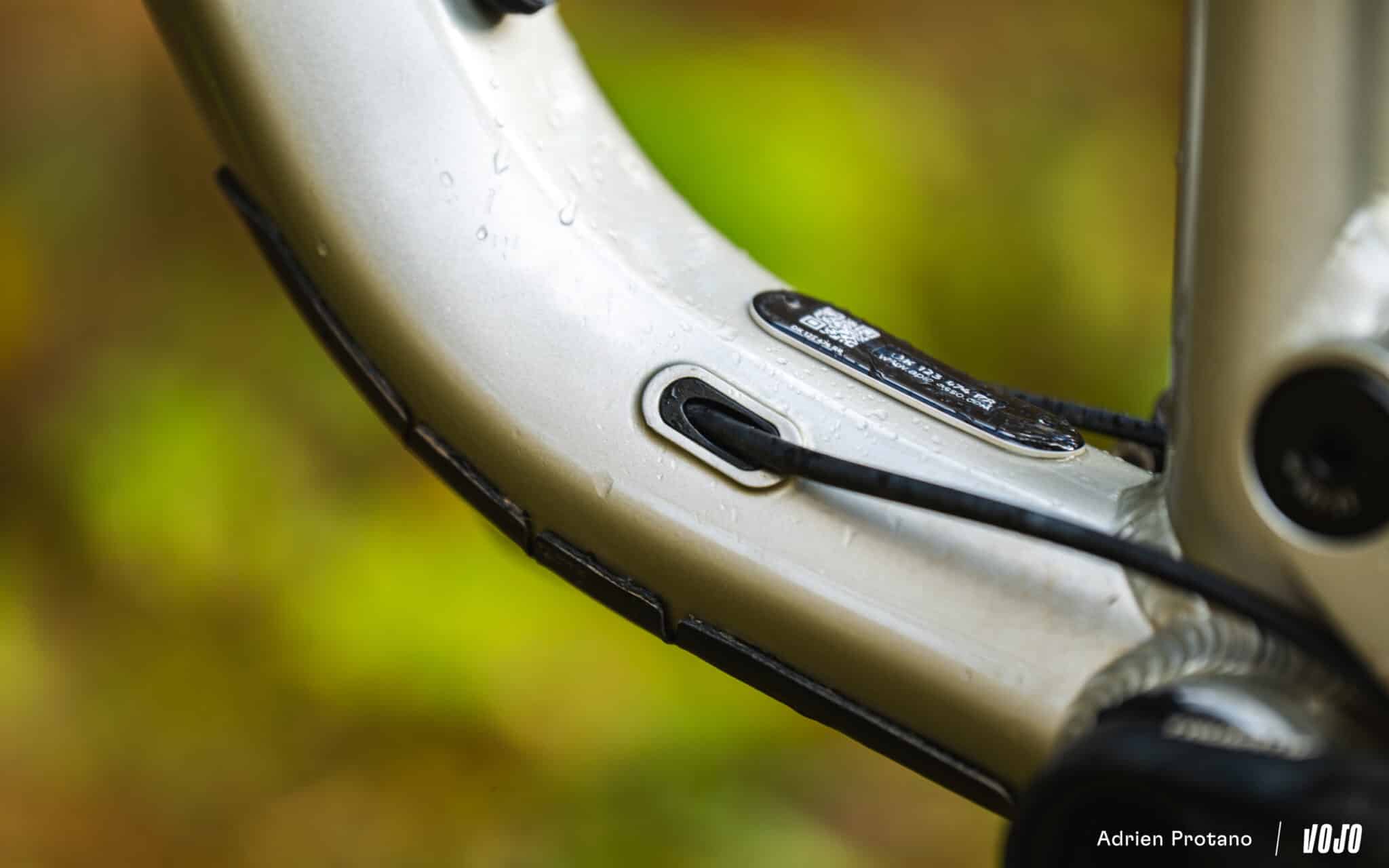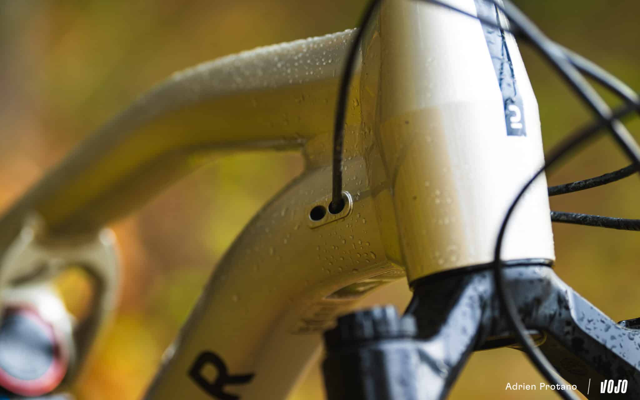 Côté standards, les câbles passent en interne comme c’est la norme mais via des ouïes en haut du tube diagonal plutôt qu’un système complexe à travers le jeu de direction. Le boîtier de pédalier est au format press-fit, ce qui est un peu dommage sur un cadre en aluminium, et la patte de dérailleur une Sram UDH, ce qui permet de monter toutes les transmissions à dérailleur du marché (montage classique sur la patte de dérailleur ou directement sur le cadre pour les Sram T-Type).