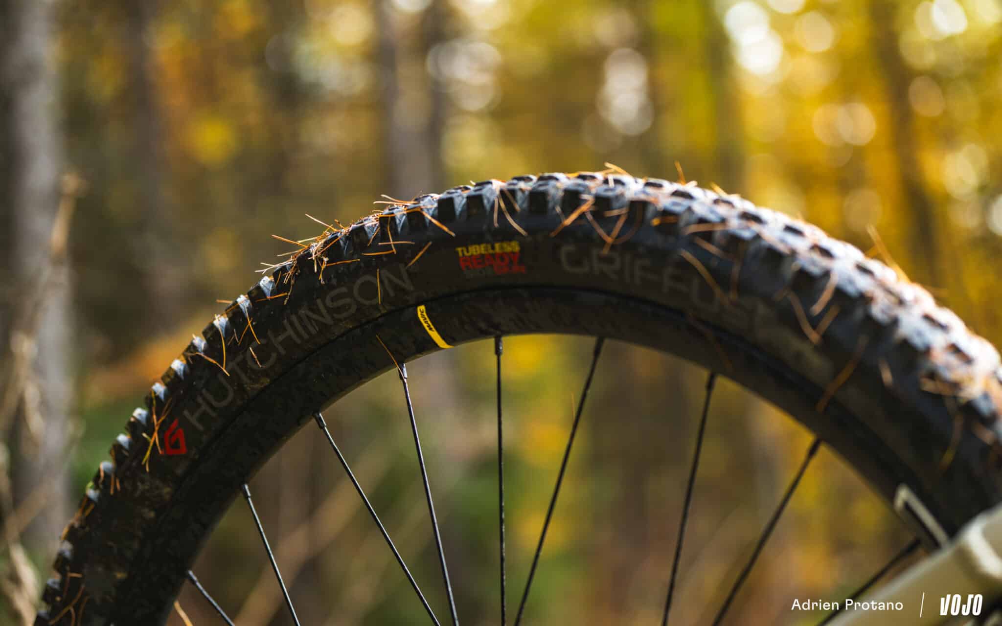 Malheureusement, on ne peut pas en dire autant des pneus. Les roues sont chaussées de pneus Hutchinson Griffus 2,4″ avec lesquels nous avons eu une très mauvaise expérience. D’abord sur le choix du profil : à nos yeux, le Griffus 2,4″ peut fonctionner à l’arrière mais il n’est pas assez agressif pour la roue avant, notamment dans les conditions humides. C’est le rôle du Griffus 2,5″ et à ce titre il est dommage que Rockrider n’ait pas choisi le « bon » couple de pneus.