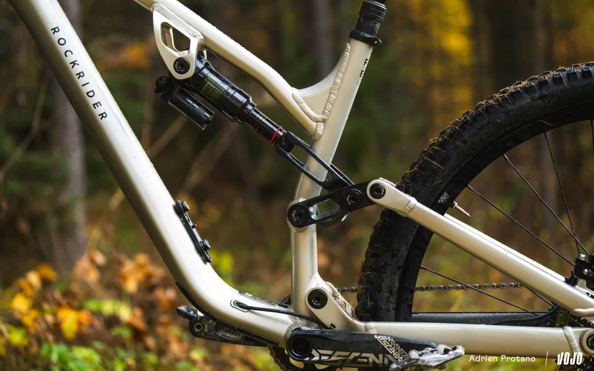 Très courante dans le monde du VTT, cette architecture a toutefois une particularité chez Rockrider : elle est systématiquement associée à un amortisseur au format Trunnion (vis de fixation directement sur le corps de l’amortisseur), plutôt qu’un amortisseur à oeillet. Ce couple a la réputation d’abîmer les amortisseurs prématurément, car l’architecture avec l’amortisseur horizontal actionné par un yoke (la pièce en Y qui fait la liaison avec la biellette) n’est pas la plus rigide latéralement et reporte donc les contraintes sur l’amortisseur.