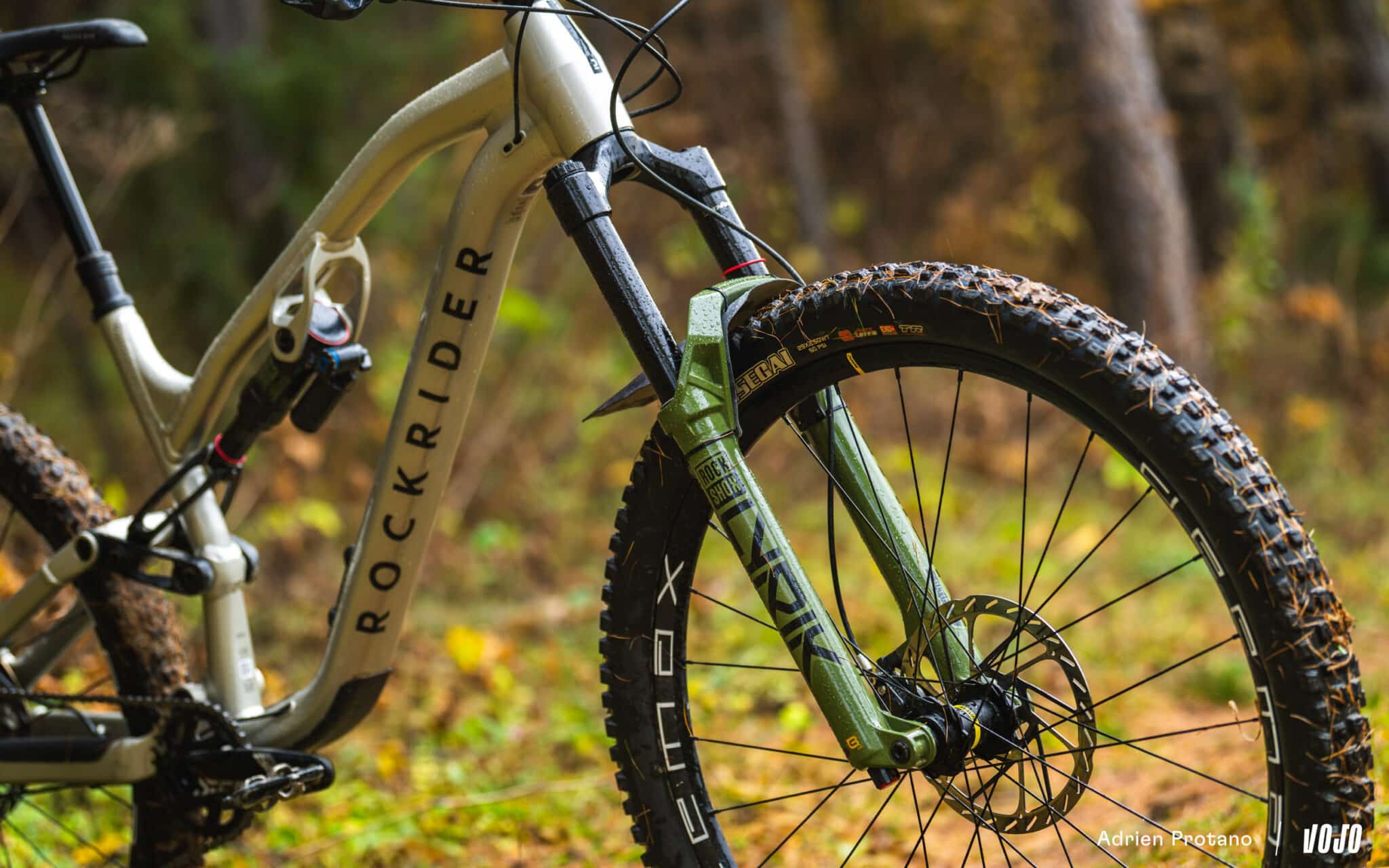 A ce prix, on a donc une transmission Sram NX Eagle, une fourche RockShox Yari RC, un amortisseur RockShox Super Deluxe Select, des freins Sram DB8 en disques Centerline de 200 mm, des roues Sun Ringle Duroc 35 (AV) / 30 (AR) et des pneus Rockrider Grip 500 2,4″.