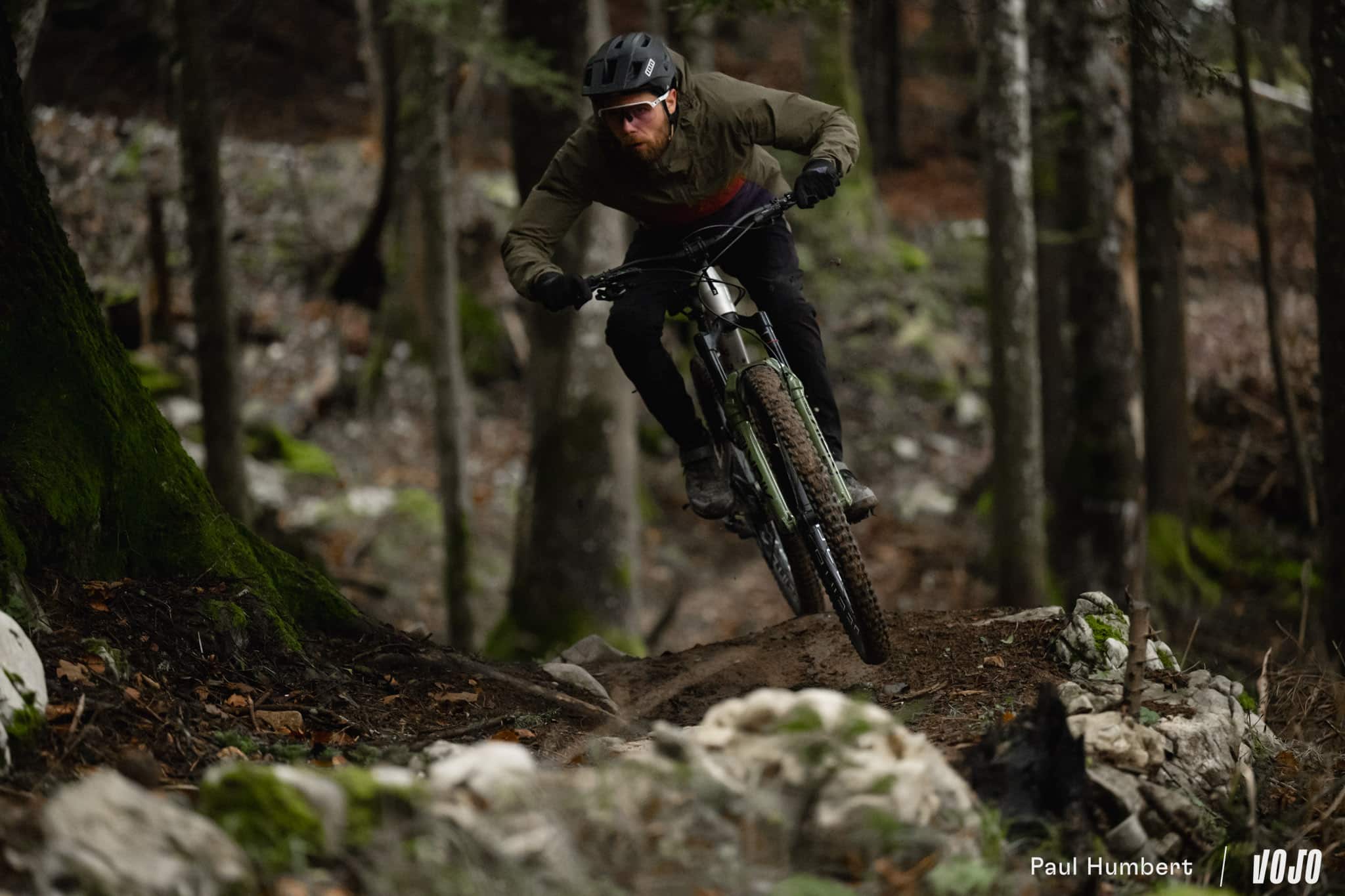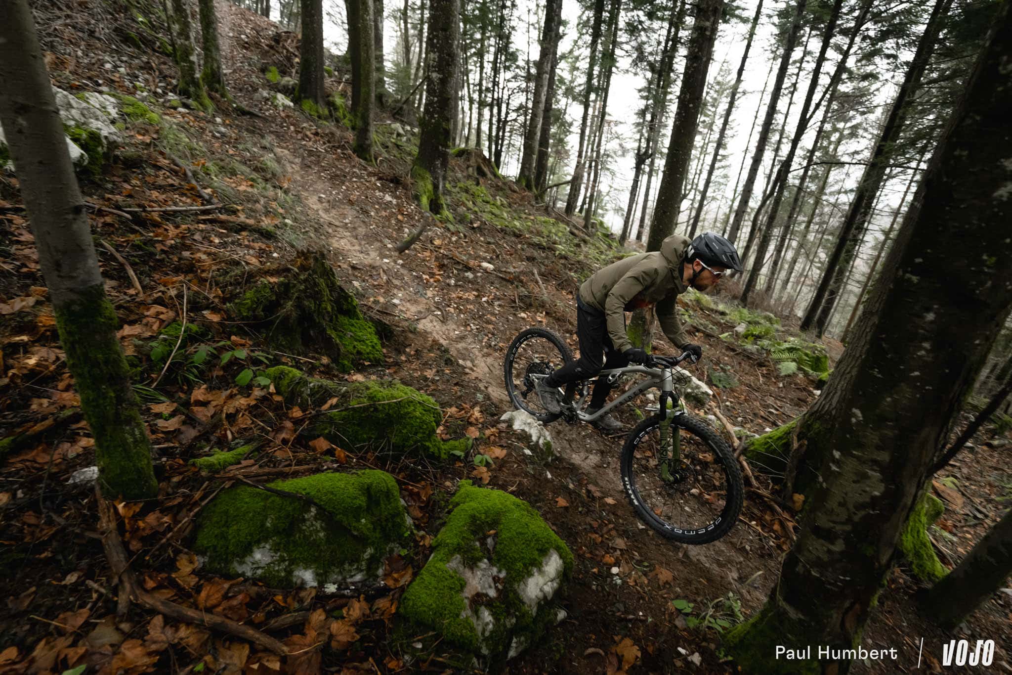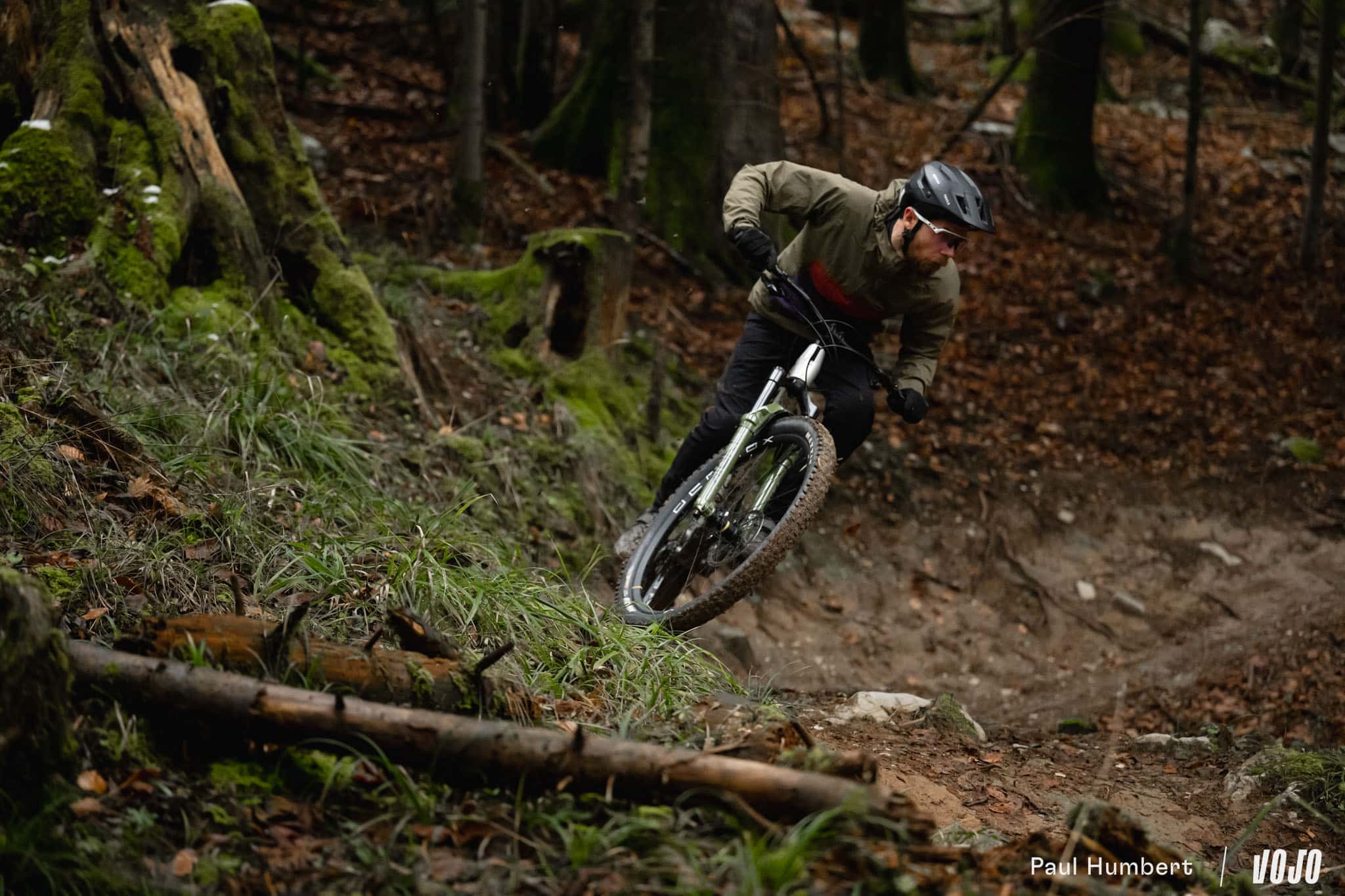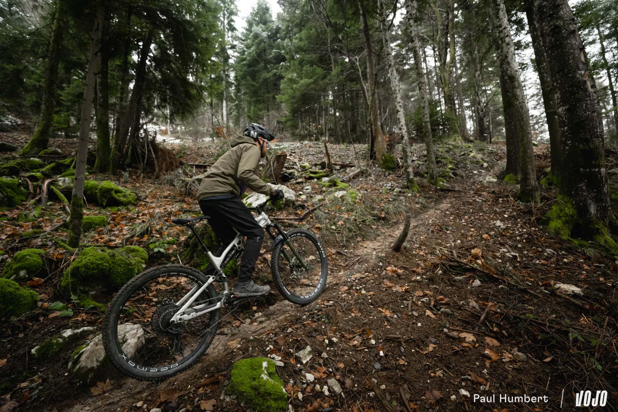 Comme prévu, on touche à ses limites dans la pente, surtout quand on vient y ajouter des gros impacts ou des franchissements : entre l’angle de direction de 65° et le boîtier de pédalier haut, on est vite sur l’avant et il faut bien gérer son freinage, sa trajectoire et sa position pour ne pas se faire surprendre. A cet égard, on peut regretter un peu le choix d’un boîtier de pédalier aussi haut. Le descendre de 10 à 15 mm aurait apporté un peu plus de stabilité longitudinale sans compromettre la maniabilité puisqu’on garde l’angle de 65° à l’avant.