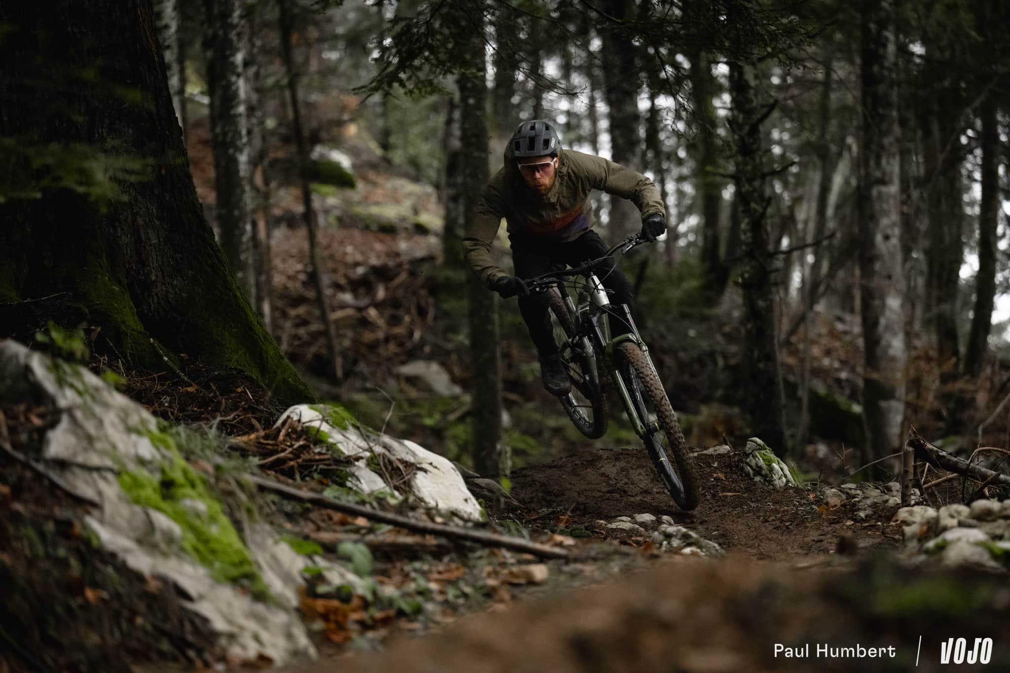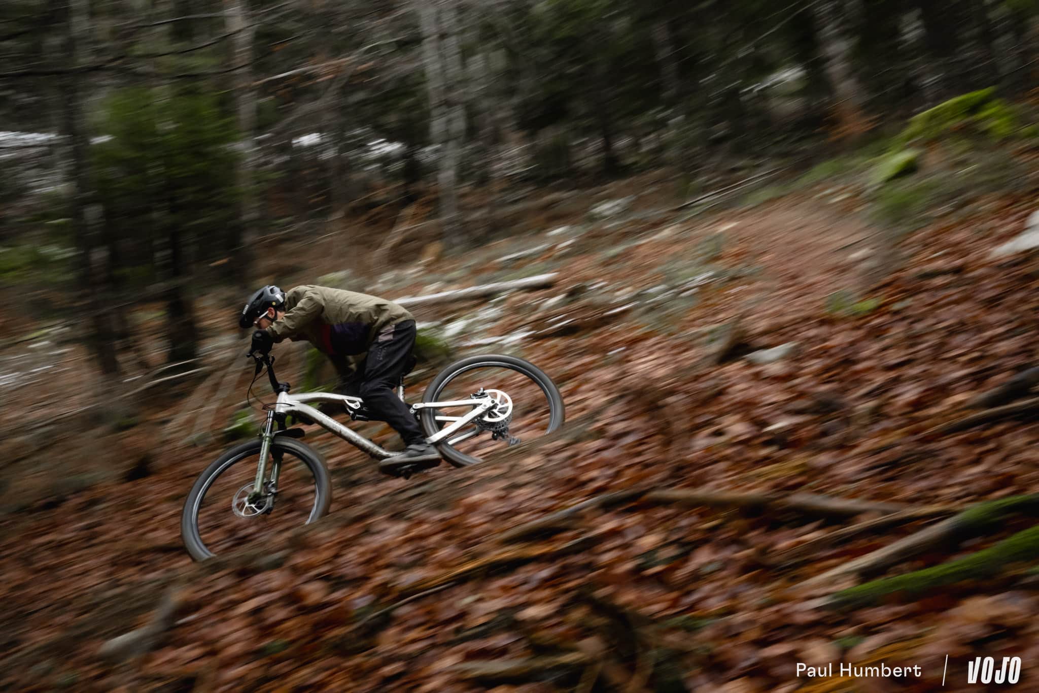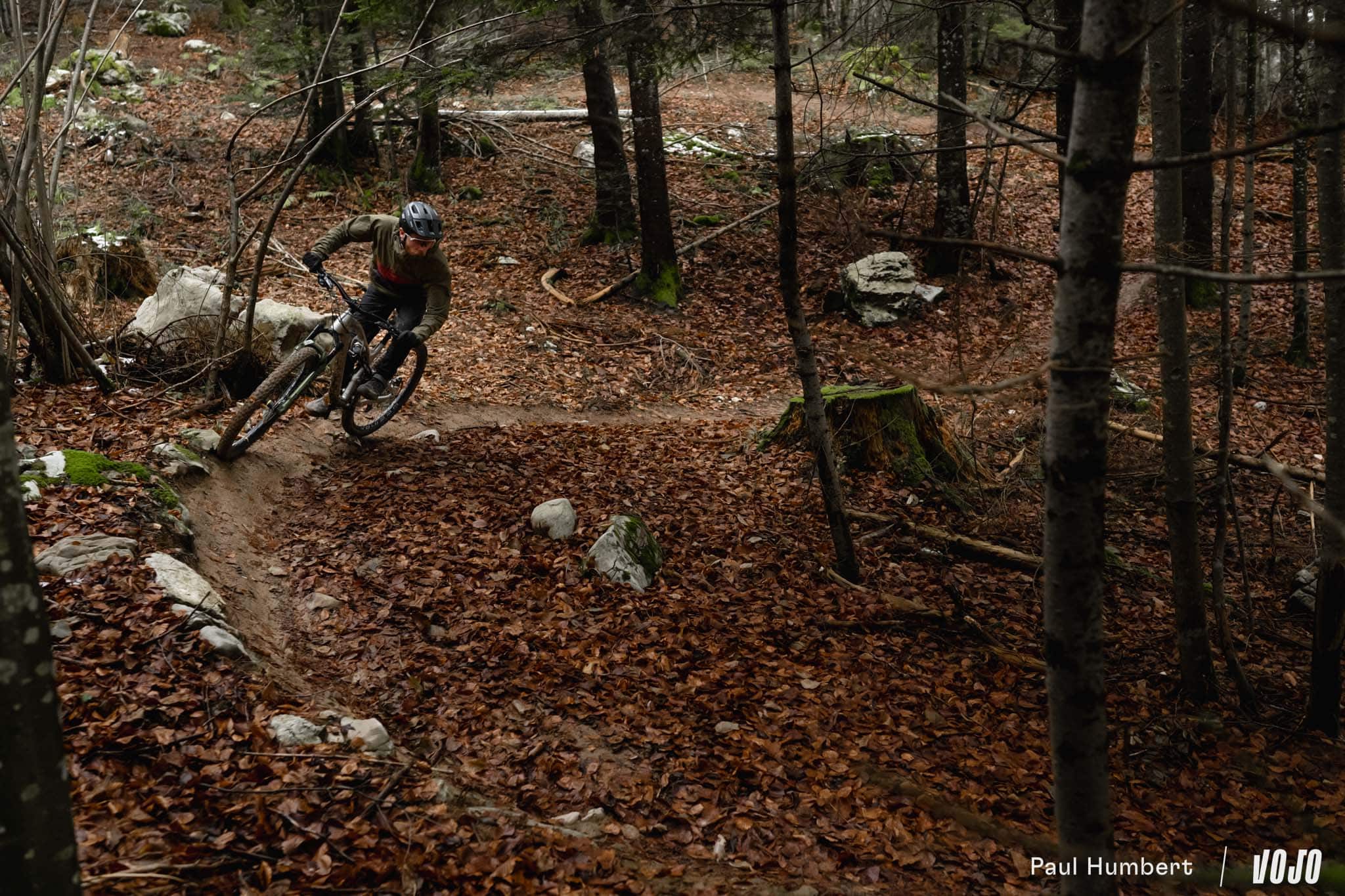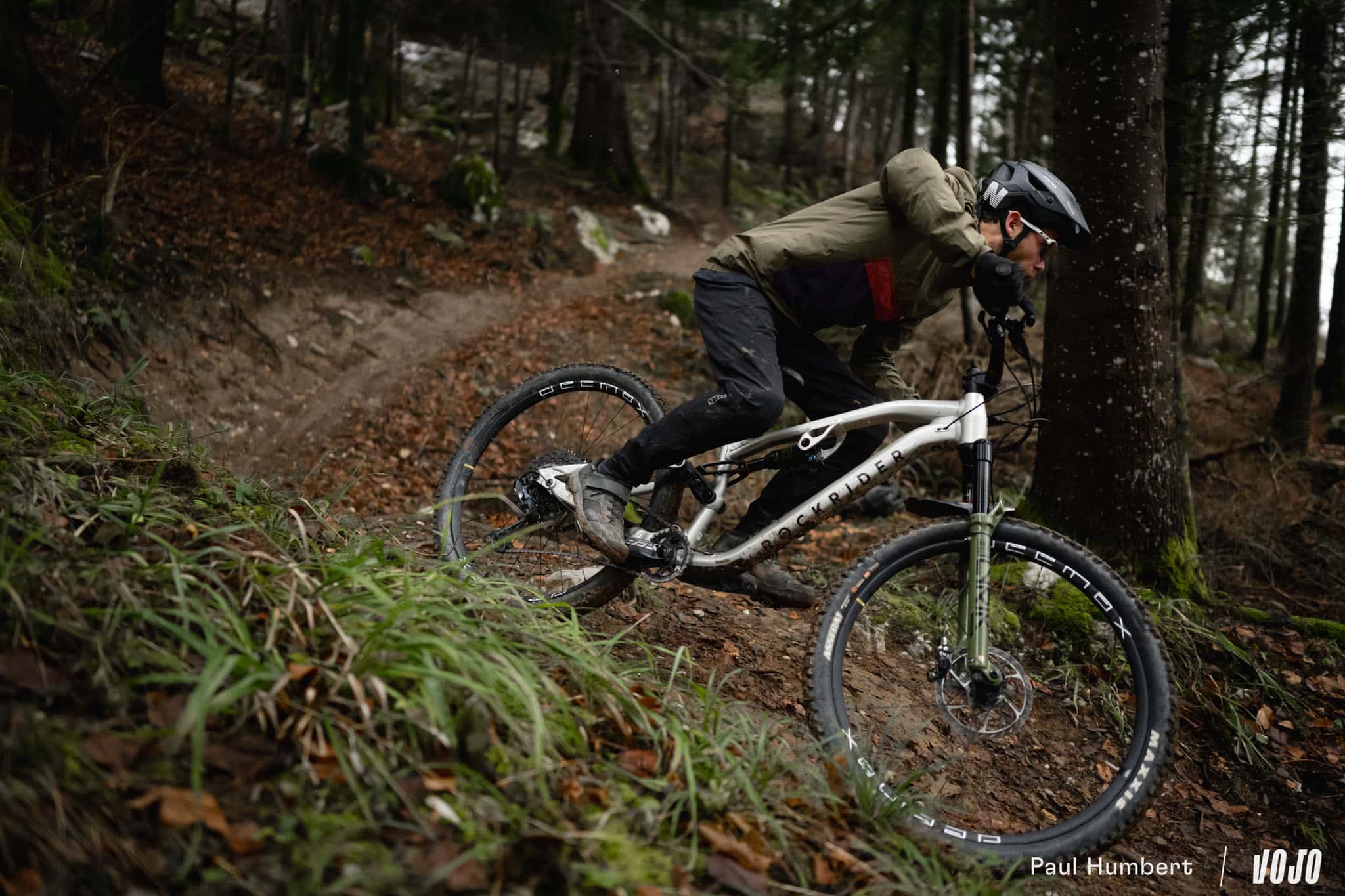 Comme prévu, on touche à ses limites dans la pente, surtout quand on vient y ajouter des gros impacts ou des franchissements : entre l’angle de direction de 65° et le boîtier de pédalier haut, on est vite sur l’avant et il faut bien gérer son freinage, sa trajectoire et sa position pour ne pas se faire surprendre. A cet égard, on peut regretter un peu le choix d’un boîtier de pédalier aussi haut. Le descendre de 10 à 15 mm aurait apporté un peu plus de stabilité longitudinale sans compromettre la maniabilité puisqu’on garde l’angle de 65° à l’avant.