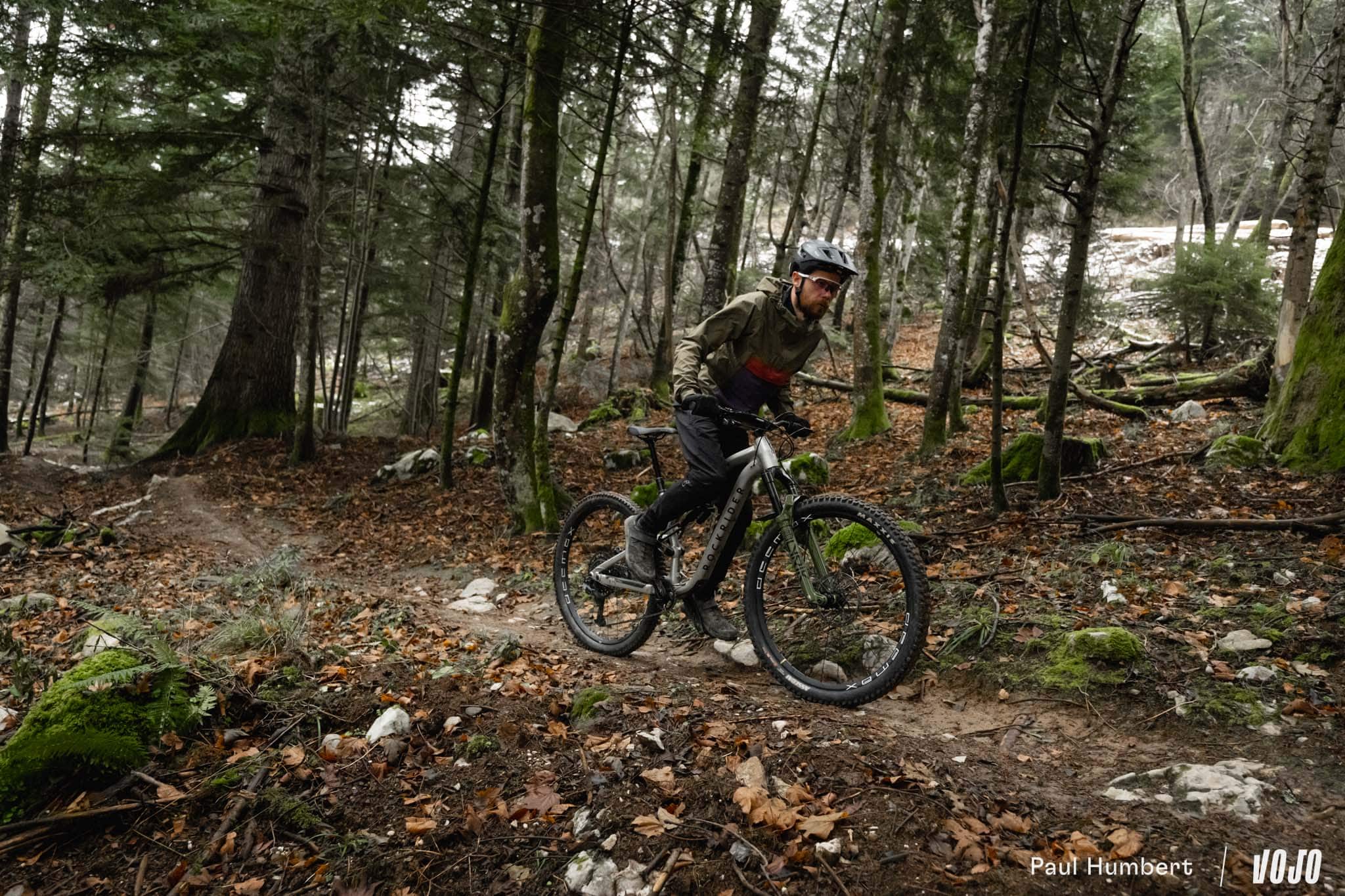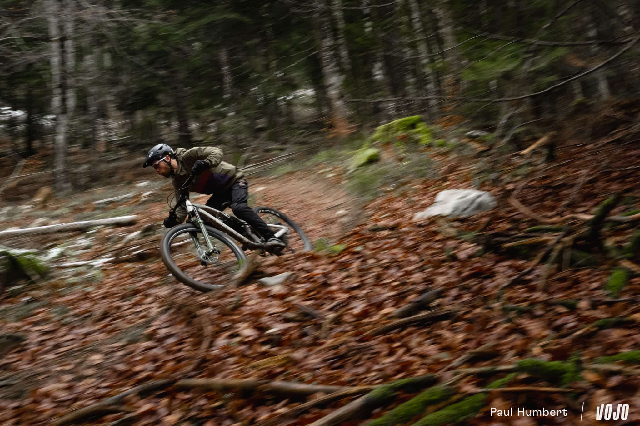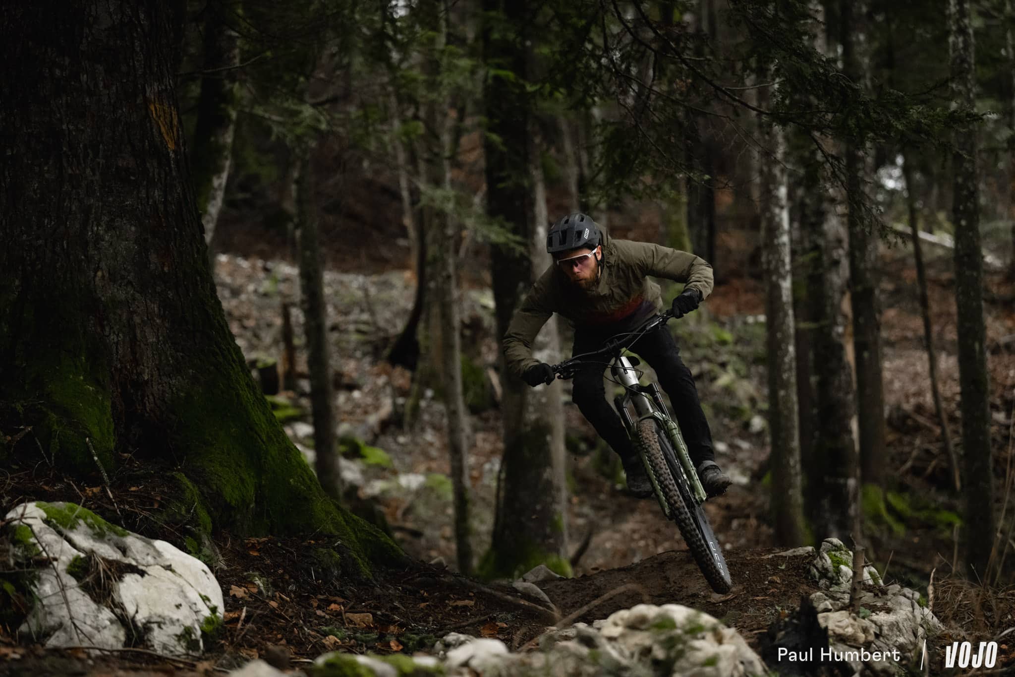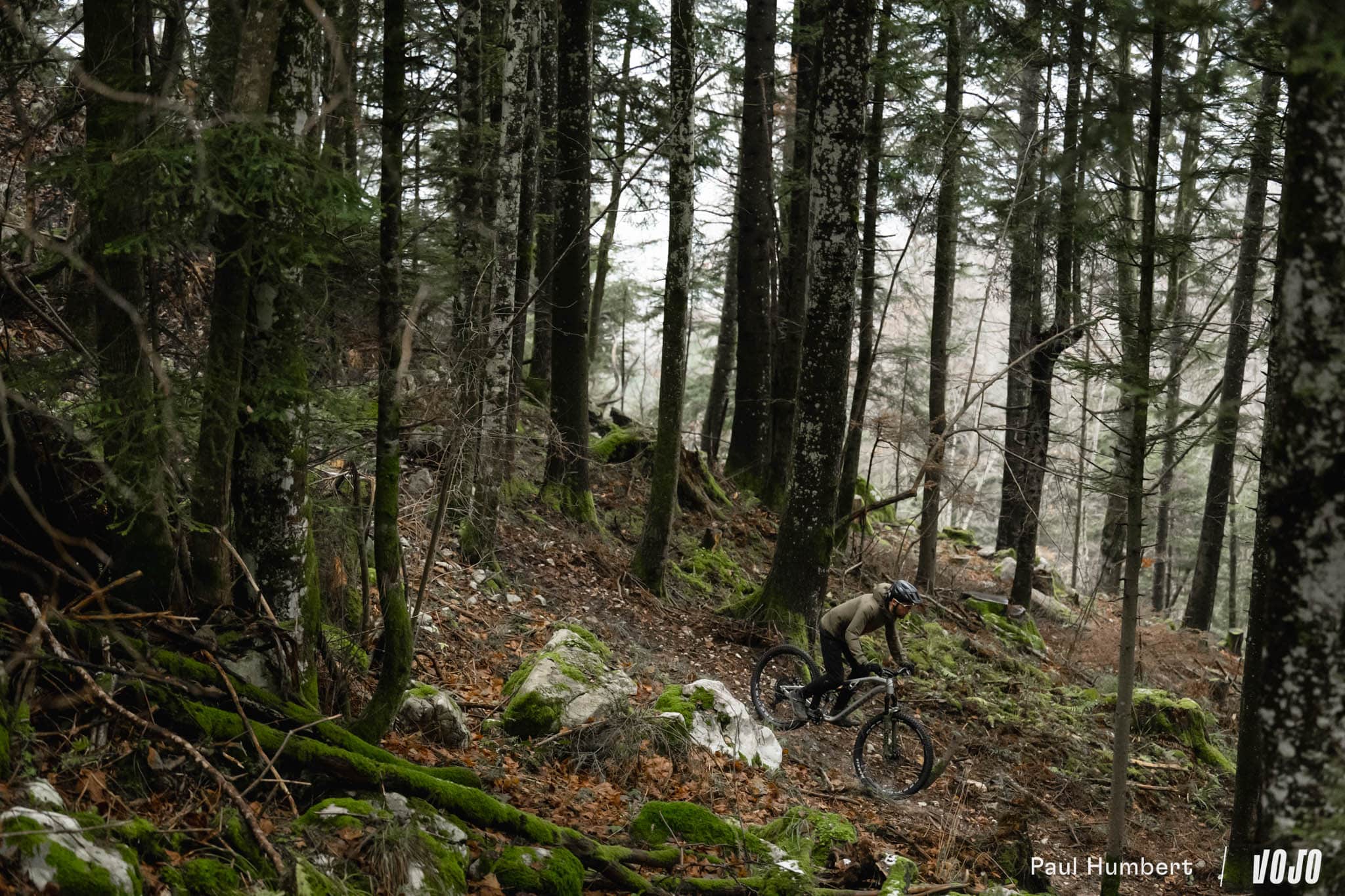 Comme prévu, on touche à ses limites dans la pente, surtout quand on vient y ajouter des gros impacts ou des franchissements : entre l’angle de direction de 65° et le boîtier de pédalier haut, on est vite sur l’avant et il faut bien gérer son freinage, sa trajectoire et sa position pour ne pas se faire surprendre. A cet égard, on peut regretter un peu le choix d’un boîtier de pédalier aussi haut. Le descendre de 10 à 15 mm aurait apporté un peu plus de stabilité longitudinale sans compromettre la maniabilité puisqu’on garde l’angle de 65° à l’avant.