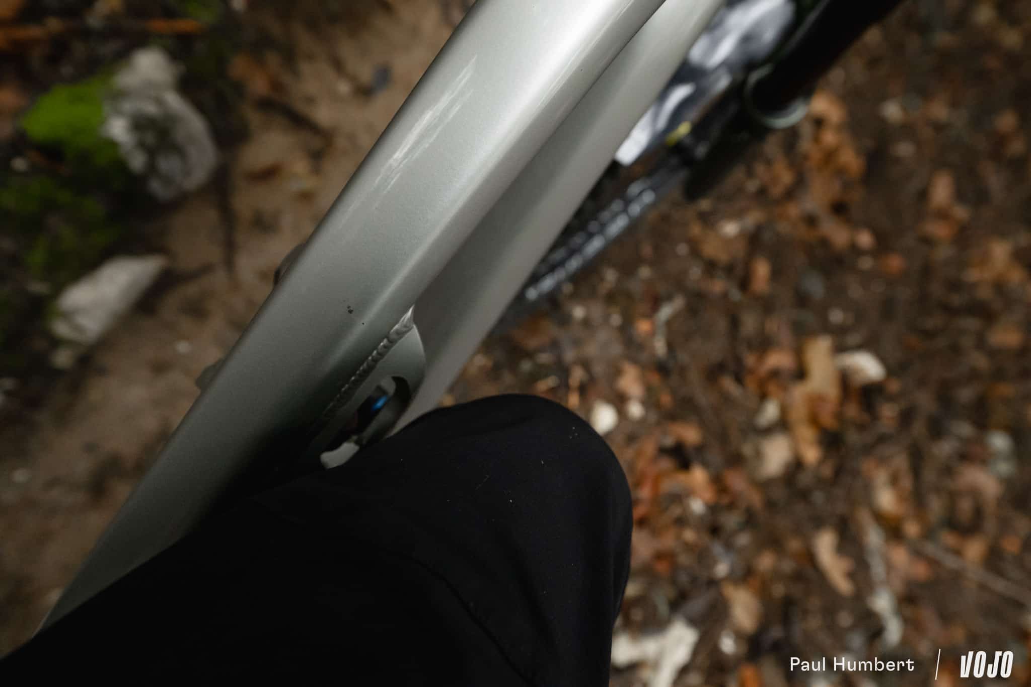 Finalement, le seul gros défaut de ce Feel 900 LT en action, outre les pneus, était assez inattendu. Il se trouve que la fixation d’amortisseur sur le tube supérieur est plutôt volumineuse… Trop volumineuse. Particulièrement proéminente et dotée de plusieurs arêtes saillantes, elle est un véritable piège pour les genoux qui n’arrêtent pas de s’y heurter et parfois de façon assez douloureuse. Genouillères obligatoires, et on ne plaisante pas ! Certes, quand on a 150 ou 160 mm de débattement ce n’est de toute façon pas une mauvaise chose mais on préfèrerait que ce soit un choix libre plutôt que quelque chose imposé par un design qui n’a pas été complètement éprouvé.