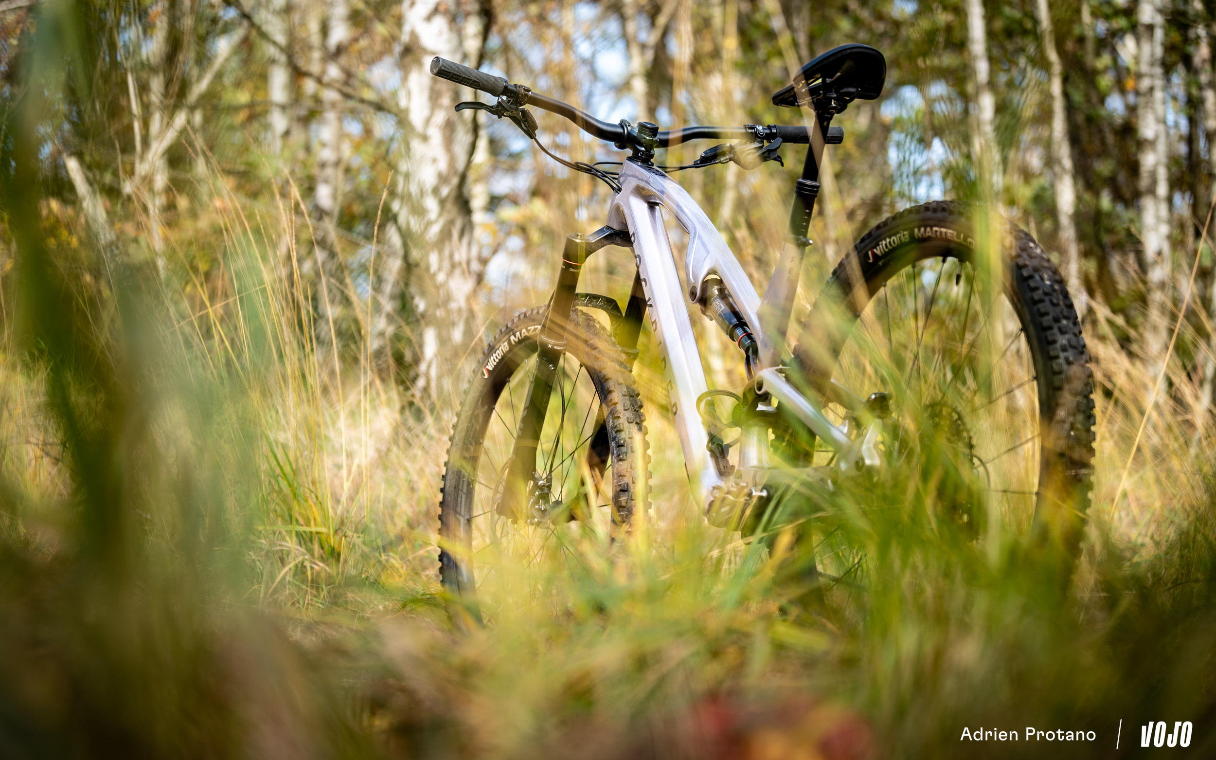 Cette souplesse du cadre passe également par la flexibilité du triangle arrière. À l’arrêt, on peut observer l’amortisseur bouger légèrement latéralement et l’ensemble de la biellette travailler. Si elle participe sans aucun doute au caractère du vélo et à son côté vivant, cette rigidité latérale pourrait poser question aux pilotes d’un gabarit plus important. À ce stade de notre essai, et après avoir éprouvé le châssis à de nombreuses reprises et par des testeurs aux profils bien différents les uns des autres, le cadre n’a cependant affiché aucune fatigue ou problème particulier.