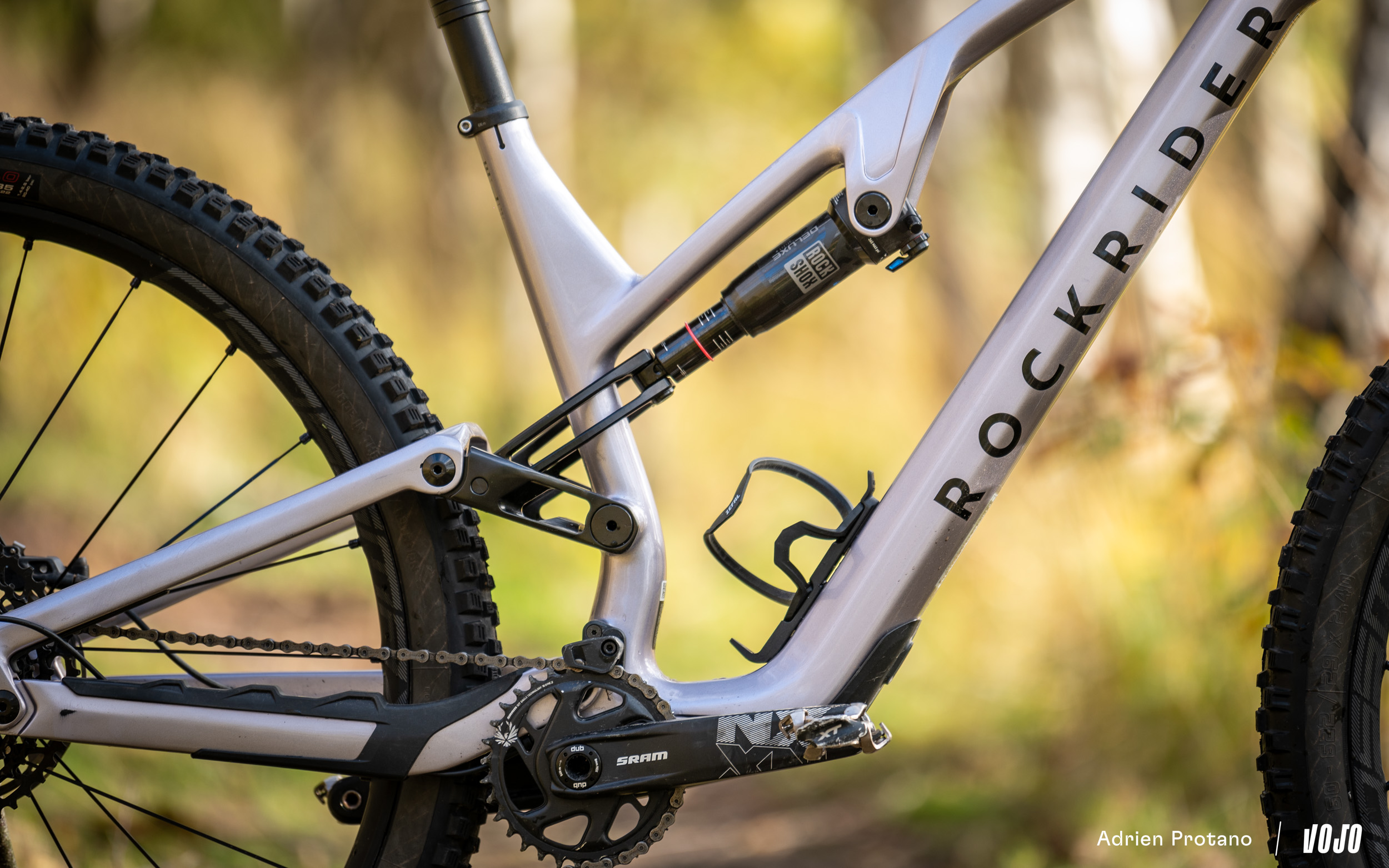 « Nous voulions un vélo agile et joueur, la cinématique a donc été choisie en conséquence », explique Rockrider. La cinématique est ainsi de type 4 Bar Linkage, et plus particulièrement Horst Link. Si cela ne vous est pas familier, le lexique est juste ici ! Au-delà de la cinématique, l’esthétique n’est pas sans rappeler certains Kona d’il y a quelques années. Il y a pire comme référence. La longueur du Yoke (qui relie la biellette à l’amortisseur) combinée à un amortisseur à fixation Trunion côté cadre peut poser question au niveau durabilité, surtout que, comme nous l’expliquerons plus loin, le cadre est assez flexible de l’arrière. Nous avons testé le vélo sur 4 mois sans rencontrer de problème, on sait aussi que Rockrider effectue des tests fort poussés pour sur ses vélos (plus que beaucoup de constructeurs) et les retours d’utilisateurs montrent que la marque a globalement un SAV efficace mais on restera attentifs à ce point sur le long terme.