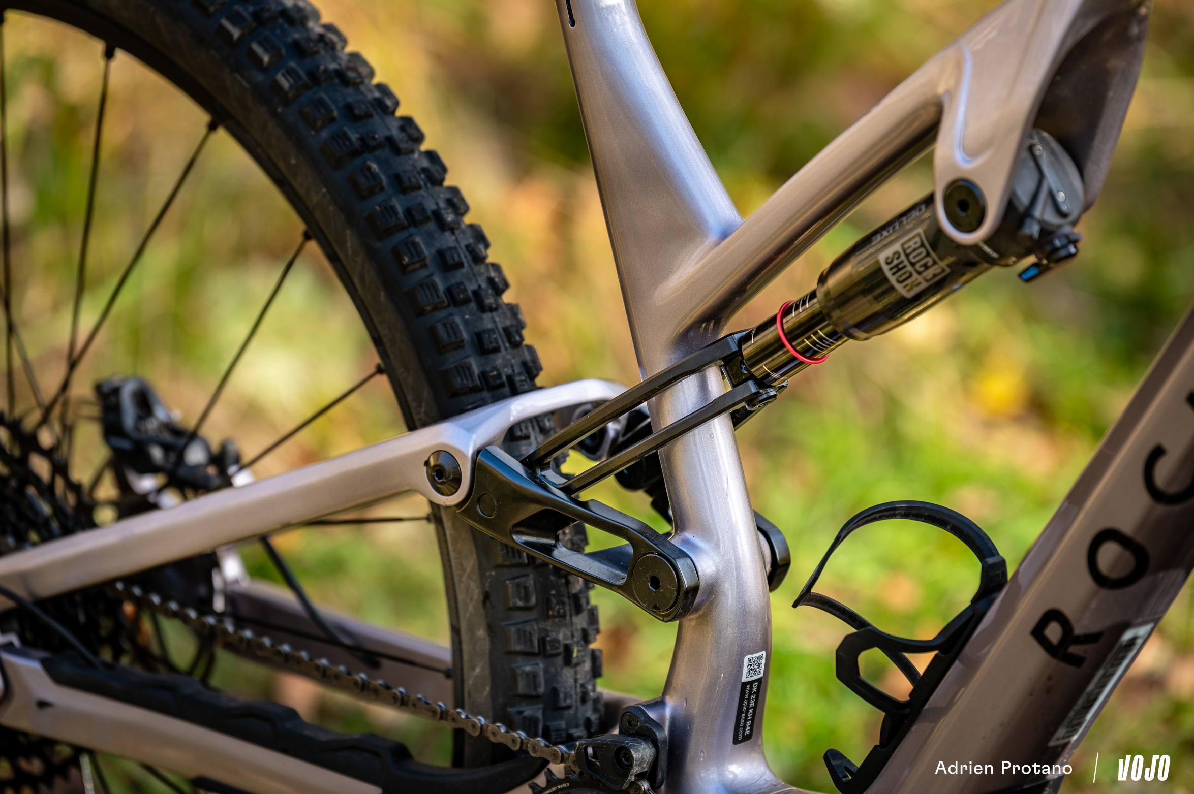 Cette souplesse du cadre passe également par la flexibilité du triangle arrière. À l’arrêt, on peut observer l’amortisseur bouger légèrement latéralement et l’ensemble de la biellette travailler. Si elle participe sans aucun doute au caractère du vélo et à son côté vivant, cette rigidité latérale pourrait poser question aux pilotes d’un gabarit plus important. À ce stade de notre essai, et après avoir éprouvé le châssis à de nombreuses reprises et par des testeurs aux profils bien différents les uns des autres, le cadre n’a cependant affiché aucune fatigue ou problème particulier.