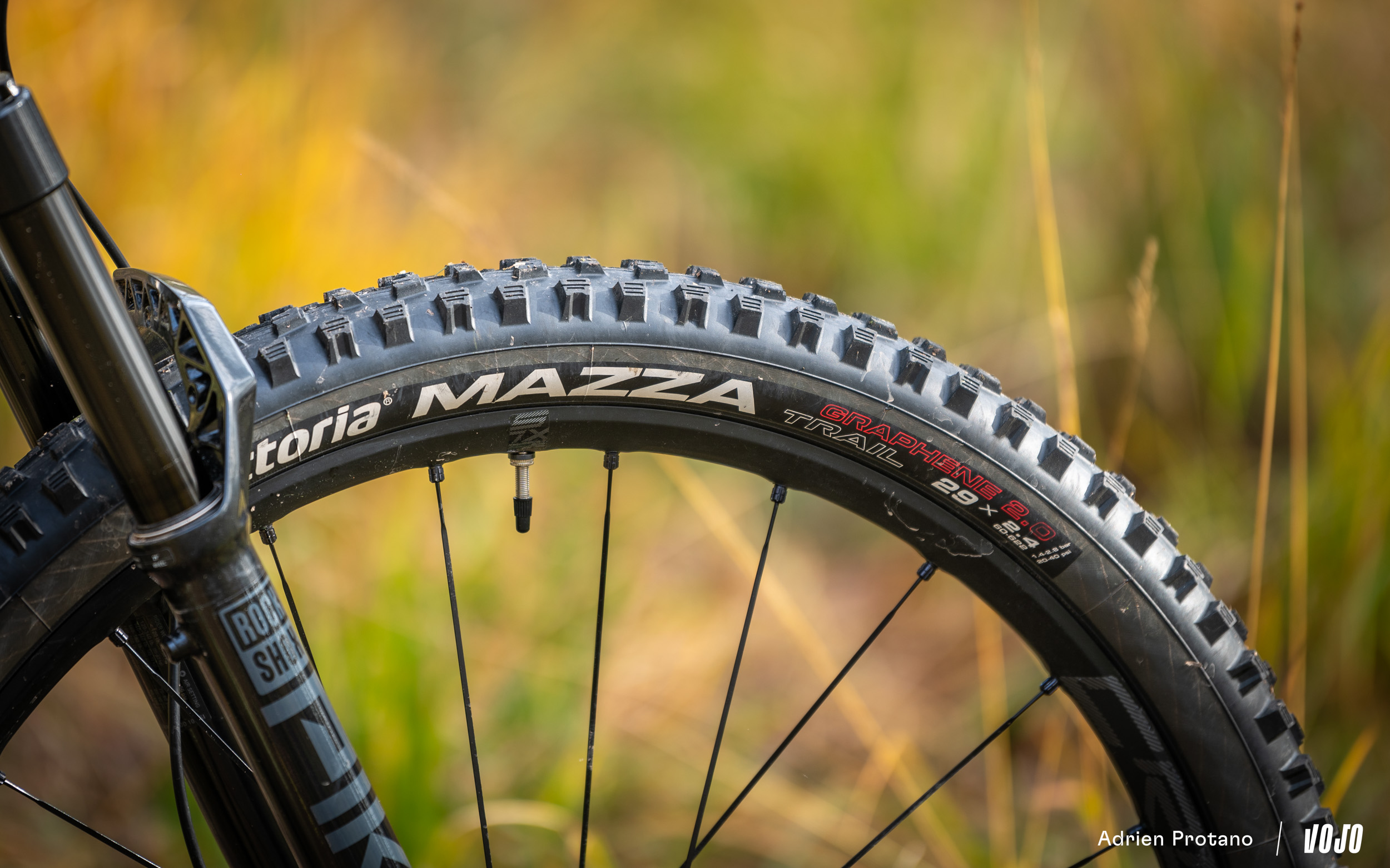 Celles-ci sont chaussées de pneumatiques Vittoria et non Rockrider… « On voulait doter le Feel 900 de pneus différenciés à l’avant et à l’arrière, or nous n’avons à ce stade encore qu’un seul pneu polyvalent à la gamme », explique Rockrider. Voilà pourquoi la marque française a opté pour un Vittoria Mazza à l’avant et un Martello à l’arrière, tous deux en 2.35 et gomme Graphene 2.0