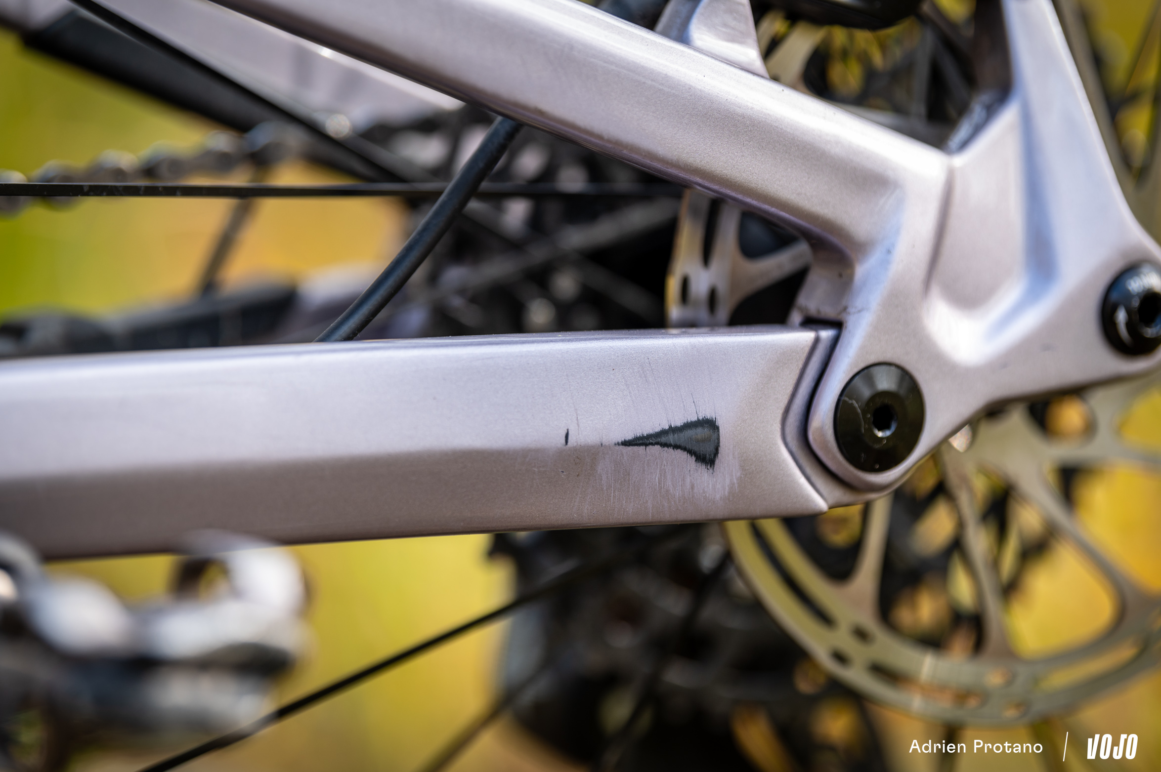 Nous devons par contre mettre la lumière, d’entrée de jeu, sur un problème rencontré lors de notre période de test : la peinture a rapidement laissé place au cadre brut à certains points de contact ou frottements. C’est le cas notamment au niveau de la douille de direction où la Durit de frein avant est venue frotter sur la peinture, ou encore au niveau des bases arrière suite aux frottements avec l’arrière des chaussures. Une protection de type film plastique est toujours recommandée, mais il semblerait qu’elle soit ici plus que nécessaire.