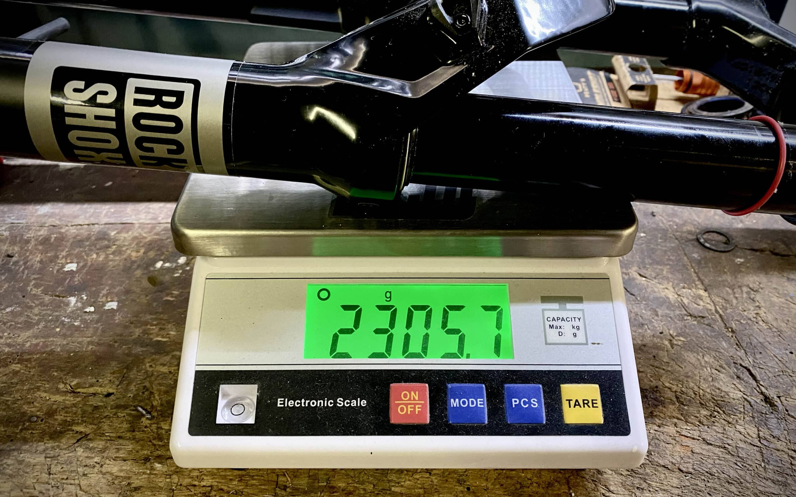 C’est sans doute une des différences les plus visibles entre les modèles plus haut de gamme comme la Lyrik et la nouvelle RockShox Psylo Gold RC : le poids ! Tout se joue dans les détails, avec une chasse au gramme bien moins poussée que sur une Lyrik, et cela occasionne une différence d’un bon 300 g sur la balance. On soulignera tout de même que nous avons pesé notre Psylo de test à 2305 g pivot non coupé, soit 15 g de moins que le poids annoncé par RockShox.