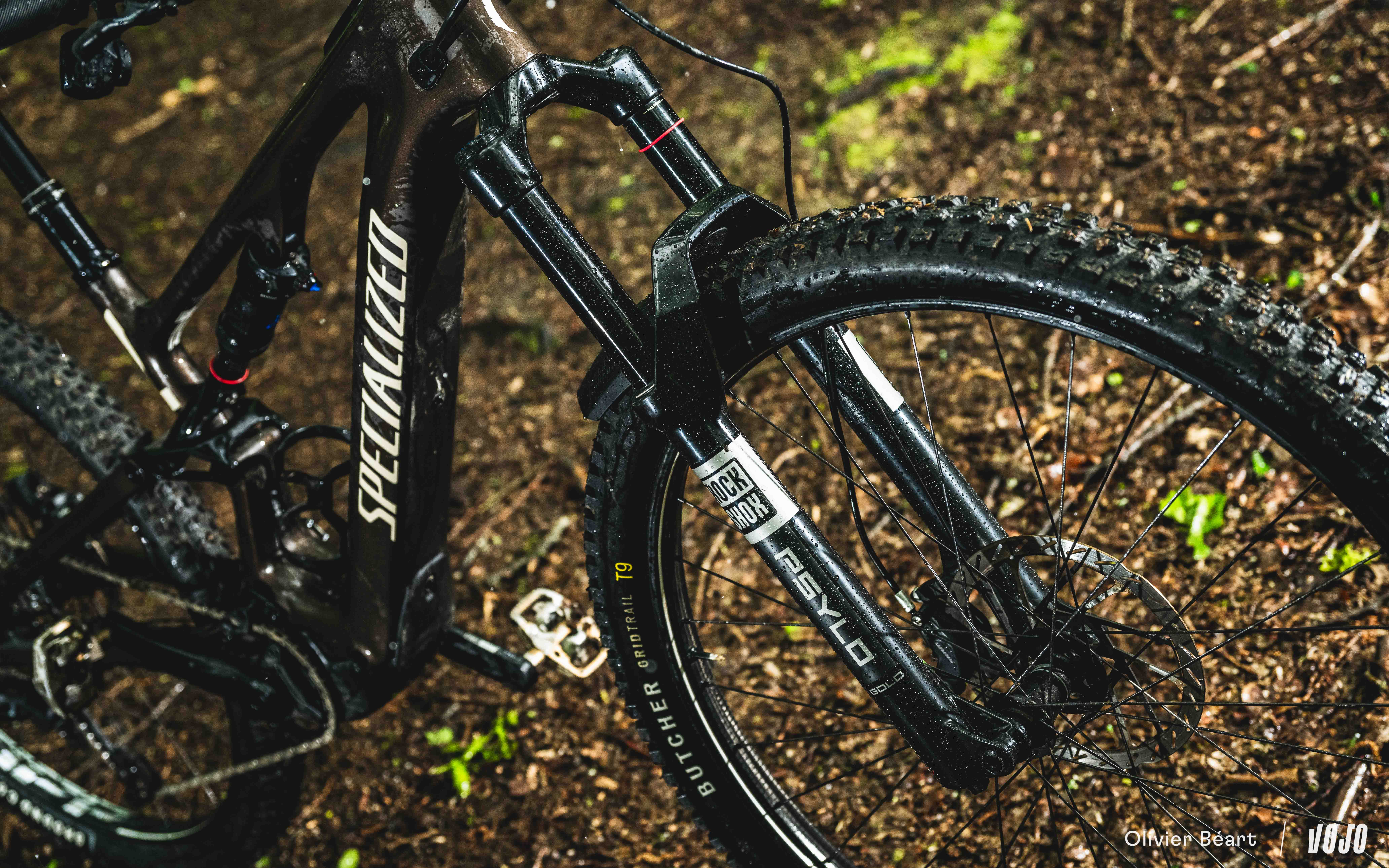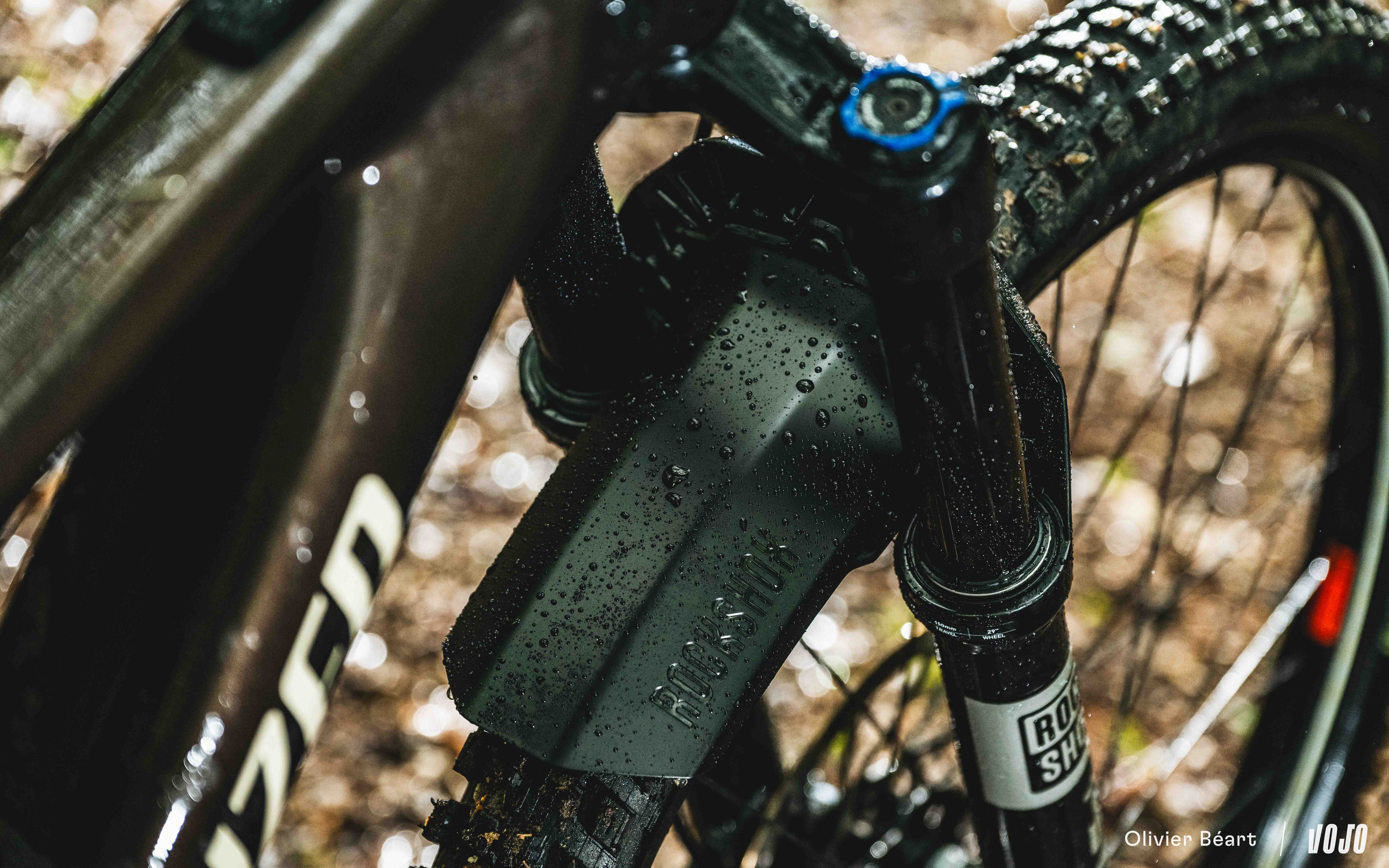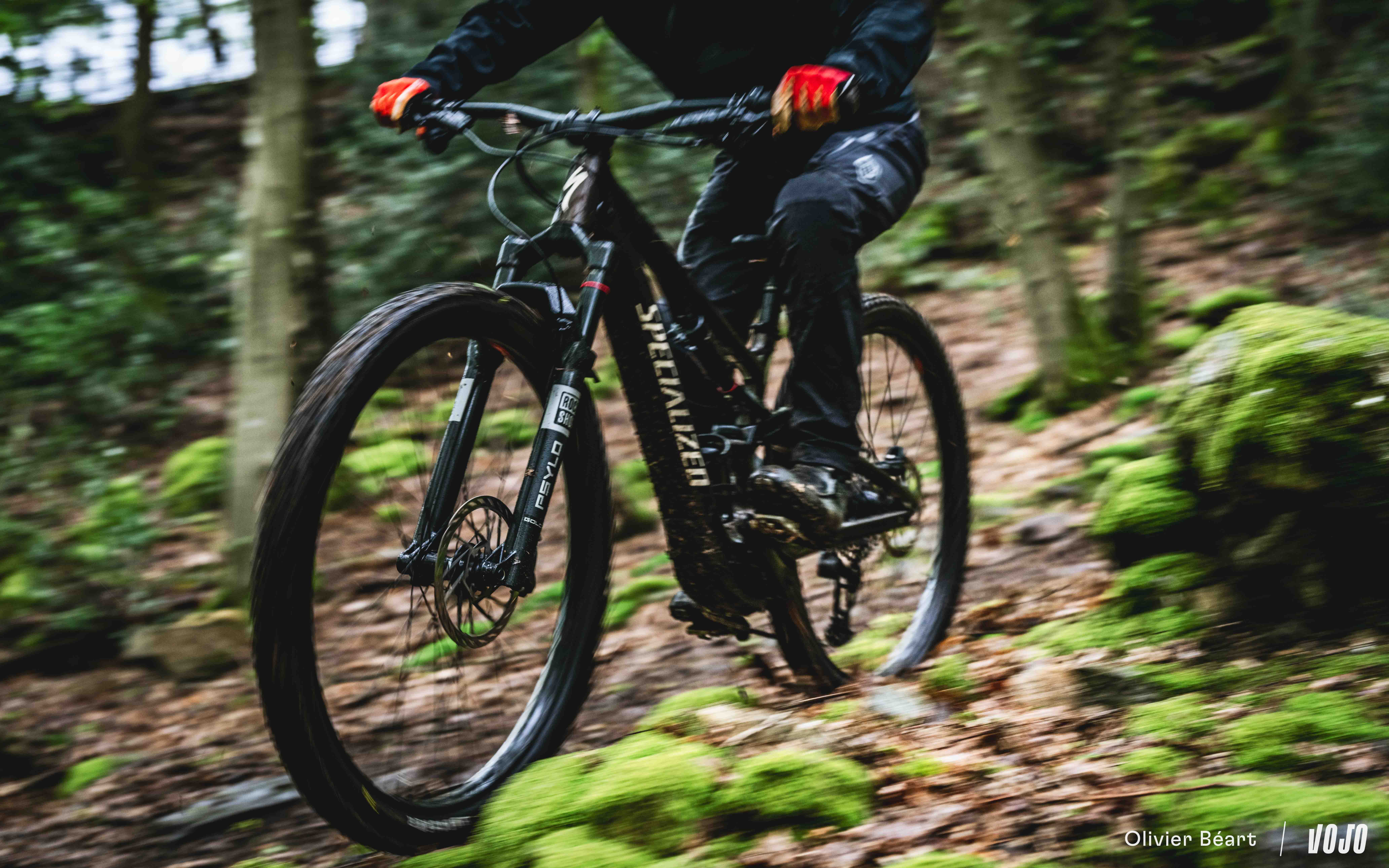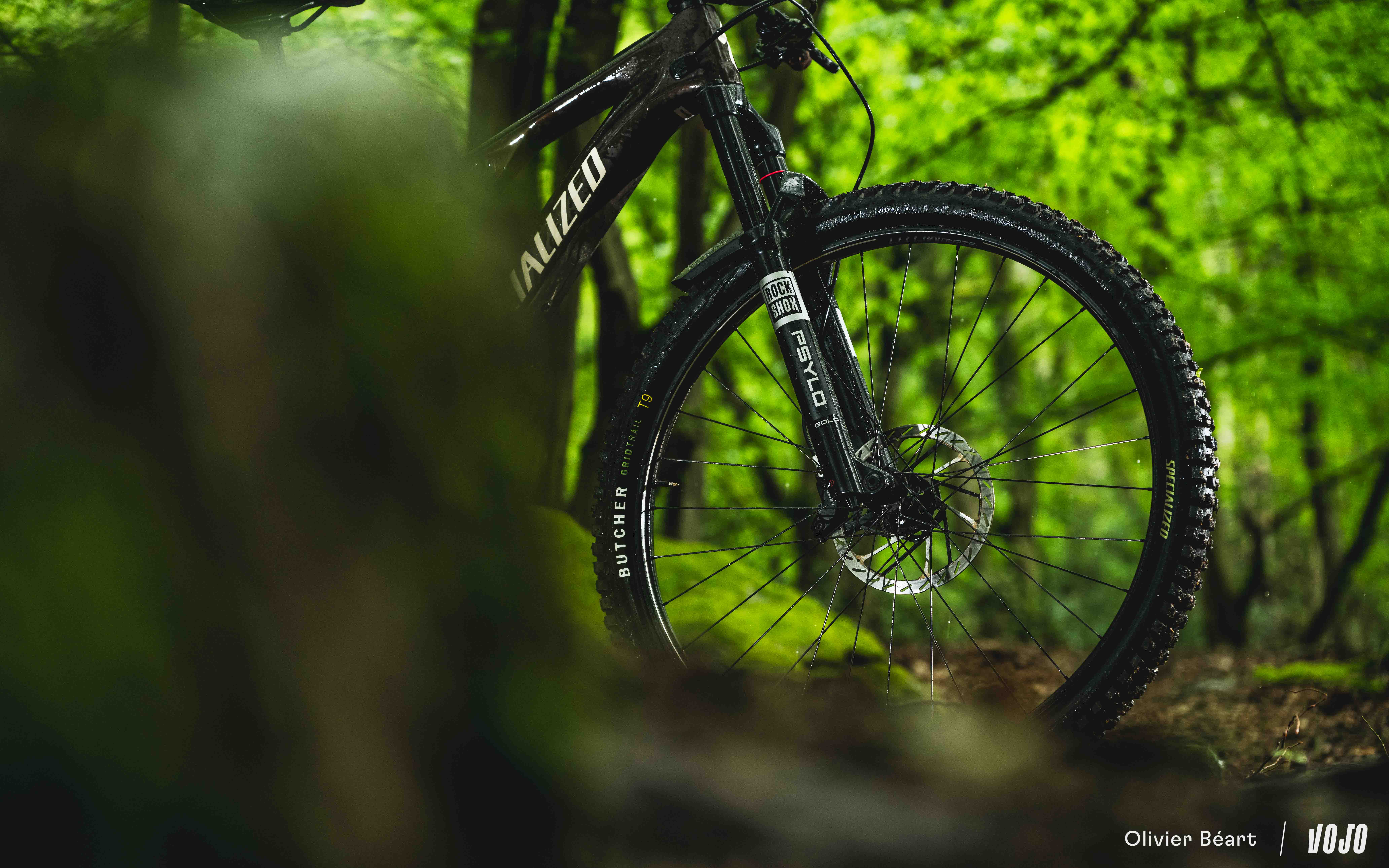 En descente par contre, la RockShox Psylo tout juste « sortie de sa boîte » manque de maintien et on a tendance à aller très vite au fond du débattement. Pour remédier à ça, nous avons tenté de rouler sur le mode intermédiaire de la cartouche hydraulique, mais on sent qu’il est davantage destiné à des sections de pédalage et de plat car on perd en lecture du terrain. Oublions donc l’action sur l’hydraulique. La solution vient plutôt de l’ajout de « volume spacers » dans la chambre d’air. Avec deux, voire trois de ces tokens, le ressort est moins linéaire et on a une fourche qui consomme moins son débattement en fin de course, sans rien perdre de sa sensibilité en début de course.
