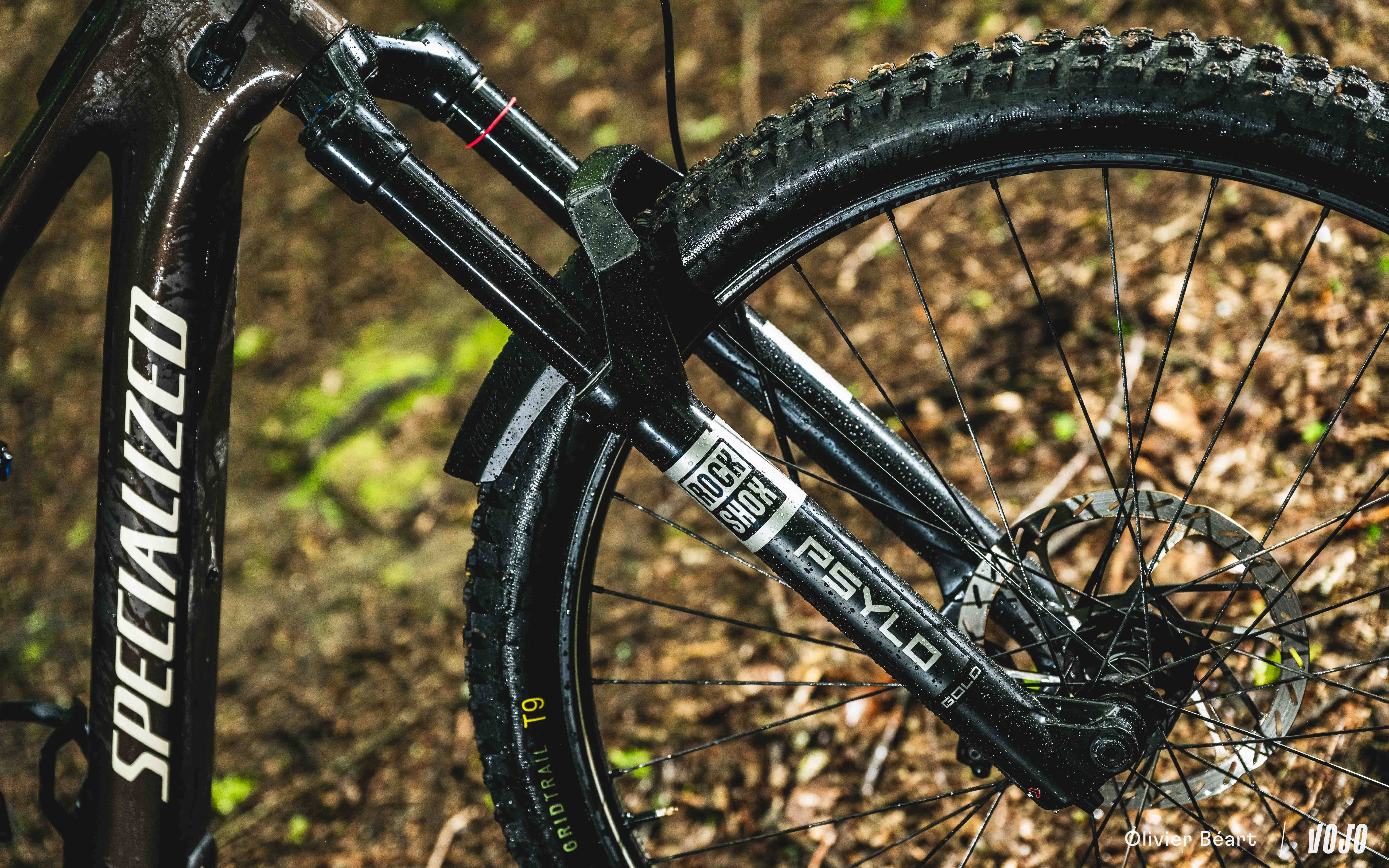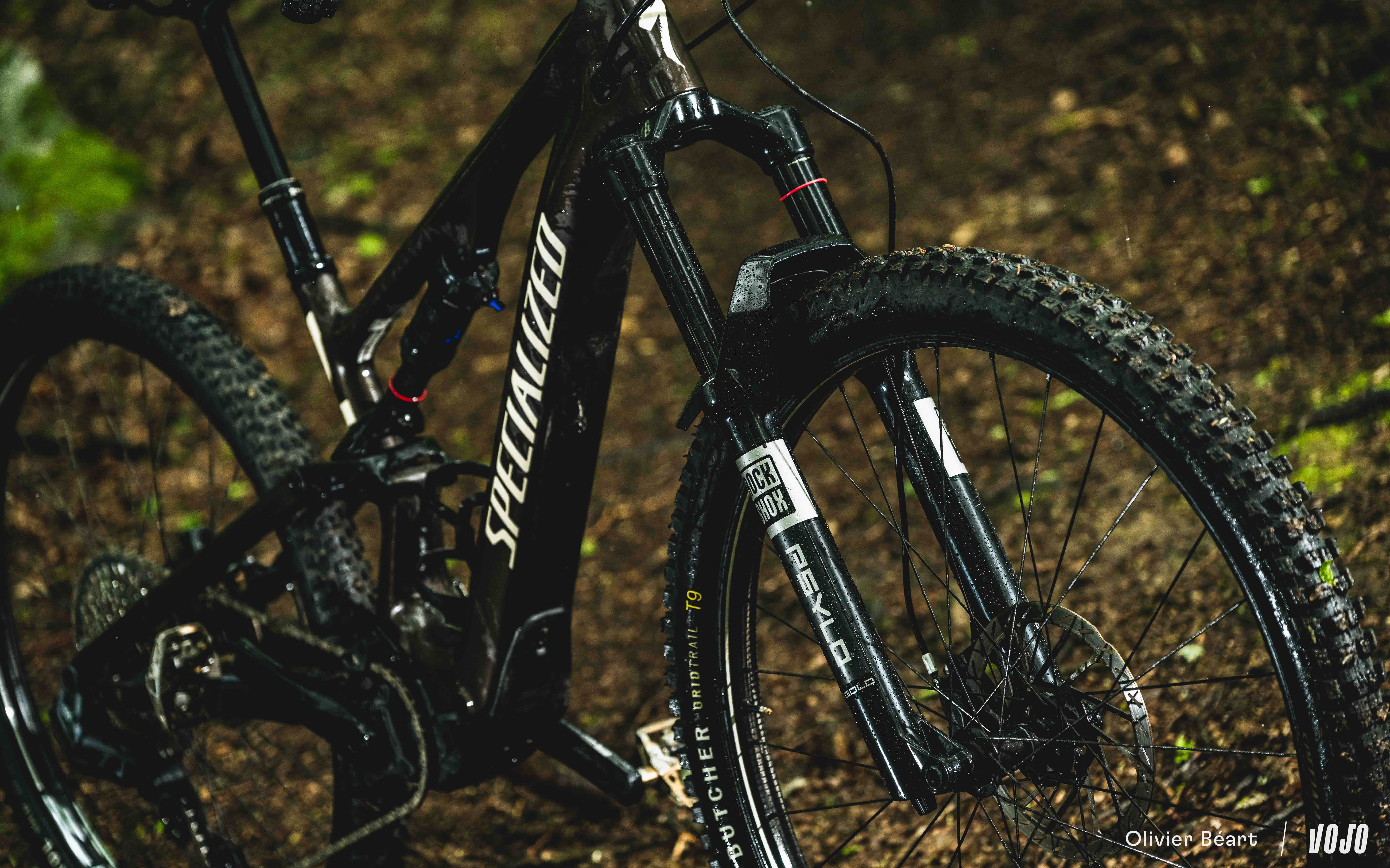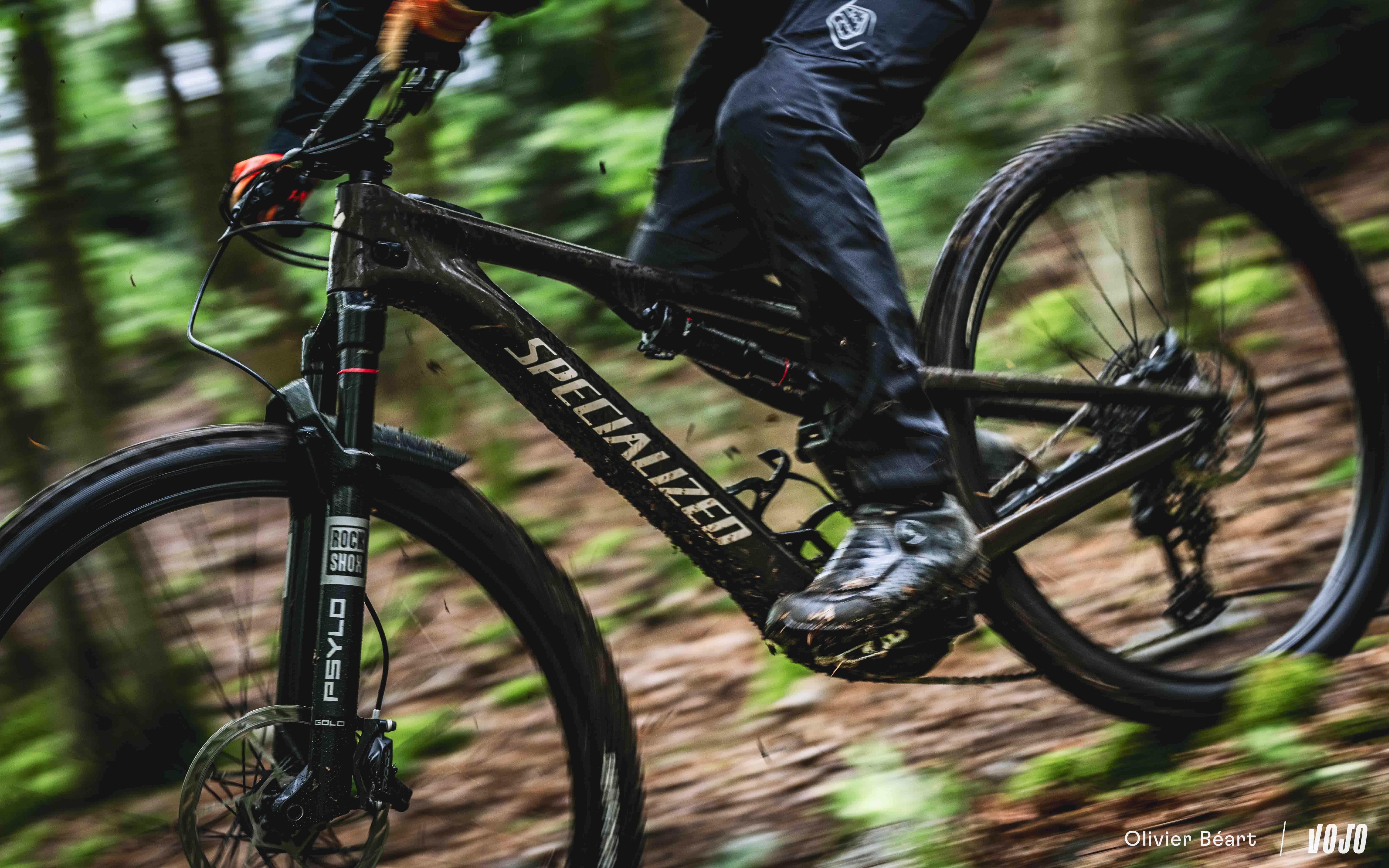 En descente par contre, la RockShox Psylo tout juste « sortie de sa boîte » manque de maintien et on a tendance à aller très vite au fond du débattement. Pour remédier à ça, nous avons tenté de rouler sur le mode intermédiaire de la cartouche hydraulique, mais on sent qu’il est davantage destiné à des sections de pédalage et de plat car on perd en lecture du terrain. Oublions donc l’action sur l’hydraulique. La solution vient plutôt de l’ajout de « volume spacers » dans la chambre d’air. Avec deux, voire trois de ces tokens, le ressort est moins linéaire et on a une fourche qui consomme moins son débattement en fin de course, sans rien perdre de sa sensibilité en début de course.