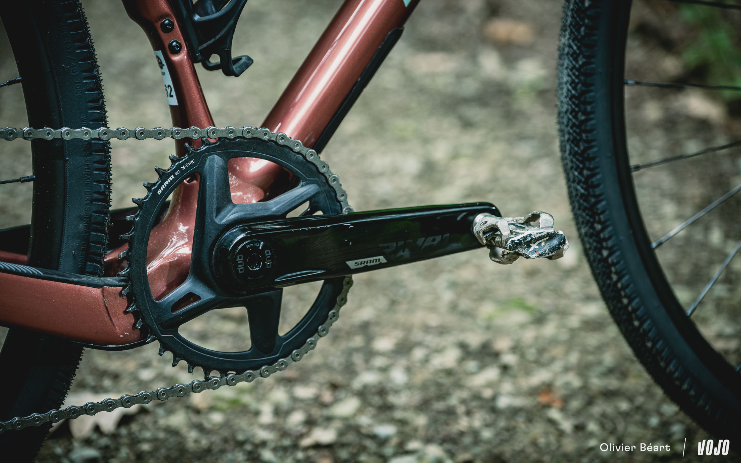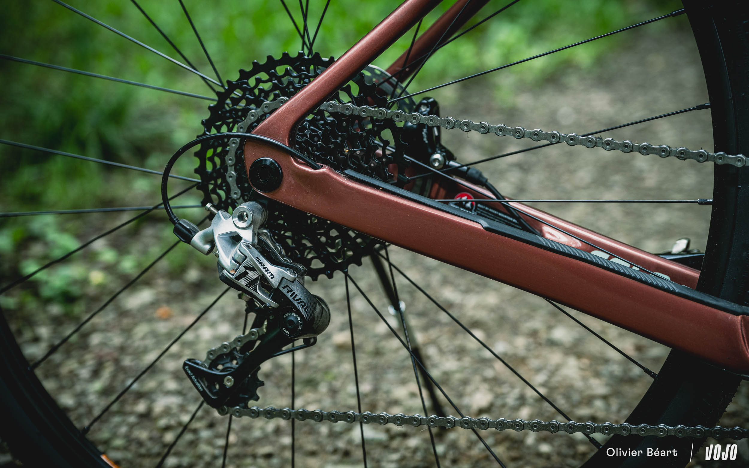 La transmission est en Sram Rival 1×11 mécanique avec cassette 10/42 et plateau de 42 dents à l’avant. Rien de fou, on le disait, mais ça fait le job de manière tout à fait correcte.