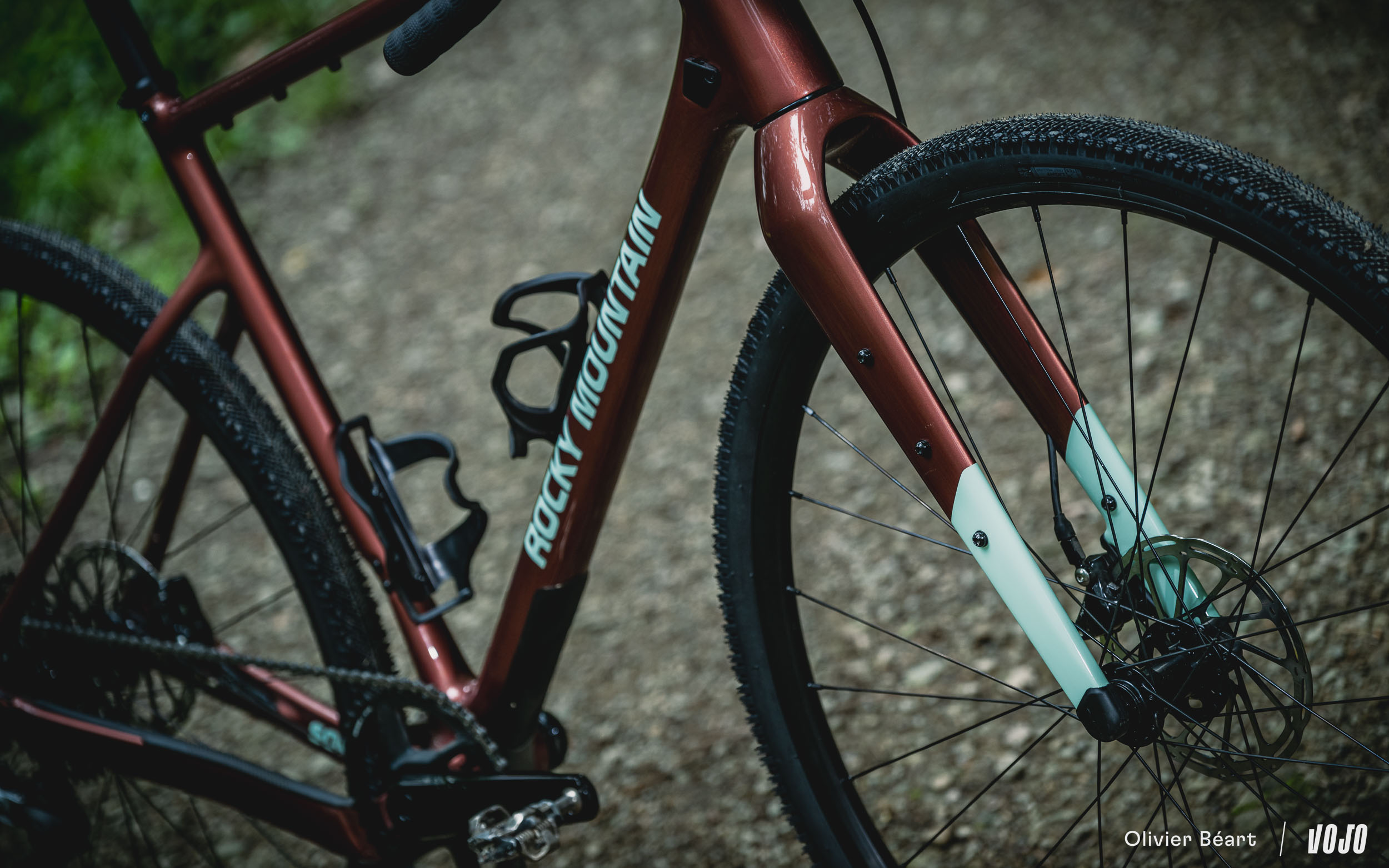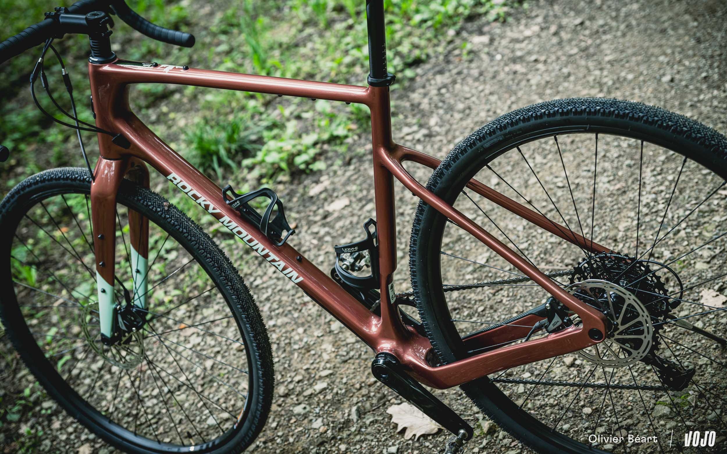 La jonction entre les haubans et le tube de selle est décalée vers le bas, pour ne pas être dans le prolongement du tube supérieur afin, là aussi, de procurer du flex et de filtrer les vibrations. Ce travail global pour procurer du confort et la polyvalence au niveau du choix de transmission sont quelques-uns des points qui montrent que Rocky Mountain a tenu à positionner son vélo comme taillé pour l’aventure et les longues sorties, plutôt qu’une machine visant la performance pure pour des courses gravel format UCI.