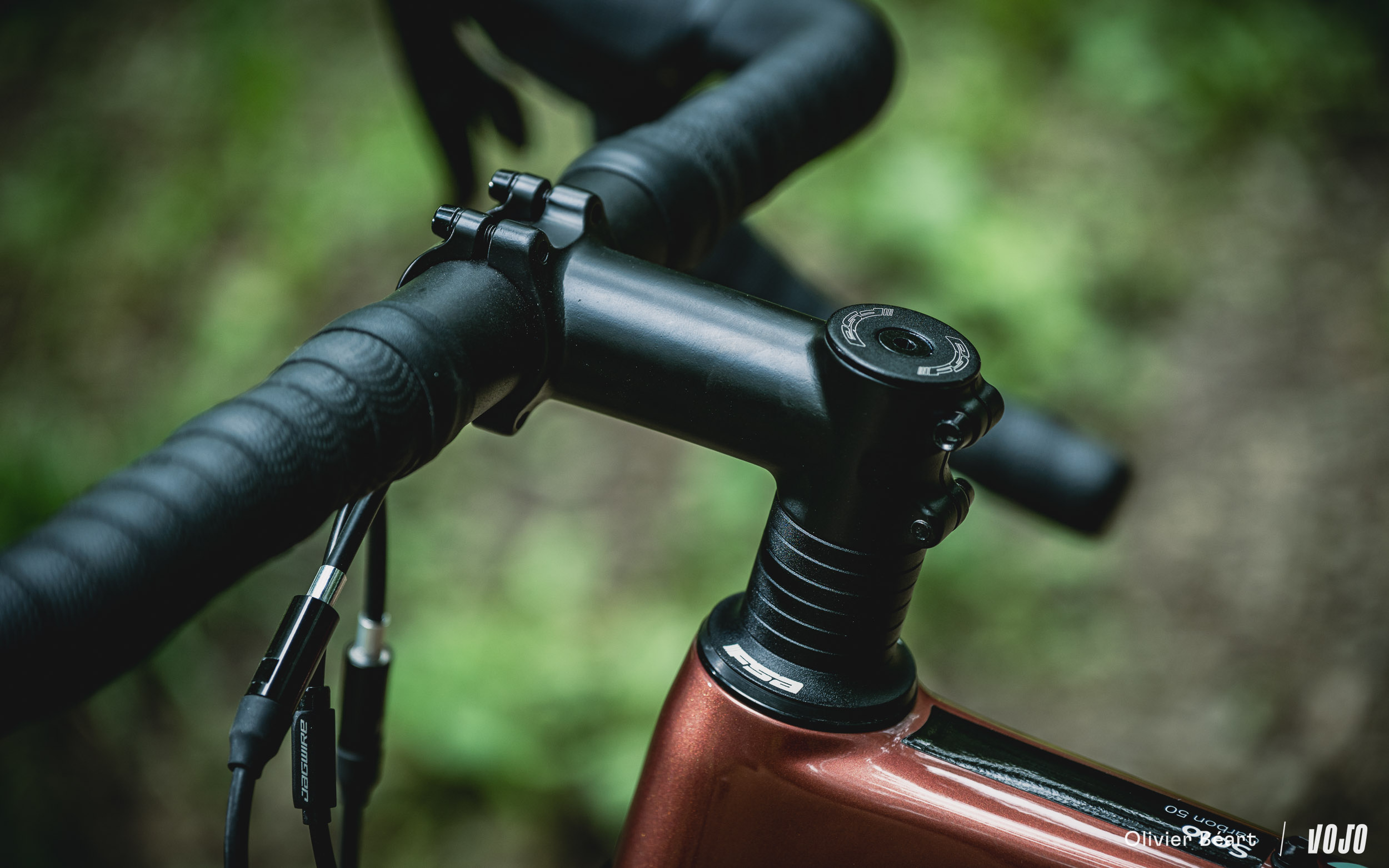 Pour le reste, le cadre est assez classique et offre un passage des câbles interne via des ouvertures percées de chaque côté du tube diagonal, et pas directement via le jeu de direction comme on le voit de plus en plus. Il y a la place pour ajouter un câble de tige de selle télescopique et le cadre est également compatible Di2. Tout comme le cadre, la fourche est entièrement en carbone et la fixation de l’étrier de frein se fait via une patte Postmount (alors qu’à l’arrière on est directement en Flat Mount).