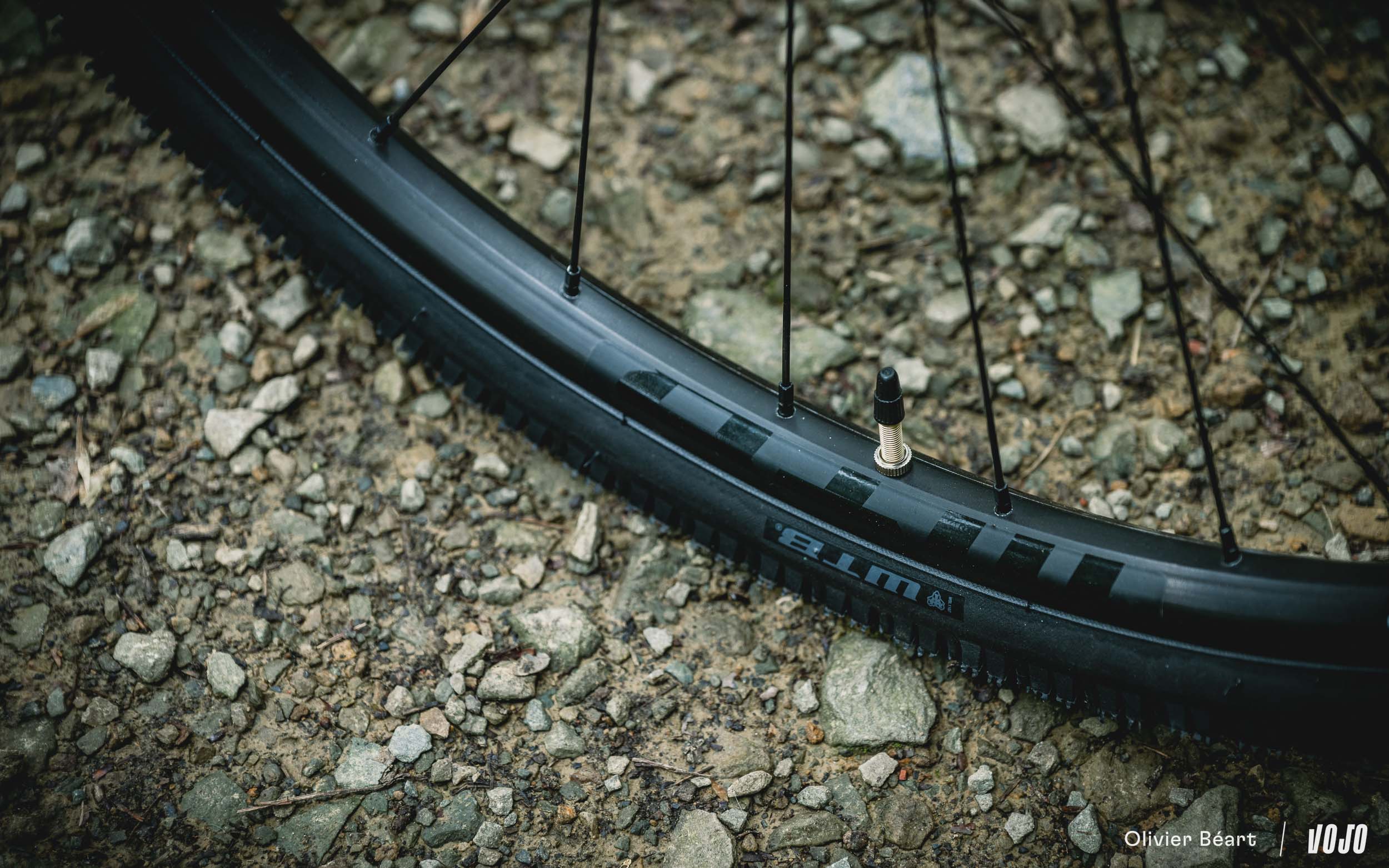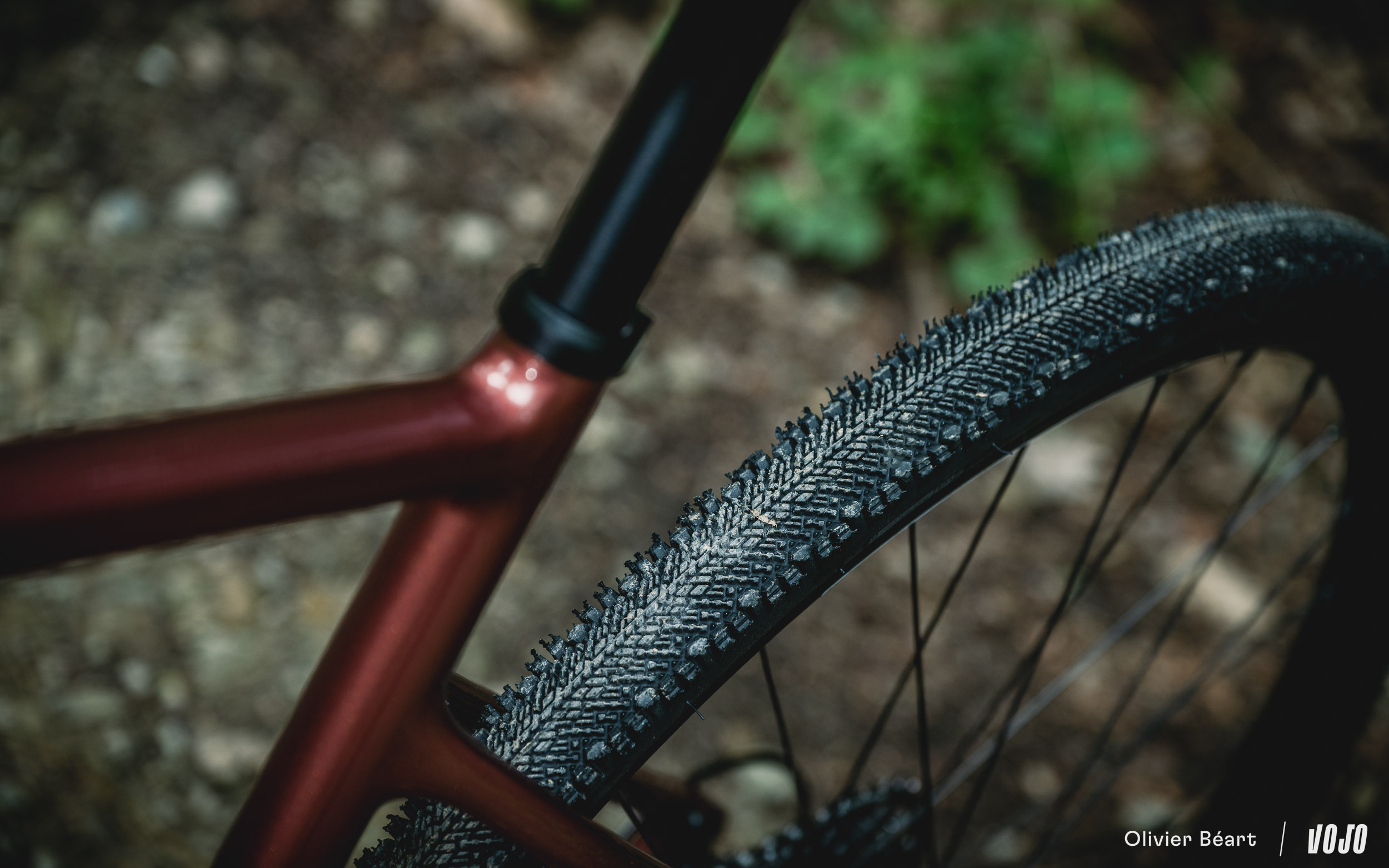 Les roues sont constituées de moyeux génériques à roulements annulaires associés à des jantes WTB ST Light i23 TCS compatibles tubeless. Ces jantes assez basses et d’une bonne largeur (23mm) sont prometteuses, mais hélas la paire de roues est tout de même assez lourde (près de 2kg). Les pneus proviennent aussi de chez WTB avec le modèle Venture en 40mm de large.